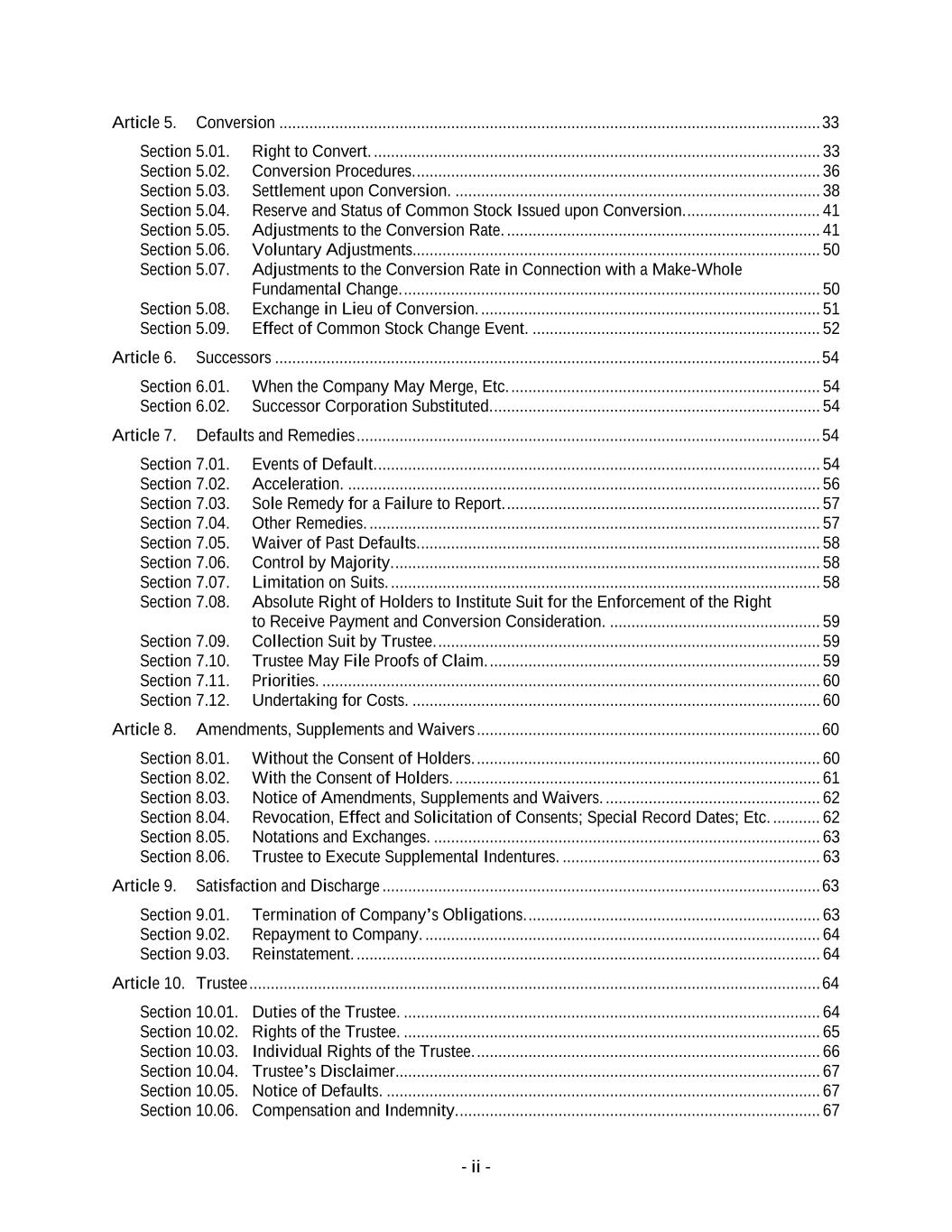 - ii - Article 5. Conversion .............................................................................................................................. 33 Section 5.01. Right to Convert. ........................................................................................................ 33 Section 5.02. Conversion Procedures. .............................................................................................. 36 Section 5.03. Settlement upon Conversion. ..................................................................................... 38 Section 5.04. Reserve and Status of Common Stock Issued upon Conversion. ............................... 41 Section 5.05. Adjustments to the Conversion Rate. ......................................................................... 41 Section 5.06. Voluntary Adjustments............................................................................................... 50 Section 5.07. Adjustments to the Conversion Rate in Connection with a Make-Whole Fundamental Change. ................................................................................................. 50 Section 5.08. Exchange in Lieu of Conversion. ............................................................................... 51 Section 5.09. Effect of Common Stock Change Event. ................................................................... 52 Article 6. Successors ............................................................................................................................... 54 Section 6.01. When the Company May Merge, Etc. ........................................................................ 54 Section 6.02. Successor Corporation Substituted. ............................................................................ 54 Article 7. Defaults and Remedies ............................................................................................................ 54 Section 7.01. Events of Default. ....................................................................................................... 54 Section 7.02. Acceleration. .............................................................................................................. 56 Section 7.03. Sole Remedy for a Failure to Report. ......................................................................... 57 Section 7.04. Other Remedies. ......................................................................................................... 57 Section 7.05. Waiver of Past Defaults. ............................................................................................. 58 Section 7.06. Control by Majority. ................................................................................................... 58 Section 7.07. Limitation on Suits. .................................................................................................... 58 Section 7.08. Absolute Right of Holders to Institute Suit for the Enforcement of the Right to Receive Payment and Conversion Consideration. ................................................. 59 Section 7.09. Collection Suit by Trustee. ......................................................................................... 59 Section 7.10. Trustee May File Proofs of Claim. ............................................................................. 59 Section 7.11. Priorities. .................................................................................................................... 60 Section 7.12. Undertaking for Costs. ............................................................................................... 60 Article 8. Amendments, Supplements and Waivers ................................................................................ 60 Section 8.01. Without the Consent of Holders. ................................................................................ 60 Section 8.02. With the Consent of Holders. ..................................................................................... 61 Section 8.03. Notice of Amendments, Supplements and Waivers. .................................................. 62 Section 8.04. Revocation, Effect and Solicitation of Consents; Special Record Dates; Etc. ........... 62 Section 8.05. Notations and Exchanges. .......................................................................................... 63 Section 8.06. Trustee to Execute Supplemental Indentures. ............................................................ 63 Article 9. Satisfaction and Discharge ...................................................................................................... 63 Section 9.01. Termination of Company’s Obligations. .................................................................... 63 Section 9.02. Repayment to Company. ............................................................................................ 64 Section 9.03. Reinstatement. ............................................................................................................ 64 Article 10. Trustee ..................................................................................................................................... 64 Section 10.01. Duties of the Trustee. ................................................................................................. 64 Section 10.02. Rights of the Trustee. ................................................................................................. 65 Section 10.03. Individual Rights of the Trustee. ................................................................................ 66 Section 10.04. Trustee’s Disclaimer................................................................................................... 67 Section 10.05. Notice of Defaults. ..................................................................................................... 67 Section 10.06. Compensation and Indemnity. ............................................................
