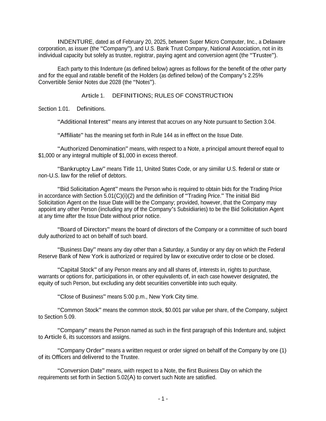 - 1 - INDENTURE, dated as of February 20, 2025, between Super Micro Computer, Inc., a Delaware corporation, as issuer (the “Company”), and U.S. Bank Trust Company, National Association, not in its individual capacity but solely as trustee, registrar, paying agent and conversion agent (the “Trustee”). Each party to this Indenture (as defined below) agrees as follows for the benefit of the other party and for the equal and ratable benefit of the Holders (as defined below) of the Company’s 2.25% Convertible Senior Notes due 2028 (the “Notes”). Article 1. DEFINITIONS; RULES OF CONSTRUCTION Section 1.01. Definitions. “Additional Interest” means any interest that accrues on any Note pursuant to Section 3.04. “Affiliate” has the meaning set forth in Rule 144 as in effect on the Issue Date. “Authorized Denomination” means, with respect to a Note, a principal amount thereof equal to $1,000 or any integral multiple of $1,000 in excess thereof. “Bankruptcy Law” means Title 11, United States Code, or any similar U.S. federal or state or non-U.S. law for the relief of debtors. “Bid Solicitation Agent” means the Person who is required to obtain bids for the Trading Price in accordance with Section 5.01(C)(i)(2) and the definition of “Trading Price.” The initial Bid Solicitation Agent on the Issue Date will be the Company; provided, however, that the Company may appoint any other Person (including any of the Company’s Subsidiaries) to be the Bid Solicitation Agent at any time after the Issue Date without prior notice. “Board of Directors” means the board of directors of the Company or a committee of such board duly authorized to act on behalf of such board. “Business Day” means any day other than a Saturday, a Sunday or any day on which the Federal Reserve Bank of New York is authorized or required by law or executive order to close or be closed. “Capital Stock” of any Person means any and all shares of, interests in, rights to purchase, warrants or options for, participations in, or other equivalents of, in each case however designated, the equity of such Person, but excluding any debt securities convertible into such equity. “Close of Business” means 5:00 p.m., New York City time. “Common Stock” means the common stock, $0.001 par value per share, of the Company, subject to Section 5.09. “Company” means the Person named as such in the first paragraph of this Indenture and, subject to Article 6, its successors and assigns. “Company Order” means a written request or order signed on behalf of the Company by one (1) of its Officers and delivered to the Trustee. “Conversion Date” means, with respect to a Note, the first Business Day on which the requirements set forth in Section 5.02(A) to convert such Note are satisfied.