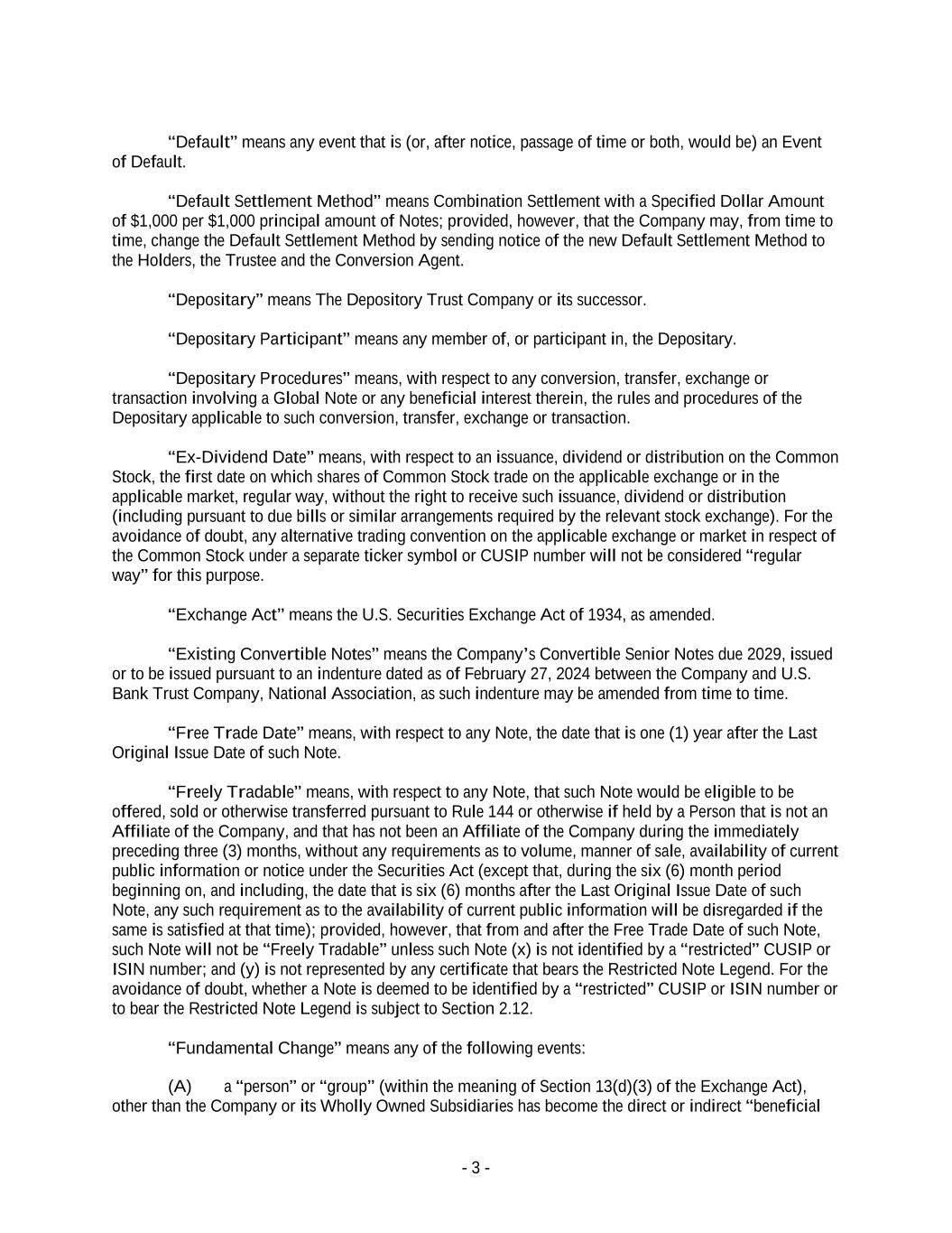 - 3 - “Default” means any event that is (or, after notice, passage of time or both, would be) an Event of Default. “Default Settlement Method” means Combination Settlement with a Specified Dollar Amount of $1,000 per $1,000 principal amount of Notes; provided, however, that the Company may, from time to time, change the Default Settlement Method by sending notice of the new Default Settlement Method to the Holders, the Trustee and the Conversion Agent. “Depositary” means The Depository Trust Company or its successor. “Depositary Participant” means any member of, or participant in, the Depositary. “Depositary Procedures” means, with respect to any conversion, transfer, exchange or transaction involving a Global Note or any beneficial interest therein, the rules and procedures of the Depositary applicable to such conversion, transfer, exchange or transaction. “Ex-Dividend Date” means, with respect to an issuance, dividend or distribution on the Common Stock, the first date on which shares of Common Stock trade on the applicable exchange or in the applicable market, regular way, without the right to receive such issuance, dividend or distribution (including pursuant to due bills or similar arrangements required by the relevant stock exchange). For the avoidance of doubt, any alternative trading convention on the applicable exchange or market in respect of the Common Stock under a separate ticker symbol or CUSIP number will not be considered “regular way” for this purpose. “Exchange Act” means the U.S. Securities Exchange Act of 1934, as amended. “Existing Convertible Notes” means the Company’s Convertible Senior Notes due 2029, issued or to be issued pursuant to an indenture dated as of February 27, 2024 between the Company and U.S. Bank Trust Company, National Association, as such indenture may be amended from time to time. “Free Trade Date” means, with respect to any Note, the date that is one (1) year after the Last Original Issue Date of such Note. “Freely Tradable” means, with respect to any Note, that such Note would be eligible to be offered, sold or otherwise transferred pursuant to Rule 144 or otherwise if held by a Person that is not an Affiliate of the Company, and that has not been an Affiliate of the Company during the immediately preceding three (3) months, without any requirements as to volume, manner of sale, availability of current public information or notice under the Securities Act (except that, during the six (6) month period beginning on, and including, the date that is six (6) months after the Last Original Issue Date of such Note, any such requirement as to the availability of current public information will be disregarded if the same is satisfied at that time); provided, however, that from and after the Free Trade Date of such Note, such Note will not be “Freely Tradable” unless such Note (x) is not identified by a “restricted” CUSIP or ISIN number; and (y) is not represented by any certificate that bears the Restricted Note Legend. For the avoidance of doubt, whether a Note is deemed to be identified by a “restricted” CUSIP or ISIN number or to bear the Restricted Note Legend is subject to Section 2.12. “Fundamental Change” means any of the following events: (A) a “person” or “group” (within the meaning of Section 13(d)(3) of the Exchange Act), other than the Company or its Wholly Owned Subsidiaries has become the direct or indirect “beneficial