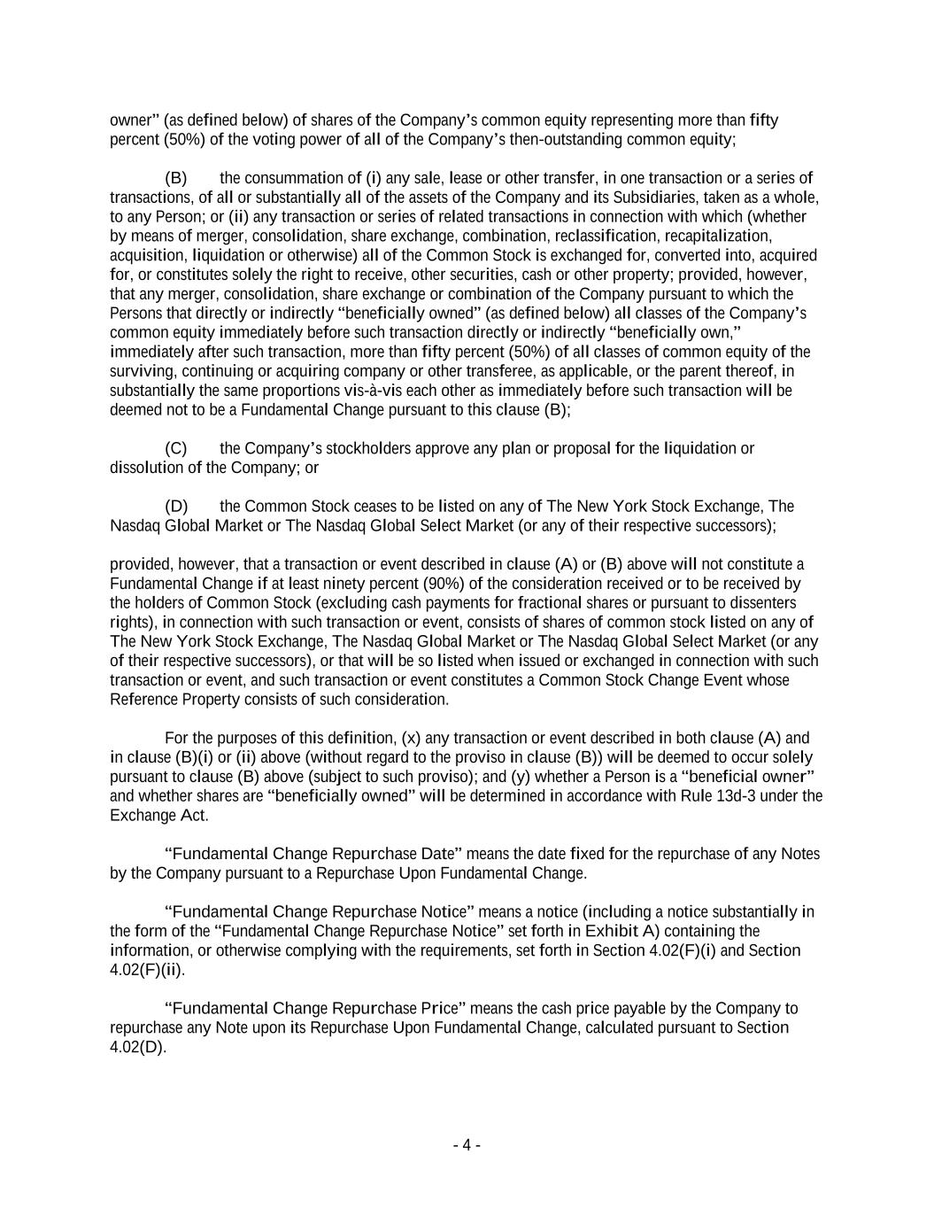 - 4 - owner” (as defined below) of shares of the Company’s common equity representing more than fifty percent (50%) of the voting power of all of the Company’s then-outstanding common equity; (B) the consummation of (i) any sale, lease or other transfer, in one transaction or a series of transactions, of all or substantially all of the assets of the Company and its Subsidiaries, taken as a whole, to any Person; or (ii) any transaction or series of related transactions in connection with which (whether by means of merger, consolidation, share exchange, combination, reclassification, recapitalization, acquisition, liquidation or otherwise) all of the Common Stock is exchanged for, converted into, acquired for, or constitutes solely the right to receive, other securities, cash or other property; provided, however, that any merger, consolidation, share exchange or combination of the Company pursuant to which the Persons that directly or indirectly “beneficially owned” (as defined below) all classes of the Company’s common equity immediately before such transaction directly or indirectly “beneficially own,” immediately after such transaction, more than fifty percent (50%) of all classes of common equity of the surviving, continuing or acquiring company or other transferee, as applicable, or the parent thereof, in substantially the same proportions vis-à-vis each other as immediately before such transaction will be deemed not to be a Fundamental Change pursuant to this clause (B); (C) the Company’s stockholders approve any plan or proposal for the liquidation or dissolution of the Company; or (D) the Common Stock ceases to be listed on any of The New York Stock Exchange, The Nasdaq Global Market or The Nasdaq Global Select Market (or any of their respective successors); provided, however, that a transaction or event described in clause (A) or (B) above will not constitute a Fundamental Change if at least ninety percent (90%) of the consideration received or to be received by the holders of Common Stock (excluding cash payments for fractional shares or pursuant to dissenters rights), in connection with such transaction or event, consists of shares of common stock listed on any of The New York Stock Exchange, The Nasdaq Global Market or The Nasdaq Global Select Market (or any of their respective successors), or that will be so listed when issued or exchanged in connection with such transaction or event, and such transaction or event constitutes a Common Stock Change Event whose Reference Property consists of such consideration. For the purposes of this definition, (x) any transaction or event described in both clause (A) and in clause (B)(i) or (ii) above (without regard to the proviso in clause (B)) will be deemed to occur solely pursuant to clause (B) above (subject to such proviso); and (y) whether a Person is a “beneficial owner” and whether shares are “beneficially owned” will be determined in accordance with Rule 13d-3 under the Exchange Act. “Fundamental Change Repurchase Date” means the date fixed for the repurchase of any Notes by the Company pursuant to a Repurchase Upon Fundamental Change. “Fundamental Change Repurchase Notice” means a notice (including a notice substantially in the form of the “Fundamental Change Repurchase Notice” set forth in Exhibit A) containing the information, or otherwise complying with the requirements, set forth in Section 4.02(F)(i) and Section 4.02(F)(ii). “Fundamental Change Repurchase Price” means the cash price payable by the Company to repurchase any Note upon its Repurchase Upon Fundamental Change, calculated pursuant to Section 4.02(D).
