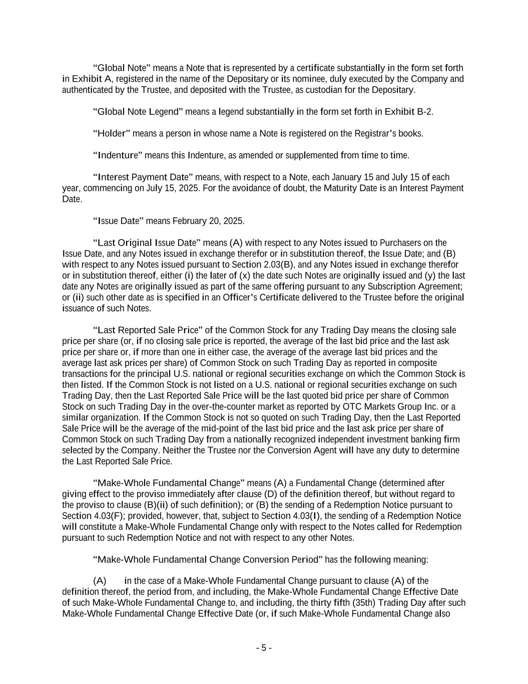 - 5 - “Global Note” means a Note that is represented by a certificate substantially in the form set forth in Exhibit A, registered in the name of the Depositary or its nominee, duly executed by the Company and authenticated by the Trustee, and deposited with the Trustee, as custodian for the Depositary. “Global Note Legend” means a legend substantially in the form set forth in Exhibit B-2. “Holder” means a person in whose name a Note is registered on the Registrar’s books. “Indenture” means this Indenture, as amended or supplemented from time to time. “Interest Payment Date” means, with respect to a Note, each January 15 and July 15 of each year, commencing on July 15, 2025. For the avoidance of doubt, the Maturity Date is an Interest Payment Date. “Issue Date” means February 20, 2025. “Last Original Issue Date” means (A) with respect to any Notes issued to Purchasers on the Issue Date, and any Notes issued in exchange therefor or in substitution thereof, the Issue Date; and (B) with respect to any Notes issued pursuant to Section 2.03(B), and any Notes issued in exchange therefor or in substitution thereof, either (i) the later of (x) the date such Notes are originally issued and (y) the last date any Notes are originally issued as part of the same offering pursuant to any Subscription Agreement; or (ii) such other date as is specified in an Officer’s Certificate delivered to the Trustee before the original issuance of such Notes. “Last Reported Sale Price” of the Common Stock for any Trading Day means the closing sale price per share (or, if no closing sale price is reported, the average of the last bid price and the last ask price per share or, if more than one in either case, the average of the average last bid prices and the average last ask prices per share) of Common Stock on such Trading Day as reported in composite transactions for the principal U.S. national or regional securities exchange on which the Common Stock is then listed. If the Common Stock is not listed on a U.S. national or regional securities exchange on such Trading Day, then the Last Reported Sale Price will be the last quoted bid price per share of Common Stock on such Trading Day in the over-the-counter market as reported by OTC Markets Group Inc. or a similar organization. If the Common Stock is not so quoted on such Trading Day, then the Last Reported Sale Price will be the average of the mid-point of the last bid price and the last ask price per share of Common Stock on such Trading Day from a nationally recognized independent investment banking firm selected by the Company. Neither the Trustee nor the Conversion Agent will have any duty to determine the Last Reported Sale Price. “Make-Whole Fundamental Change” means (A) a Fundamental Change (determined after giving effect to the proviso immediately after clause (D) of the definition thereof, but without regard to the proviso to clause (B)(ii) of such definition); or (B) the sending of a Redemption Notice pursuant to Section 4.03(F); provided, however, that, subject to Section 4.03(I), the sending of a Redemption Notice will constitute a Make-Whole Fundamental Change only with respect to the Notes called for Redemption pursuant to such Redemption Notice and not with respect to any other Notes. “Make-Whole Fundamental Change Conversion Period” has the following meaning: (A) in the case of a Make-Whole Fundamental Change pursuant to clause (A) of the definition thereof, the period from, and including, the Make-Whole Fundamental Change Effective Date of such Make-Whole Fundamental Change to, and including, the thirty fifth (35th) Trading Day after such Make-Whole Fundamental Change Effective Date (or, if such Make-Whole Fundamental Change also