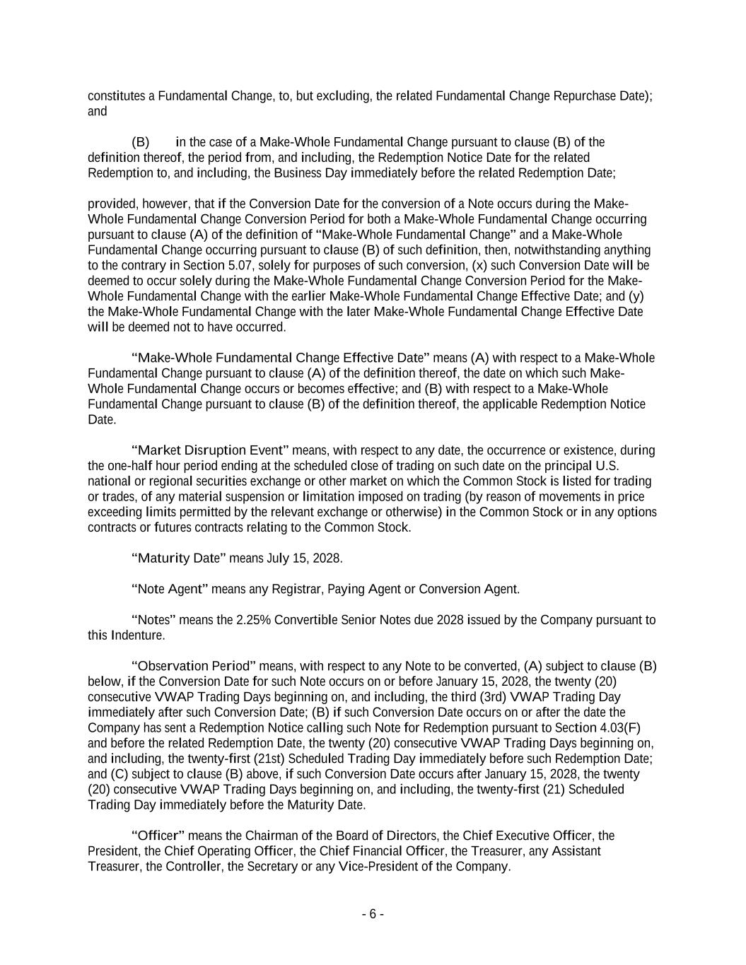 - 6 - constitutes a Fundamental Change, to, but excluding, the related Fundamental Change Repurchase Date); and (B) in the case of a Make-Whole Fundamental Change pursuant to clause (B) of the definition thereof, the period from, and including, the Redemption Notice Date for the related Redemption to, and including, the Business Day immediately before the related Redemption Date; provided, however, that if the Conversion Date for the conversion of a Note occurs during the Make- Whole Fundamental Change Conversion Period for both a Make-Whole Fundamental Change occurring pursuant to clause (A) of the definition of “Make-Whole Fundamental Change” and a Make-Whole Fundamental Change occurring pursuant to clause (B) of such definition, then, notwithstanding anything to the contrary in Section 5.07, solely for purposes of such conversion, (x) such Conversion Date will be deemed to occur solely during the Make-Whole Fundamental Change Conversion Period for the Make- Whole Fundamental Change with the earlier Make-Whole Fundamental Change Effective Date; and (y) the Make-Whole Fundamental Change with the later Make-Whole Fundamental Change Effective Date will be deemed not to have occurred. “Make-Whole Fundamental Change Effective Date” means (A) with respect to a Make-Whole Fundamental Change pursuant to clause (A) of the definition thereof, the date on which such Make- Whole Fundamental Change occurs or becomes effective; and (B) with respect to a Make-Whole Fundamental Change pursuant to clause (B) of the definition thereof, the applicable Redemption Notice Date. “Market Disruption Event” means, with respect to any date, the occurrence or existence, during the one-half hour period ending at the scheduled close of trading on such date on the principal U.S. national or regional securities exchange or other market on which the Common Stock is listed for trading or trades, of any material suspension or limitation imposed on trading (by reason of movements in price exceeding limits permitted by the relevant exchange or otherwise) in the Common Stock or in any options contracts or futures contracts relating to the Common Stock. “Maturity Date” means July 15, 2028. “Note Agent” means any Registrar, Paying Agent or Conversion Agent. “Notes” means the 2.25% Convertible Senior Notes due 2028 issued by the Company pursuant to this Indenture. “Observation Period” means, with respect to any Note to be converted, (A) subject to clause (B) below, if the Conversion Date for such Note occurs on or before January 15, 2028, the twenty (20) consecutive VWAP Trading Days beginning on, and including, the third (3rd) VWAP Trading Day immediately after such Conversion Date; (B) if such Conversion Date occurs on or after the date the Company has sent a Redemption Notice calling such Note for Redemption pursuant to Section 4.03(F) and before the related Redemption Date, the twenty (20) consecutive VWAP Trading Days beginning on, and including, the twenty-first (21st) Scheduled Trading Day immediately before such Redemption Date; and (C) subject to clause (B) above, if such Conversion Date occurs after January 15, 2028, the twenty (20) consecutive VWAP Trading Days beginning on, and including, the twenty-first (21) Scheduled Trading Day immediately before the Maturity Date. “Officer” means the Chairman of the Board of Directors, the Chief Executive Officer, the President, the Chief Operating Officer, the Chief Financial Officer, the Treasurer, any Assistant Treasurer, the Controller, the Secretary or any Vice-President of the Company.