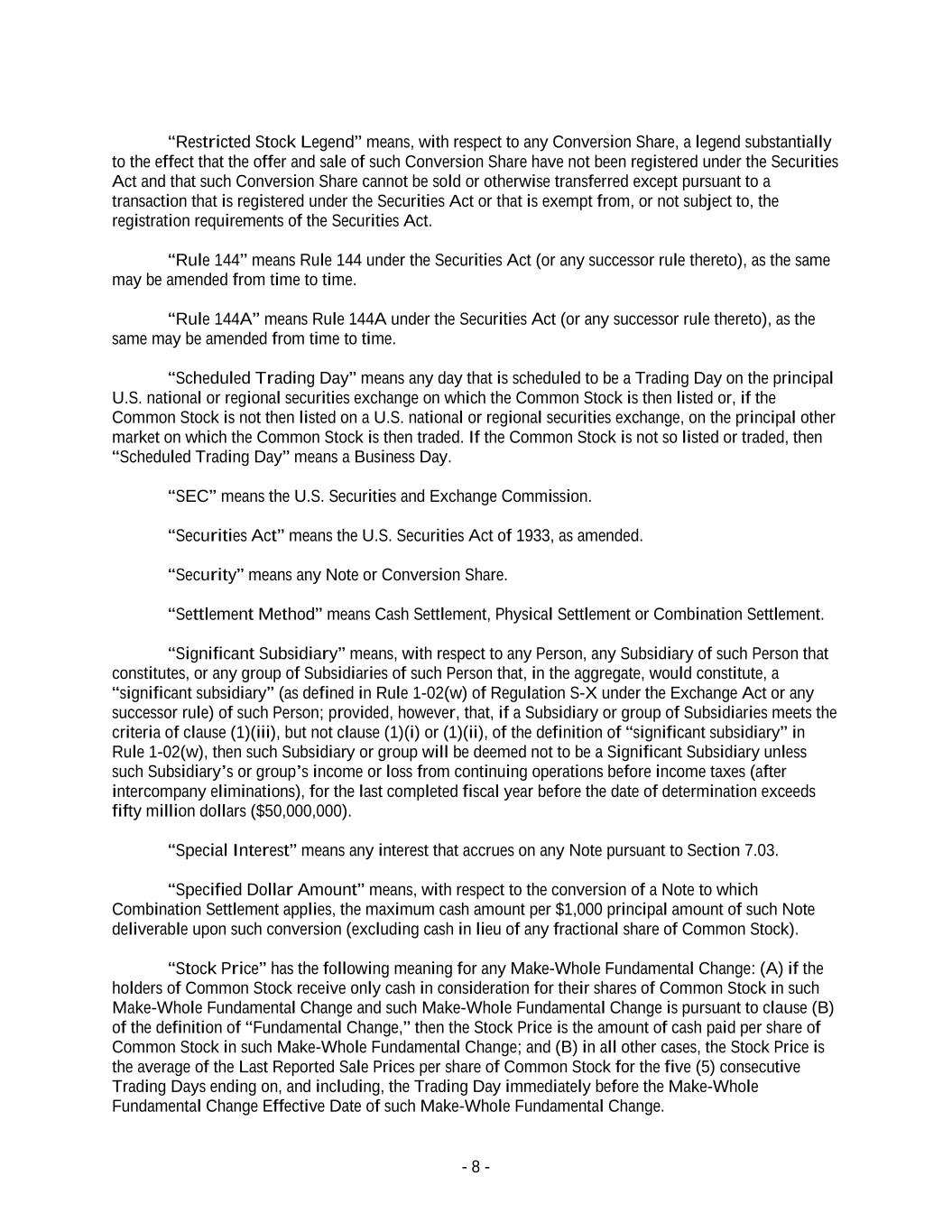 - 8 - “Restricted Stock Legend” means, with respect to any Conversion Share, a legend substantially to the effect that the offer and sale of such Conversion Share have not been registered under the Securities Act and that such Conversion Share cannot be sold or otherwise transferred except pursuant to a transaction that is registered under the Securities Act or that is exempt from, or not subject to, the registration requirements of the Securities Act. “Rule 144” means Rule 144 under the Securities Act (or any successor rule thereto), as the same may be amended from time to time. “Rule 144A” means Rule 144A under the Securities Act (or any successor rule thereto), as the same may be amended from time to time. “Scheduled Trading Day” means any day that is scheduled to be a Trading Day on the principal U.S. national or regional securities exchange on which the Common Stock is then listed or, if the Common Stock is not then listed on a U.S. national or regional securities exchange, on the principal other market on which the Common Stock is then traded. If the Common Stock is not so listed or traded, then “Scheduled Trading Day” means a Business Day. “SEC” means the U.S. Securities and Exchange Commission. “Securities Act” means the U.S. Securities Act of 1933, as amended. “Security” means any Note or Conversion Share. “Settlement Method” means Cash Settlement, Physical Settlement or Combination Settlement. “Significant Subsidiary” means, with respect to any Person, any Subsidiary of such Person that constitutes, or any group of Subsidiaries of such Person that, in the aggregate, would constitute, a “significant subsidiary” (as defined in Rule 1-02(w) of Regulation S-X under the Exchange Act or any successor rule) of such Person; provided, however, that, if a Subsidiary or group of Subsidiaries meets the criteria of clause (1)(iii), but not clause (1)(i) or (1)(ii), of the definition of “significant subsidiary” in Rule 1-02(w), then such Subsidiary or group will be deemed not to be a Significant Subsidiary unless such Subsidiary’s or group’s income or loss from continuing operations before income taxes (after intercompany eliminations), for the last completed fiscal year before the date of determination exceeds fifty million dollars ($50,000,000). “Special Interest” means any interest that accrues on any Note pursuant to Section 7.03. “Specified Dollar Amount” means, with respect to the conversion of a Note to which Combination Settlement applies, the maximum cash amount per $1,000 principal amount of such Note deliverable upon such conversion (excluding cash in lieu of any fractional share of Common Stock). “Stock Price” has the following meaning for any Make-Whole Fundamental Change: (A) if the holders of Common Stock receive only cash in consideration for their shares of Common Stock in such Make-Whole Fundamental Change and such Make-Whole Fundamental Change is pursuant to clause (B) of the definition of “Fundamental Change,” then the Stock Price is the amount of cash paid per share of Common Stock in such Make-Whole Fundamental Change; and (B) in all other cases, the Stock Price is the average of the Last Reported Sale Prices per share of Common Stock for the five (5) consecutive Trading Days ending on, and including, the Trading Day immediately before the Make-Whole Fundamental Change Effective Date of such Make-Whole Fundamental Change.