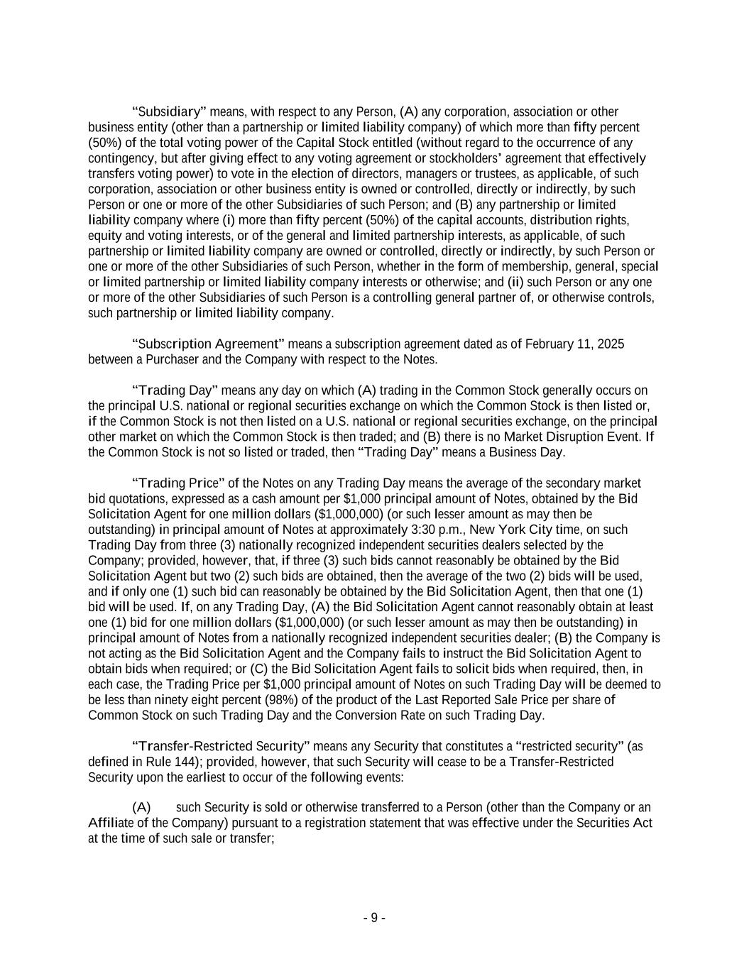 - 9 - “Subsidiary” means, with respect to any Person, (A) any corporation, association or other business entity (other than a partnership or limited liability company) of which more than fifty percent (50%) of the total voting power of the Capital Stock entitled (without regard to the occurrence of any contingency, but after giving effect to any voting agreement or stockholders’ agreement that effectively transfers voting power) to vote in the election of directors, managers or trustees, as applicable, of such corporation, association or other business entity is owned or controlled, directly or indirectly, by such Person or one or more of the other Subsidiaries of such Person; and (B) any partnership or limited liability company where (i) more than fifty percent (50%) of the capital accounts, distribution rights, equity and voting interests, or of the general and limited partnership interests, as applicable, of such partnership or limited liability company are owned or controlled, directly or indirectly, by such Person or one or more of the other Subsidiaries of such Person, whether in the form of membership, general, special or limited partnership or limited liability company interests or otherwise; and (ii) such Person or any one or more of the other Subsidiaries of such Person is a controlling general partner of, or otherwise controls, such partnership or limited liability company. “Subscription Agreement” means a subscription agreement dated as of February 11, 2025 between a Purchaser and the Company with respect to the Notes. “Trading Day” means any day on which (A) trading in the Common Stock generally occurs on the principal U.S. national or regional securities exchange on which the Common Stock is then listed or, if the Common Stock is not then listed on a U.S. national or regional securities exchange, on the principal other market on which the Common Stock is then traded; and (B) there is no Market Disruption Event. If the Common Stock is not so listed or traded, then “Trading Day” means a Business Day. “Trading Price” of the Notes on any Trading Day means the average of the secondary market bid quotations, expressed as a cash amount per $1,000 principal amount of Notes, obtained by the Bid Solicitation Agent for one million dollars ($1,000,000) (or such lesser amount as may then be outstanding) in principal amount of Notes at approximately 3:30 p.m., New York City time, on such Trading Day from three (3) nationally recognized independent securities dealers selected by the Company; provided, however, that, if three (3) such bids cannot reasonably be obtained by the Bid Solicitation Agent but two (2) such bids are obtained, then the average of the two (2) bids will be used, and if only one (1) such bid can reasonably be obtained by the Bid Solicitation Agent, then that one (1) bid will be used. If, on any Trading Day, (A) the Bid Solicitation Agent cannot reasonably obtain at least one (1) bid for one million dollars ($1,000,000) (or such lesser amount as may then be outstanding) in principal amount of Notes from a nationally recognized independent securities dealer; (B) the Company is not acting as the Bid Solicitation Agent and the Company fails to instruct the Bid Solicitation Agent to obtain bids when required; or (C) the Bid Solicitation Agent fails to solicit bids when required, then, in each case, the Trading Price per $1,000 principal amount of Notes on such Trading Day will be deemed to be less than ninety eight percent (98%) of the product of the Last Reported Sale Price per share of Common Stock on such Trading Day and the Conversion Rate on such Trading Day. “Transfer-Restricted Security” means any Security that constitutes a “restricted security” (as defined in Rule 144); provided, however, that such Security will cease to be a Transfer-Restricted Security upon the earliest to occur of the following events: (A) such Security is sold or otherwise transferred to a Person (other than the Company or an Affiliate of the Company) pursuant to a registration statement that was effective under the Securities Act at the time of such sale or transfer;