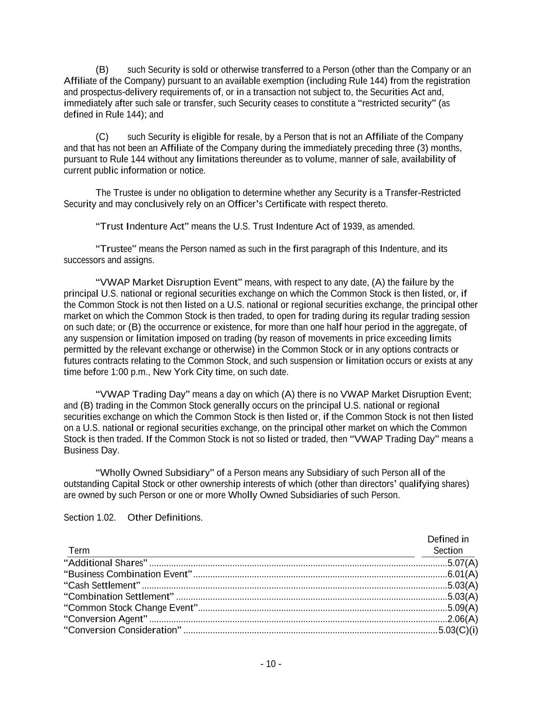 - 10 - (B) such Security is sold or otherwise transferred to a Person (other than the Company or an Affiliate of the Company) pursuant to an available exemption (including Rule 144) from the registration and prospectus-delivery requirements of, or in a transaction not subject to, the Securities Act and, immediately after such sale or transfer, such Security ceases to constitute a “restricted security” (as defined in Rule 144); and (C) such Security is eligible for resale, by a Person that is not an Affiliate of the Company and that has not been an Affiliate of the Company during the immediately preceding three (3) months, pursuant to Rule 144 without any limitations thereunder as to volume, manner of sale, availability of current public information or notice. The Trustee is under no obligation to determine whether any Security is a Transfer-Restricted Security and may conclusively rely on an Officer’s Certificate with respect thereto. “Trust Indenture Act” means the U.S. Trust Indenture Act of 1939, as amended. “Trustee” means the Person named as such in the first paragraph of this Indenture, and its successors and assigns. “VWAP Market Disruption Event” means, with respect to any date, (A) the failure by the principal U.S. national or regional securities exchange on which the Common Stock is then listed, or, if the Common Stock is not then listed on a U.S. national or regional securities exchange, the principal other market on which the Common Stock is then traded, to open for trading during its regular trading session on such date; or (B) the occurrence or existence, for more than one half hour period in the aggregate, of any suspension or limitation imposed on trading (by reason of movements in price exceeding limits permitted by the relevant exchange or otherwise) in the Common Stock or in any options contracts or futures contracts relating to the Common Stock, and such suspension or limitation occurs or exists at any time before 1:00 p.m., New York City time, on such date. “VWAP Trading Day” means a day on which (A) there is no VWAP Market Disruption Event; and (B) trading in the Common Stock generally occurs on the principal U.S. national or regional securities exchange on which the Common Stock is then listed or, if the Common Stock is not then listed on a U.S. national or regional securities exchange, on the principal other market on which the Common Stock is then traded. If the Common Stock is not so listed or traded, then “VWAP Trading Day” means a Business Day. “Wholly Owned Subsidiary” of a Person means any Subsidiary of such Person all of the outstanding Capital Stock or other ownership interests of which (other than directors’ qualifying shares) are owned by such Person or one or more Wholly Owned Subsidiaries of such Person. Section 1.02. Other Definitions. Term Defined in Section “Additional Shares” .......................................................................................................................... 5.07(A) “Business Combination Event” ........................................................................................................ 6.01(A) “Cash Settlement” ............................................................................................................................. 5.03(A) “Combination Settlement” ............................................................................................................... 5.03(A) “Common Stock Change Event” ...................................................................................................... 5.09(A) “Conversion Agent” .......................................................................................................................... 2.06(A) “Conversion Consideration” ........................................................................................................ 5.03(C)(i)