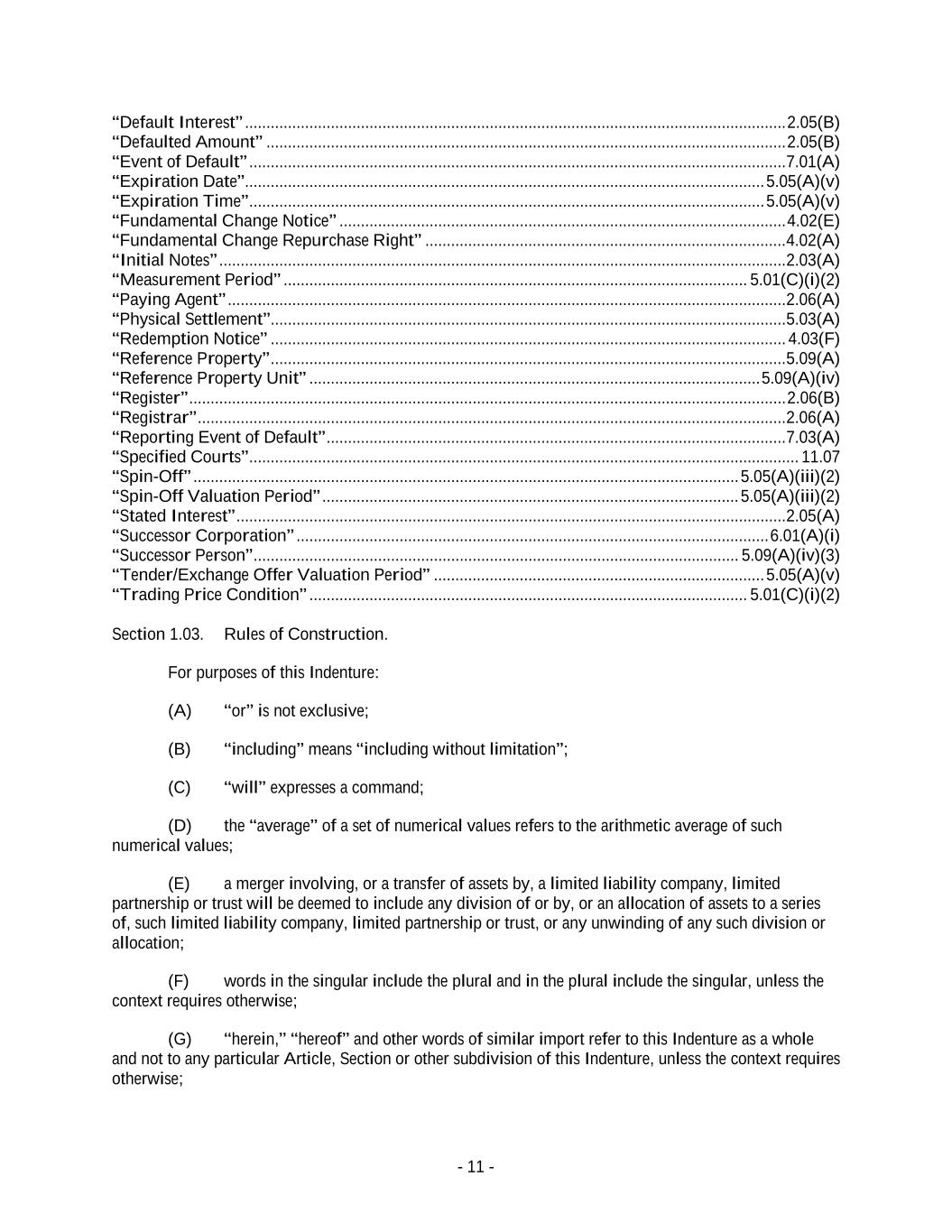 - 11 - “Default Interest” .............................................................................................................................. 2.05(B) “Defaulted Amount” ......................................................................................................................... 2.05(B) “Event of Default” ............................................................................................................................. 7.01(A) “Expiration Date” ......................................................................................................................... 5.05(A)(v) “Expiration Time” ........................................................................................................................ 5.05(A)(v) “Fundamental Change Notice” ........................................................................................................ 4.02(E) “Fundamental Change Repurchase Right” .................................................................................... 4.02(A) “Initial Notes” .................................................................................................................................... 2.03(A) “Measurement Period” ............................................................................................................ 5.01(C)(i)(2) “Paying Agent” .................................................................................................................................. 2.06(A) “Physical Settlement” ........................................................................................................................ 5.03(A) “Redemption Notice” ........................................................................................................................ 4.03(F) “Reference Property” ........................................................................................................................ 5.09(A) “Reference Property Unit” ......................................................................................................... 5.09(A)(iv) “Register” ........................................................................................................................................... 2.06(B) “Registrar” ......................................................................................................................................... 2.06(A) “Reporting Event of Default” ........................................................................................................... 7.03(A) “Specified Courts” ................................................................................................................................ 11.07 “Spin-Off” ............................................................................................................................... 5.05(A)(iii)(2) “Spin-Off Valuation Period” ................................................................................................. 5.05(A)(iii)(2) “Stated Interest” ................................................................................................................................ 2.05(A) “Successor Corporation” .............................................................................................................. 6.01(A)(i) “Successor Person” ................................................................................................................. 5.09(A)(iv)(3) “Tender/Exchange Offer Valuation Period” ............................................................................. 5.05(A)(v) “Trading Price Condition” ...................................................................................................... 5.01(C)(i)(2) Section 1.03. Rules of Construction. For purposes of this Indenture: (A) “or” is not exclusive; (B) “including” means “including without limitation”; (C) “will” expresses a command; (D) the “average” of a set of numerical values refers to the arithmetic average of such numerical values; (E) a merger involving, or a transfer of assets by, a limited liability company, limited partnership or trust will be deemed to include any division of or by, or an allocation of assets to a series of, such limited liability company, limited partnership or trust, or any unwinding of any such division or allocation; (F) words in the singular include the plural and in the plural include the singular, unless the context requires otherwise; (G) “herein,” “hereof” and other words of similar import refer to this Indenture as a whole and not to any particular Article, Section or other subdivision of this Indenture, unless the context requires otherwise;