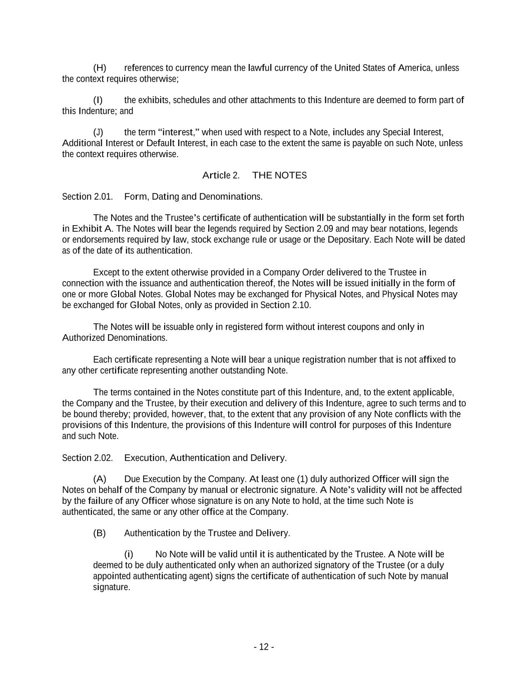 - 12 - (H) references to currency mean the lawful currency of the United States of America, unless the context requires otherwise; (I) the exhibits, schedules and other attachments to this Indenture are deemed to form part of this Indenture; and (J) the term “interest,” when used with respect to a Note, includes any Special Interest, Additional Interest or Default Interest, in each case to the extent the same is payable on such Note, unless the context requires otherwise. Article 2. THE NOTES Section 2.01. Form, Dating and Denominations. The Notes and the Trustee’s certificate of authentication will be substantially in the form set forth in Exhibit A. The Notes will bear the legends required by Section 2.09 and may bear notations, legends or endorsements required by law, stock exchange rule or usage or the Depositary. Each Note will be dated as of the date of its authentication. Except to the extent otherwise provided in a Company Order delivered to the Trustee in connection with the issuance and authentication thereof, the Notes will be issued initially in the form of one or more Global Notes. Global Notes may be exchanged for Physical Notes, and Physical Notes may be exchanged for Global Notes, only as provided in Section 2.10. The Notes will be issuable only in registered form without interest coupons and only in Authorized Denominations. Each certificate representing a Note will bear a unique registration number that is not affixed to any other certificate representing another outstanding Note. The terms contained in the Notes constitute part of this Indenture, and, to the extent applicable, the Company and the Trustee, by their execution and delivery of this Indenture, agree to such terms and to be bound thereby; provided, however, that, to the extent that any provision of any Note conflicts with the provisions of this Indenture, the provisions of this Indenture will control for purposes of this Indenture and such Note. Section 2.02. Execution, Authentication and Delivery. (A) Due Execution by the Company. At least one (1) duly authorized Officer will sign the Notes on behalf of the Company by manual or electronic signature. A Note’s validity will not be affected by the failure of any Officer whose signature is on any Note to hold, at the time such Note is authenticated, the same or any other office at the Company. (B) Authentication by the Trustee and Delivery. (i) No Note will be valid until it is authenticated by the Trustee. A Note will be deemed to be duly authenticated only when an authorized signatory of the Trustee (or a duly appointed authenticating agent) signs the certificate of authentication of such Note by manual signature.