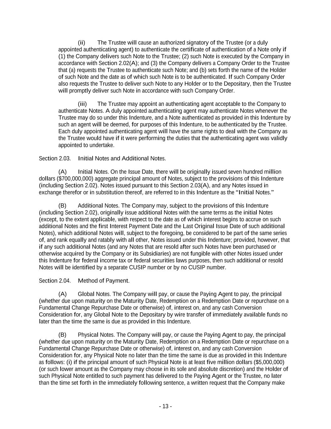 - 13 - (ii) The Trustee will cause an authorized signatory of the Trustee (or a duly appointed authenticating agent) to authenticate the certificate of authentication of a Note only if (1) the Company delivers such Note to the Trustee; (2) such Note is executed by the Company in accordance with Section 2.02(A); and (3) the Company delivers a Company Order to the Trustee that (a) requests the Trustee to authenticate such Note; and (b) sets forth the name of the Holder of such Note and the date as of which such Note is to be authenticated. If such Company Order also requests the Trustee to deliver such Note to any Holder or to the Depositary, then the Trustee will promptly deliver such Note in accordance with such Company Order. (iii) The Trustee may appoint an authenticating agent acceptable to the Company to authenticate Notes. A duly appointed authenticating agent may authenticate Notes whenever the Trustee may do so under this Indenture, and a Note authenticated as provided in this Indenture by such an agent will be deemed, for purposes of this Indenture, to be authenticated by the Trustee. Each duly appointed authenticating agent will have the same rights to deal with the Company as the Trustee would have if it were performing the duties that the authenticating agent was validly appointed to undertake. Section 2.03. Initial Notes and Additional Notes. (A) Initial Notes. On the Issue Date, there will be originally issued seven hundred million dollars ($700,000,000) aggregate principal amount of Notes, subject to the provisions of this Indenture (including Section 2.02). Notes issued pursuant to this Section 2.03(A), and any Notes issued in exchange therefor or in substitution thereof, are referred to in this Indenture as the “Initial Notes.” (B) Additional Notes. The Company may, subject to the provisions of this Indenture (including Section 2.02), originally issue additional Notes with the same terms as the initial Notes (except, to the extent applicable, with respect to the date as of which interest begins to accrue on such additional Notes and the first Interest Payment Date and the Last Original Issue Date of such additional Notes), which additional Notes will, subject to the foregoing, be considered to be part of the same series of, and rank equally and ratably with all other, Notes issued under this Indenture; provided, however, that if any such additional Notes (and any Notes that are resold after such Notes have been purchased or otherwise acquired by the Company or its Subsidiaries) are not fungible with other Notes issued under this Indenture for federal income tax or federal securities laws purposes, then such additional or resold Notes will be identified by a separate CUSIP number or by no CUSIP number. Section 2.04. Method of Payment. (A) Global Notes. The Company will pay, or cause the Paying Agent to pay, the principal (whether due upon maturity on the Maturity Date, Redemption on a Redemption Date or repurchase on a Fundamental Change Repurchase Date or otherwise) of, interest on, and any cash Conversion Consideration for, any Global Note to the Depositary by wire transfer of immediately available funds no later than the time the same is due as provided in this Indenture. (B) Physical Notes. The Company will pay, or cause the Paying Agent to pay, the principal (whether due upon maturity on the Maturity Date, Redemption on a Redemption Date or repurchase on a Fundamental Change Repurchase Date or otherwise) of, interest on, and any cash Conversion Consideration for, any Physical Note no later than the time the same is due as provided in this Indenture as follows: (i) if the principal amount of such Physical Note is at least five million dollars ($5,000,000) (or such lower amount as the Company may choose in its sole and absolute discretion) and the Holder of such Physical Note entitled to such payment has delivered to the Paying Agent or the Trustee, no later than the time set forth in the immediately following sentence, a written request that the Company make