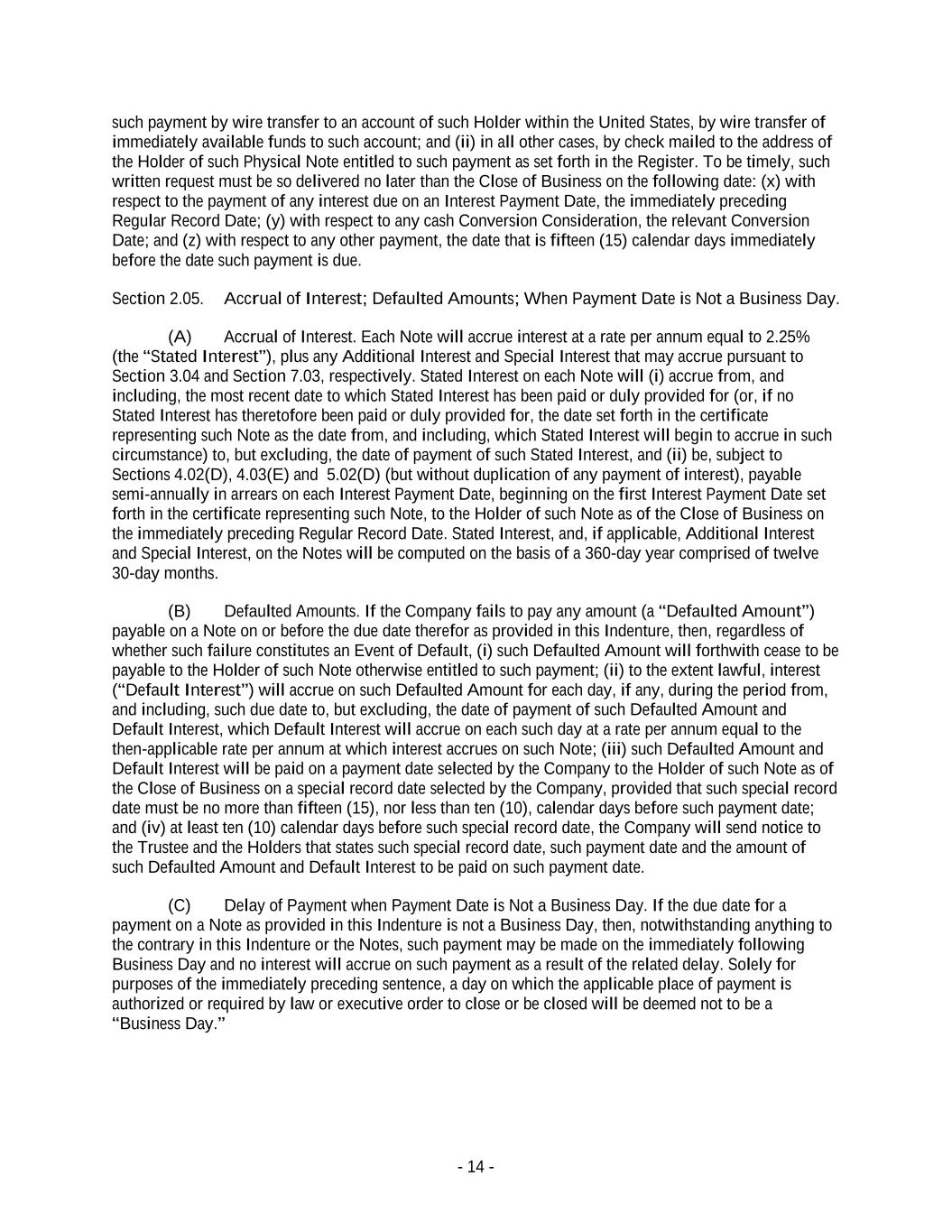 - 14 - such payment by wire transfer to an account of such Holder within the United States, by wire transfer of immediately available funds to such account; and (ii) in all other cases, by check mailed to the address of the Holder of such Physical Note entitled to such payment as set forth in the Register. To be timely, such written request must be so delivered no later than the Close of Business on the following date: (x) with respect to the payment of any interest due on an Interest Payment Date, the immediately preceding Regular Record Date; (y) with respect to any cash Conversion Consideration, the relevant Conversion Date; and (z) with respect to any other payment, the date that is fifteen (15) calendar days immediately before the date such payment is due. Section 2.05. Accrual of Interest; Defaulted Amounts; When Payment Date is Not a Business Day. (A) Accrual of Interest. Each Note will accrue interest at a rate per annum equal to 2.25% (the “Stated Interest”), plus any Additional Interest and Special Interest that may accrue pursuant to Section 3.04 and Section 7.03, respectively. Stated Interest on each Note will (i) accrue from, and including, the most recent date to which Stated Interest has been paid or duly provided for (or, if no Stated Interest has theretofore been paid or duly provided for, the date set forth in the certificate representing such Note as the date from, and including, which Stated Interest will begin to accrue in such circumstance) to, but excluding, the date of payment of such Stated Interest, and (ii) be, subject to Sections 4.02(D), 4.03(E) and 5.02(D) (but without duplication of any payment of interest), payable semi-annually in arrears on each Interest Payment Date, beginning on the first Interest Payment Date set forth in the certificate representing such Note, to the Holder of such Note as of the Close of Business on the immediately preceding Regular Record Date. Stated Interest, and, if applicable, Additional Interest and Special Interest, on the Notes will be computed on the basis of a 360-day year comprised of twelve 30-day months. (B) Defaulted Amounts. If the Company fails to pay any amount (a “Defaulted Amount”) payable on a Note on or before the due date therefor as provided in this Indenture, then, regardless of whether such failure constitutes an Event of Default, (i) such Defaulted Amount will forthwith cease to be payable to the Holder of such Note otherwise entitled to such payment; (ii) to the extent lawful, interest (“Default Interest”) will accrue on such Defaulted Amount for each day, if any, during the period from, and including, such due date to, but excluding, the date of payment of such Defaulted Amount and Default Interest, which Default Interest will accrue on each such day at a rate per annum equal to the then-applicable rate per annum at which interest accrues on such Note; (iii) such Defaulted Amount and Default Interest will be paid on a payment date selected by the Company to the Holder of such Note as of the Close of Business on a special record date selected by the Company, provided that such special record date must be no more than fifteen (15), nor less than ten (10), calendar days before such payment date; and (iv) at least ten (10) calendar days before such special record date, the Company will send notice to the Trustee and the Holders that states such special record date, such payment date and the amount of such Defaulted Amount and Default Interest to be paid on such payment date. (C) Delay of Payment when Payment Date is Not a Business Day. If the due date for a payment on a Note as provided in this Indenture is not a Business Day, then, notwithstanding anything to the contrary in this Indenture or the Notes, such payment may be made on the immediately following Business Day and no interest will accrue on such payment as a result of the related delay. Solely for purposes of the immediately preceding sentence, a day on which the applicable place of payment is authorized or required by law or executive order to close or be closed will be deemed not to be a “Business Day.”