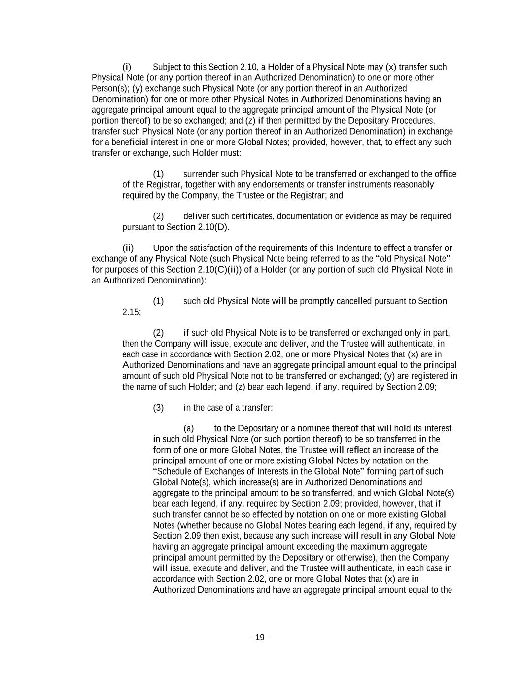 - 19 - (i) Subject to this Section 2.10, a Holder of a Physical Note may (x) transfer such Physical Note (or any portion thereof in an Authorized Denomination) to one or more other Person(s); (y) exchange such Physical Note (or any portion thereof in an Authorized Denomination) for one or more other Physical Notes in Authorized Denominations having an aggregate principal amount equal to the aggregate principal amount of the Physical Note (or portion thereof) to be so exchanged; and (z) if then permitted by the Depositary Procedures, transfer such Physical Note (or any portion thereof in an Authorized Denomination) in exchange for a beneficial interest in one or more Global Notes; provided, however, that, to effect any such transfer or exchange, such Holder must: (1) surrender such Physical Note to be transferred or exchanged to the office of the Registrar, together with any endorsements or transfer instruments reasonably required by the Company, the Trustee or the Registrar; and (2) deliver such certificates, documentation or evidence as may be required pursuant to Section 2.10(D). (ii) Upon the satisfaction of the requirements of this Indenture to effect a transfer or exchange of any Physical Note (such Physical Note being referred to as the “old Physical Note” for purposes of this Section 2.10(C)(ii)) of a Holder (or any portion of such old Physical Note in an Authorized Denomination): (1) such old Physical Note will be promptly cancelled pursuant to Section 2.15; (2) if such old Physical Note is to be transferred or exchanged only in part, then the Company will issue, execute and deliver, and the Trustee will authenticate, in each case in accordance with Section 2.02, one or more Physical Notes that (x) are in Authorized Denominations and have an aggregate principal amount equal to the principal amount of such old Physical Note not to be transferred or exchanged; (y) are registered in the name of such Holder; and (z) bear each legend, if any, required by Section 2.09; (3) in the case of a transfer: (a) to the Depositary or a nominee thereof that will hold its interest in such old Physical Note (or such portion thereof) to be so transferred in the form of one or more Global Notes, the Trustee will reflect an increase of the principal amount of one or more existing Global Notes by notation on the “Schedule of Exchanges of Interests in the Global Note” forming part of such Global Note(s), which increase(s) are in Authorized Denominations and aggregate to the principal amount to be so transferred, and which Global Note(s) bear each legend, if any, required by Section 2.09; provided, however, that if such transfer cannot be so effected by notation on one or more existing Global Notes (whether because no Global Notes bearing each legend, if any, required by Section 2.09 then exist, because any such increase will result in any Global Note having an aggregate principal amount exceeding the maximum aggregate principal amount permitted by the Depositary or otherwise), then the Company will issue, execute and deliver, and the Trustee will authenticate, in each case in accordance with Section 2.02, one or more Global Notes that (x) are in Authorized Denominations and have an aggregate principal amount equal to the