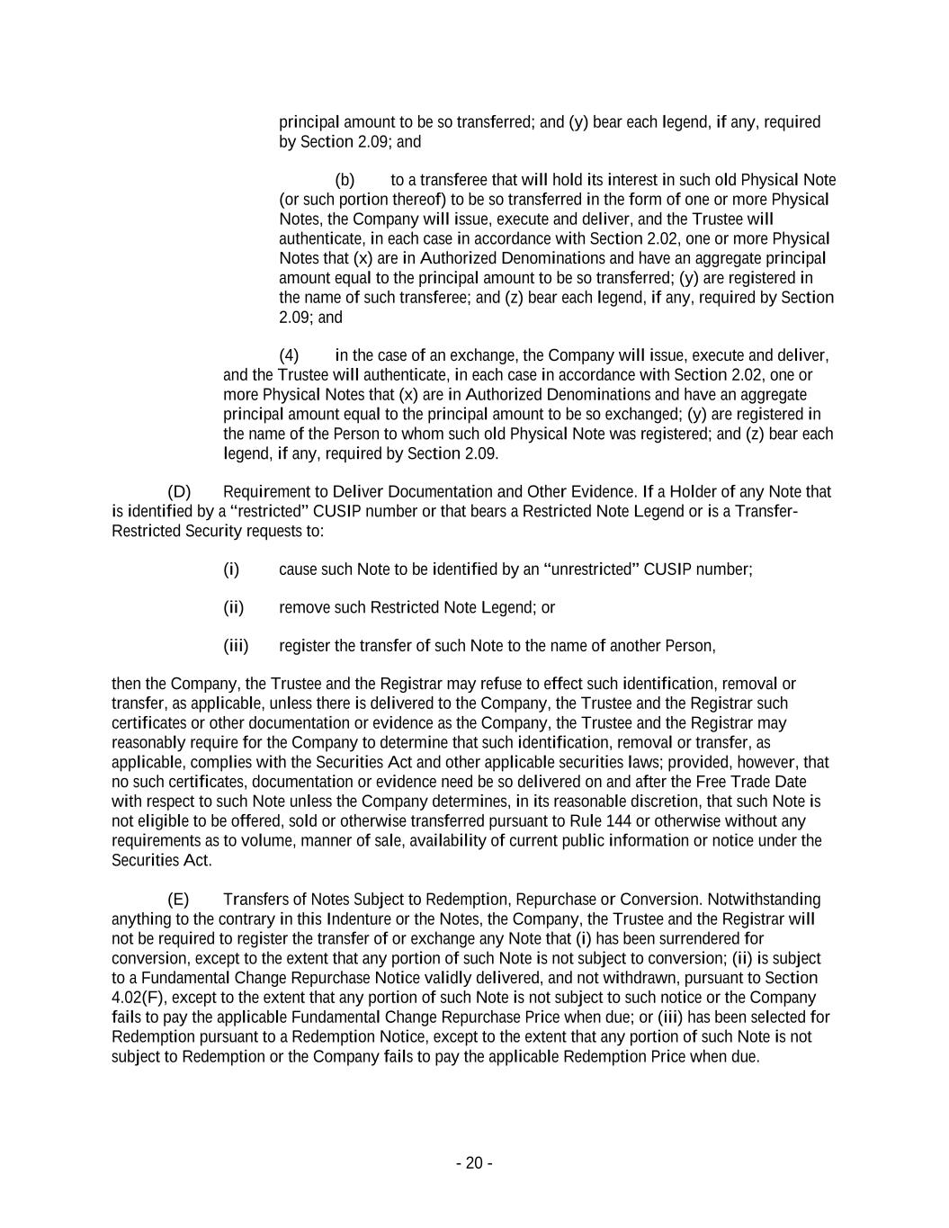 - 20 - principal amount to be so transferred; and (y) bear each legend, if any, required by Section 2.09; and (b) to a transferee that will hold its interest in such old Physical Note (or such portion thereof) to be so transferred in the form of one or more Physical Notes, the Company will issue, execute and deliver, and the Trustee will authenticate, in each case in accordance with Section 2.02, one or more Physical Notes that (x) are in Authorized Denominations and have an aggregate principal amount equal to the principal amount to be so transferred; (y) are registered in the name of such transferee; and (z) bear each legend, if any, required by Section 2.09; and (4) in the case of an exchange, the Company will issue, execute and deliver, and the Trustee will authenticate, in each case in accordance with Section 2.02, one or more Physical Notes that (x) are in Authorized Denominations and have an aggregate principal amount equal to the principal amount to be so exchanged; (y) are registered in the name of the Person to whom such old Physical Note was registered; and (z) bear each legend, if any, required by Section 2.09. (D) Requirement to Deliver Documentation and Other Evidence. If a Holder of any Note that is identified by a “restricted” CUSIP number or that bears a Restricted Note Legend or is a Transfer- Restricted Security requests to: (i) cause such Note to be identified by an “unrestricted” CUSIP number; (ii) remove such Restricted Note Legend; or (iii) register the transfer of such Note to the name of another Person, then the Company, the Trustee and the Registrar may refuse to effect such identification, removal or transfer, as applicable, unless there is delivered to the Company, the Trustee and the Registrar such certificates or other documentation or evidence as the Company, the Trustee and the Registrar may reasonably require for the Company to determine that such identification, removal or transfer, as applicable, complies with the Securities Act and other applicable securities laws; provided, however, that no such certificates, documentation or evidence need be so delivered on and after the Free Trade Date with respect to such Note unless the Company determines, in its reasonable discretion, that such Note is not eligible to be offered, sold or otherwise transferred pursuant to Rule 144 or otherwise without any requirements as to volume, manner of sale, availability of current public information or notice under the Securities Act. (E) Transfers of Notes Subject to Redemption, Repurchase or Conversion. Notwithstanding anything to the contrary in this Indenture or the Notes, the Company, the Trustee and the Registrar will not be required to register the transfer of or exchange any Note that (i) has been surrendered for conversion, except to the extent that any portion of such Note is not subject to conversion; (ii) is subject to a Fundamental Change Repurchase Notice validly delivered, and not withdrawn, pursuant to Section 4.02(F), except to the extent that any portion of such Note is not subject to such notice or the Company fails to pay the applicable Fundamental Change Repurchase Price when due; or (iii) has been selected for Redemption pursuant to a Redemption Notice, except to the extent that any portion of such Note is not subject to Redemption or the Company fails to pay the applicable Redemption Price when due.
