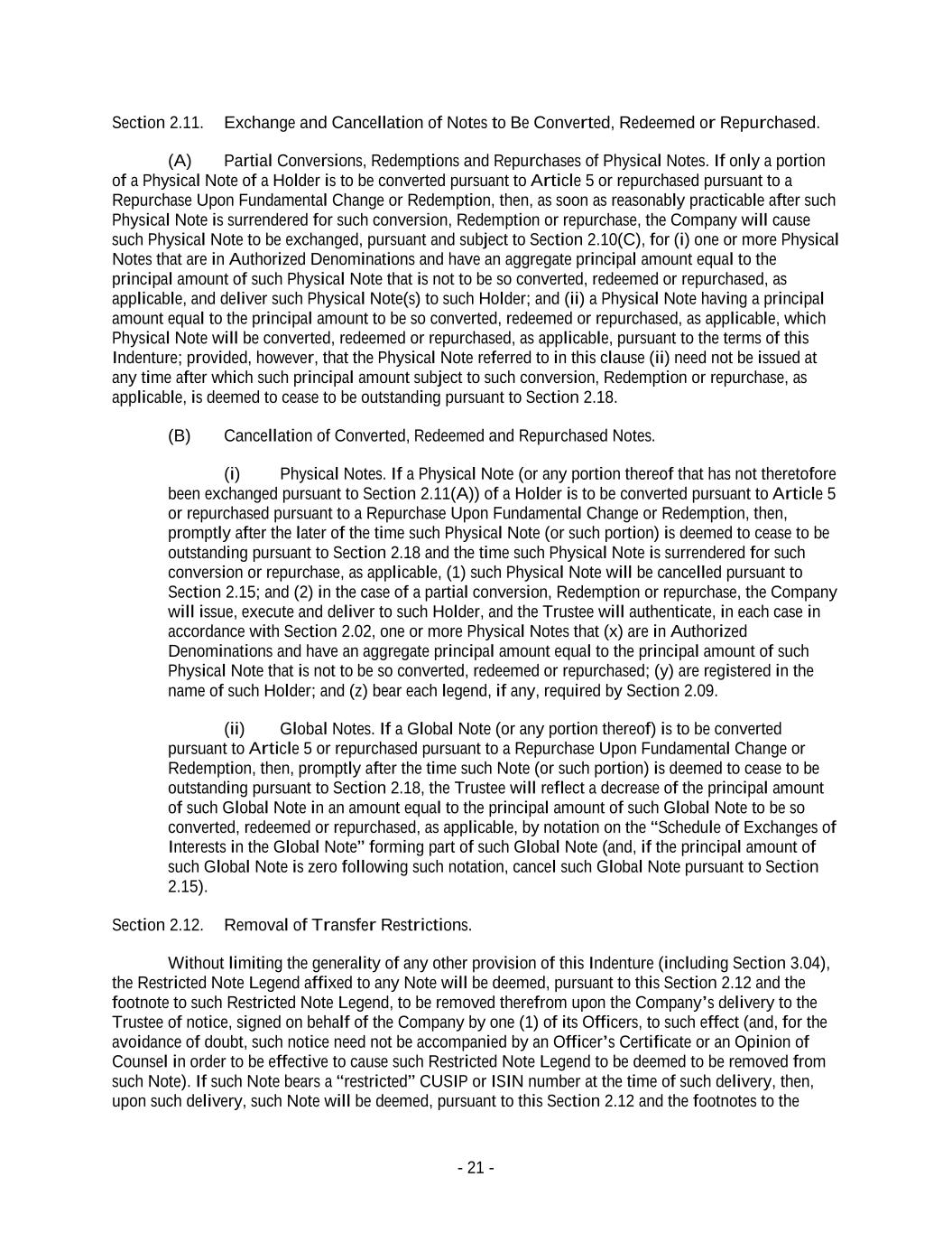 - 21 - Section 2.11. Exchange and Cancellation of Notes to Be Converted, Redeemed or Repurchased. (A) Partial Conversions, Redemptions and Repurchases of Physical Notes. If only a portion of a Physical Note of a Holder is to be converted pursuant to Article 5 or repurchased pursuant to a Repurchase Upon Fundamental Change or Redemption, then, as soon as reasonably practicable after such Physical Note is surrendered for such conversion, Redemption or repurchase, the Company will cause such Physical Note to be exchanged, pursuant and subject to Section 2.10(C), for (i) one or more Physical Notes that are in Authorized Denominations and have an aggregate principal amount equal to the principal amount of such Physical Note that is not to be so converted, redeemed or repurchased, as applicable, and deliver such Physical Note(s) to such Holder; and (ii) a Physical Note having a principal amount equal to the principal amount to be so converted, redeemed or repurchased, as applicable, which Physical Note will be converted, redeemed or repurchased, as applicable, pursuant to the terms of this Indenture; provided, however, that the Physical Note referred to in this clause (ii) need not be issued at any time after which such principal amount subject to such conversion, Redemption or repurchase, as applicable, is deemed to cease to be outstanding pursuant to Section 2.18. (B) Cancellation of Converted, Redeemed and Repurchased Notes. (i) Physical Notes. If a Physical Note (or any portion thereof that has not theretofore been exchanged pursuant to Section 2.11(A)) of a Holder is to be converted pursuant to Article 5 or repurchased pursuant to a Repurchase Upon Fundamental Change or Redemption, then, promptly after the later of the time such Physical Note (or such portion) is deemed to cease to be outstanding pursuant to Section 2.18 and the time such Physical Note is surrendered for such conversion or repurchase, as applicable, (1) such Physical Note will be cancelled pursuant to Section 2.15; and (2) in the case of a partial conversion, Redemption or repurchase, the Company will issue, execute and deliver to such Holder, and the Trustee will authenticate, in each case in accordance with Section 2.02, one or more Physical Notes that (x) are in Authorized Denominations and have an aggregate principal amount equal to the principal amount of such Physical Note that is not to be so converted, redeemed or repurchased; (y) are registered in the name of such Holder; and (z) bear each legend, if any, required by Section 2.09. (ii) Global Notes. If a Global Note (or any portion thereof) is to be converted pursuant to Article 5 or repurchased pursuant to a Repurchase Upon Fundamental Change or Redemption, then, promptly after the time such Note (or such portion) is deemed to cease to be outstanding pursuant to Section 2.18, the Trustee will reflect a decrease of the principal amount of such Global Note in an amount equal to the principal amount of such Global Note to be so converted, redeemed or repurchased, as applicable, by notation on the “Schedule of Exchanges of Interests in the Global Note” forming part of such Global Note (and, if the principal amount of such Global Note is zero following such notation, cancel such Global Note pursuant to Section 2.15). Section 2.12. Removal of Transfer Restrictions. Without limiting the generality of any other provision of this Indenture (including Section 3.04), the Restricted Note Legend affixed to any Note will be deemed, pursuant to this Section 2.12 and the footnote to such Restricted Note Legend, to be removed therefrom upon the Company’s delivery to the Trustee of notice, signed on behalf of the Company by one (1) of its Officers, to such effect (and, for the avoidance of doubt, such notice need not be accompanied by an Officer’s Certificate or an Opinion of Counsel in order to be effective to cause such Restricted Note Legend to be deemed to be removed from such Note). If such Note bears a “restricted” CUSIP or ISIN number at the time of such delivery, then, upon such delivery, such Note will be deemed, pursuant to this Section 2.12 and the footnotes to the