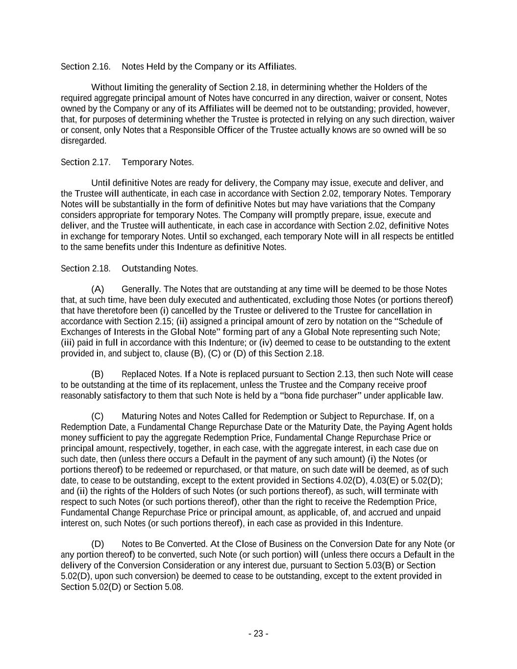 - 23 - Section 2.16. Notes Held by the Company or its Affiliates. Without limiting the generality of Section 2.18, in determining whether the Holders of the required aggregate principal amount of Notes have concurred in any direction, waiver or consent, Notes owned by the Company or any of its Affiliates will be deemed not to be outstanding; provided, however, that, for purposes of determining whether the Trustee is protected in relying on any such direction, waiver or consent, only Notes that a Responsible Officer of the Trustee actually knows are so owned will be so disregarded. Section 2.17. Temporary Notes. Until definitive Notes are ready for delivery, the Company may issue, execute and deliver, and the Trustee will authenticate, in each case in accordance with Section 2.02, temporary Notes. Temporary Notes will be substantially in the form of definitive Notes but may have variations that the Company considers appropriate for temporary Notes. The Company will promptly prepare, issue, execute and deliver, and the Trustee will authenticate, in each case in accordance with Section 2.02, definitive Notes in exchange for temporary Notes. Until so exchanged, each temporary Note will in all respects be entitled to the same benefits under this Indenture as definitive Notes. Section 2.18. Outstanding Notes. (A) Generally. The Notes that are outstanding at any time will be deemed to be those Notes that, at such time, have been duly executed and authenticated, excluding those Notes (or portions thereof) that have theretofore been (i) cancelled by the Trustee or delivered to the Trustee for cancellation in accordance with Section 2.15; (ii) assigned a principal amount of zero by notation on the “Schedule of Exchanges of Interests in the Global Note” forming part of any a Global Note representing such Note; (iii) paid in full in accordance with this Indenture; or (iv) deemed to cease to be outstanding to the extent provided in, and subject to, clause (B), (C) or (D) of this Section 2.18. (B) Replaced Notes. If a Note is replaced pursuant to Section 2.13, then such Note will cease to be outstanding at the time of its replacement, unless the Trustee and the Company receive proof reasonably satisfactory to them that such Note is held by a “bona fide purchaser” under applicable law. (C) Maturing Notes and Notes Called for Redemption or Subject to Repurchase. If, on a Redemption Date, a Fundamental Change Repurchase Date or the Maturity Date, the Paying Agent holds money sufficient to pay the aggregate Redemption Price, Fundamental Change Repurchase Price or principal amount, respectively, together, in each case, with the aggregate interest, in each case due on such date, then (unless there occurs a Default in the payment of any such amount) (i) the Notes (or portions thereof) to be redeemed or repurchased, or that mature, on such date will be deemed, as of such date, to cease to be outstanding, except to the extent provided in Sections 4.02(D), 4.03(E) or 5.02(D); and (ii) the rights of the Holders of such Notes (or such portions thereof), as such, will terminate with respect to such Notes (or such portions thereof), other than the right to receive the Redemption Price, Fundamental Change Repurchase Price or principal amount, as applicable, of, and accrued and unpaid interest on, such Notes (or such portions thereof), in each case as provided in this Indenture. (D) Notes to Be Converted. At the Close of Business on the Conversion Date for any Note (or any portion thereof) to be converted, such Note (or such portion) will (unless there occurs a Default in the delivery of the Conversion Consideration or any interest due, pursuant to Section 5.03(B) or Section 5.02(D), upon such conversion) be deemed to cease to be outstanding, except to the extent provided in Section 5.02(D) or Section 5.08.