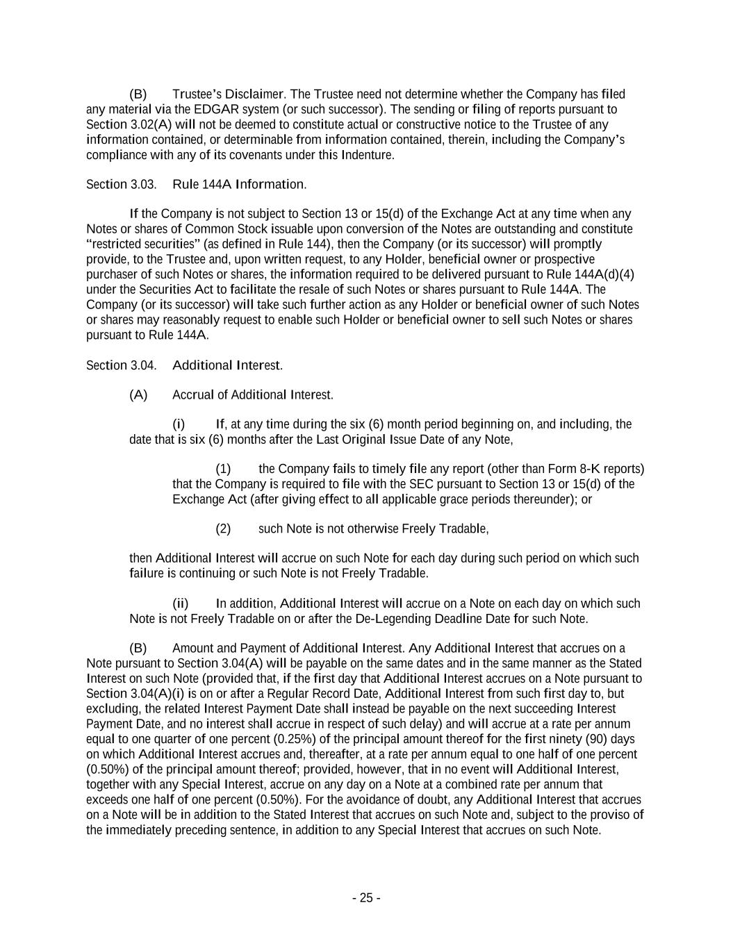 - 25 - (B) Trustee’s Disclaimer. The Trustee need not determine whether the Company has filed any material via the EDGAR system (or such successor). The sending or filing of reports pursuant to Section 3.02(A) will not be deemed to constitute actual or constructive notice to the Trustee of any information contained, or determinable from information contained, therein, including the Company’s compliance with any of its covenants under this Indenture. Section 3.03. Rule 144A Information. If the Company is not subject to Section 13 or 15(d) of the Exchange Act at any time when any Notes or shares of Common Stock issuable upon conversion of the Notes are outstanding and constitute “restricted securities” (as defined in Rule 144), then the Company (or its successor) will promptly provide, to the Trustee and, upon written request, to any Holder, beneficial owner or prospective purchaser of such Notes or shares, the information required to be delivered pursuant to Rule 144A(d)(4) under the Securities Act to facilitate the resale of such Notes or shares pursuant to Rule 144A. The Company (or its successor) will take such further action as any Holder or beneficial owner of such Notes or shares may reasonably request to enable such Holder or beneficial owner to sell such Notes or shares pursuant to Rule 144A. Section 3.04. Additional Interest. (A) Accrual of Additional Interest. (i) If, at any time during the six (6) month period beginning on, and including, the date that is six (6) months after the Last Original Issue Date of any Note, (1) the Company fails to timely file any report (other than Form 8-K reports) that the Company is required to file with the SEC pursuant to Section 13 or 15(d) of the Exchange Act (after giving effect to all applicable grace periods thereunder); or (2) such Note is not otherwise Freely Tradable, then Additional Interest will accrue on such Note for each day during such period on which such failure is continuing or such Note is not Freely Tradable. (ii) In addition, Additional Interest will accrue on a Note on each day on which such Note is not Freely Tradable on or after the De-Legending Deadline Date for such Note. (B) Amount and Payment of Additional Interest. Any Additional Interest that accrues on a Note pursuant to Section 3.04(A) will be payable on the same dates and in the same manner as the Stated Interest on such Note (provided that, if the first day that Additional Interest accrues on a Note pursuant to Section 3.04(A)(i) is on or after a Regular Record Date, Additional Interest from such first day to, but excluding, the related Interest Payment Date shall instead be payable on the next succeeding Interest Payment Date, and no interest shall accrue in respect of such delay) and will accrue at a rate per annum equal to one quarter of one percent (0.25%) of the principal amount thereof for the first ninety (90) days on which Additional Interest accrues and, thereafter, at a rate per annum equal to one half of one percent (0.50%) of the principal amount thereof; provided, however, that in no event will Additional Interest, together with any Special Interest, accrue on any day on a Note at a combined rate per annum that exceeds one half of one percent (0.50%). For the avoidance of doubt, any Additional Interest that accrues on a Note will be in addition to the Stated Interest that accrues on such Note and, subject to the proviso of the immediately preceding sentence, in addition to any Special Interest that accrues on such Note.