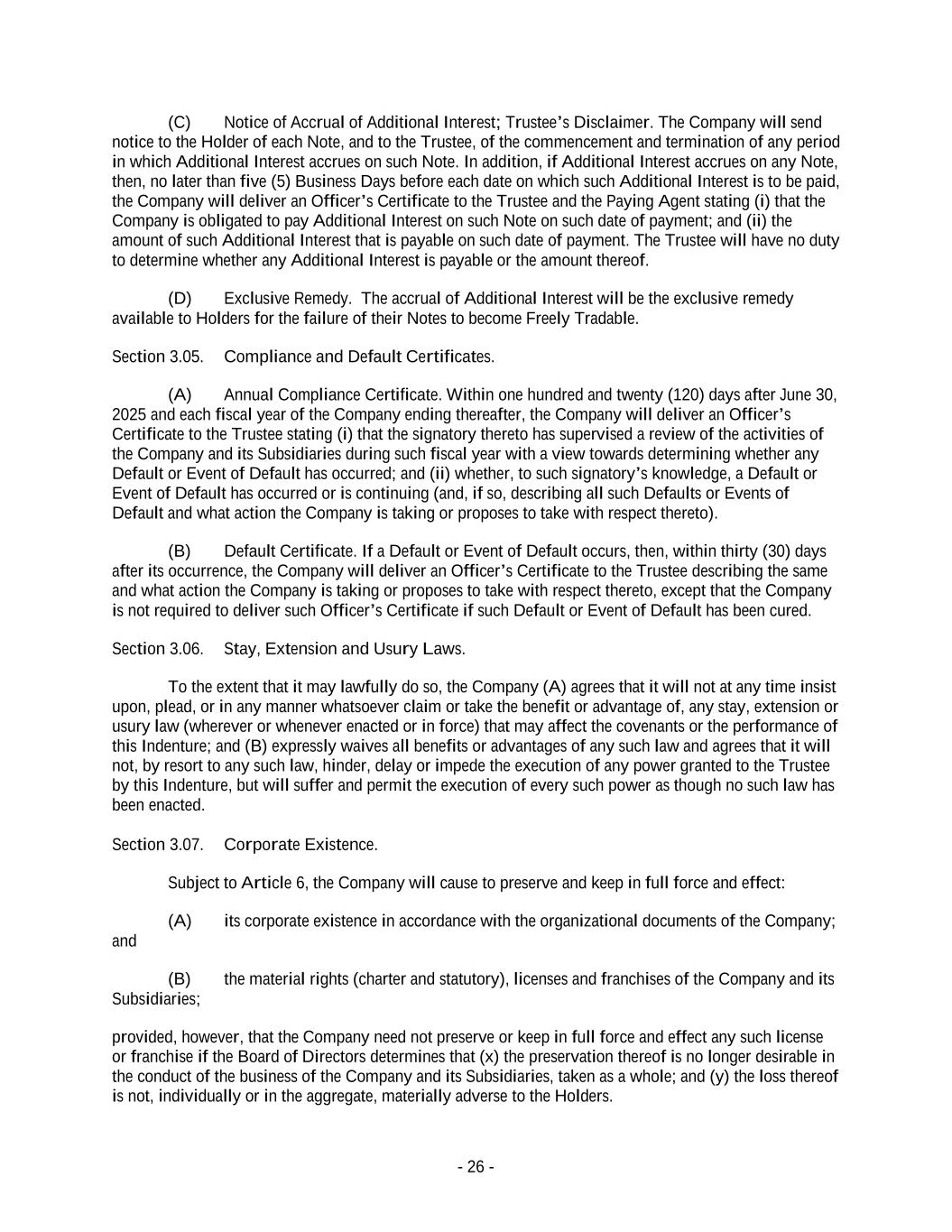 - 26 - (C) Notice of Accrual of Additional Interest; Trustee’s Disclaimer. The Company will send notice to the Holder of each Note, and to the Trustee, of the commencement and termination of any period in which Additional Interest accrues on such Note. In addition, if Additional Interest accrues on any Note, then, no later than five (5) Business Days before each date on which such Additional Interest is to be paid, the Company will deliver an Officer’s Certificate to the Trustee and the Paying Agent stating (i) that the Company is obligated to pay Additional Interest on such Note on such date of payment; and (ii) the amount of such Additional Interest that is payable on such date of payment. The Trustee will have no duty to determine whether any Additional Interest is payable or the amount thereof. (D) Exclusive Remedy. The accrual of Additional Interest will be the exclusive remedy available to Holders for the failure of their Notes to become Freely Tradable. Section 3.05. Compliance and Default Certificates. (A) Annual Compliance Certificate. Within one hundred and twenty (120) days after June 30, 2025 and each fiscal year of the Company ending thereafter, the Company will deliver an Officer’s Certificate to the Trustee stating (i) that the signatory thereto has supervised a review of the activities of the Company and its Subsidiaries during such fiscal year with a view towards determining whether any Default or Event of Default has occurred; and (ii) whether, to such signatory’s knowledge, a Default or Event of Default has occurred or is continuing (and, if so, describing all such Defaults or Events of Default and what action the Company is taking or proposes to take with respect thereto). (B) Default Certificate. If a Default or Event of Default occurs, then, within thirty (30) days after its occurrence, the Company will deliver an Officer’s Certificate to the Trustee describing the same and what action the Company is taking or proposes to take with respect thereto, except that the Company is not required to deliver such Officer’s Certificate if such Default or Event of Default has been cured. Section 3.06. Stay, Extension and Usury Laws. To the extent that it may lawfully do so, the Company (A) agrees that it will not at any time insist upon, plead, or in any manner whatsoever claim or take the benefit or advantage of, any stay, extension or usury law (wherever or whenever enacted or in force) that may affect the covenants or the performance of this Indenture; and (B) expressly waives all benefits or advantages of any such law and agrees that it will not, by resort to any such law, hinder, delay or impede the execution of any power granted to the Trustee by this Indenture, but will suffer and permit the execution of every such power as though no such law has been enacted. Section 3.07. Corporate Existence. Subject to Article 6, the Company will cause to preserve and keep in full force and effect: (A) its corporate existence in accordance with the organizational documents of the Company; and (B) the material rights (charter and statutory), licenses and franchises of the Company and its Subsidiaries; provided, however, that the Company need not preserve or keep in full force and effect any such license or franchise if the Board of Directors determines that (x) the preservation thereof is no longer desirable in the conduct of the business of the Company and its Subsidiaries, taken as a whole; and (y) the loss thereof is not, individually or in the aggregate, materially adverse to the Holders.