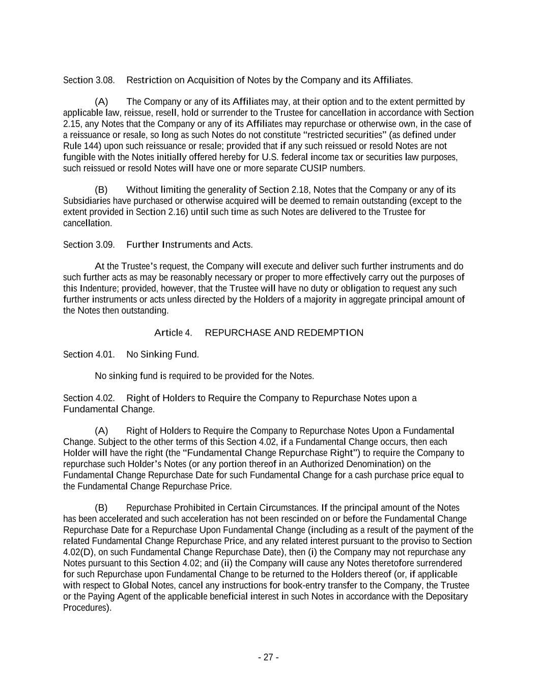 - 27 - Section 3.08. Restriction on Acquisition of Notes by the Company and its Affiliates. (A) The Company or any of its Affiliates may, at their option and to the extent permitted by applicable law, reissue, resell, hold or surrender to the Trustee for cancellation in accordance with Section 2.15, any Notes that the Company or any of its Affiliates may repurchase or otherwise own, in the case of a reissuance or resale, so long as such Notes do not constitute “restricted securities” (as defined under Rule 144) upon such reissuance or resale; provided that if any such reissued or resold Notes are not fungible with the Notes initially offered hereby for U.S. federal income tax or securities law purposes, such reissued or resold Notes will have one or more separate CUSIP numbers. (B) Without limiting the generality of Section 2.18, Notes that the Company or any of its Subsidiaries have purchased or otherwise acquired will be deemed to remain outstanding (except to the extent provided in Section 2.16) until such time as such Notes are delivered to the Trustee for cancellation. Section 3.09. Further Instruments and Acts. At the Trustee’s request, the Company will execute and deliver such further instruments and do such further acts as may be reasonably necessary or proper to more effectively carry out the purposes of this Indenture; provided, however, that the Trustee will have no duty or obligation to request any such further instruments or acts unless directed by the Holders of a majority in aggregate principal amount of the Notes then outstanding. Article 4. REPURCHASE AND REDEMPTION Section 4.01. No Sinking Fund. No sinking fund is required to be provided for the Notes. Section 4.02. Right of Holders to Require the Company to Repurchase Notes upon a Fundamental Change. (A) Right of Holders to Require the Company to Repurchase Notes Upon a Fundamental Change. Subject to the other terms of this Section 4.02, if a Fundamental Change occurs, then each Holder will have the right (the “Fundamental Change Repurchase Right”) to require the Company to repurchase such Holder’s Notes (or any portion thereof in an Authorized Denomination) on the Fundamental Change Repurchase Date for such Fundamental Change for a cash purchase price equal to the Fundamental Change Repurchase Price. (B) Repurchase Prohibited in Certain Circumstances. If the principal amount of the Notes has been accelerated and such acceleration has not been rescinded on or before the Fundamental Change Repurchase Date for a Repurchase Upon Fundamental Change (including as a result of the payment of the related Fundamental Change Repurchase Price, and any related interest pursuant to the proviso to Section 4.02(D), on such Fundamental Change Repurchase Date), then (i) the Company may not repurchase any Notes pursuant to this Section 4.02; and (ii) the Company will cause any Notes theretofore surrendered for such Repurchase upon Fundamental Change to be returned to the Holders thereof (or, if applicable with respect to Global Notes, cancel any instructions for book-entry transfer to the Company, the Trustee or the Paying Agent of the applicable beneficial interest in such Notes in accordance with the Depositary Procedures).