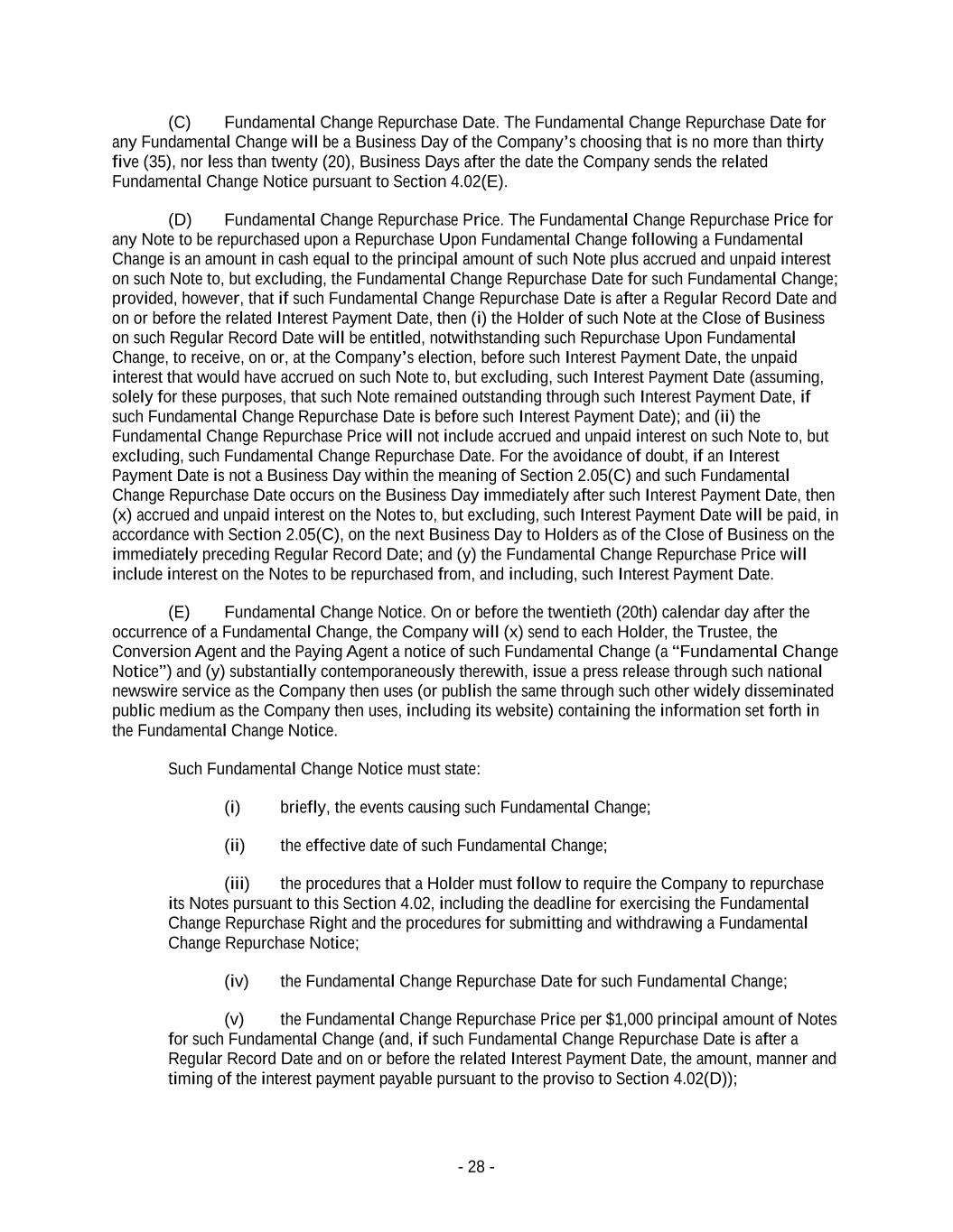 - 28 - (C) Fundamental Change Repurchase Date. The Fundamental Change Repurchase Date for any Fundamental Change will be a Business Day of the Company’s choosing that is no more than thirty five (35), nor less than twenty (20), Business Days after the date the Company sends the related Fundamental Change Notice pursuant to Section 4.02(E). (D) Fundamental Change Repurchase Price. The Fundamental Change Repurchase Price for any Note to be repurchased upon a Repurchase Upon Fundamental Change following a Fundamental Change is an amount in cash equal to the principal amount of such Note plus accrued and unpaid interest on such Note to, but excluding, the Fundamental Change Repurchase Date for such Fundamental Change; provided, however, that if such Fundamental Change Repurchase Date is after a Regular Record Date and on or before the related Interest Payment Date, then (i) the Holder of such Note at the Close of Business on such Regular Record Date will be entitled, notwithstanding such Repurchase Upon Fundamental Change, to receive, on or, at the Company’s election, before such Interest Payment Date, the unpaid interest that would have accrued on such Note to, but excluding, such Interest Payment Date (assuming, solely for these purposes, that such Note remained outstanding through such Interest Payment Date, if such Fundamental Change Repurchase Date is before such Interest Payment Date); and (ii) the Fundamental Change Repurchase Price will not include accrued and unpaid interest on such Note to, but excluding, such Fundamental Change Repurchase Date. For the avoidance of doubt, if an Interest Payment Date is not a Business Day within the meaning of Section 2.05(C) and such Fundamental Change Repurchase Date occurs on the Business Day immediately after such Interest Payment Date, then (x) accrued and unpaid interest on the Notes to, but excluding, such Interest Payment Date will be paid, in accordance with Section 2.05(C), on the next Business Day to Holders as of the Close of Business on the immediately preceding Regular Record Date; and (y) the Fundamental Change Repurchase Price will include interest on the Notes to be repurchased from, and including, such Interest Payment Date. (E) Fundamental Change Notice. On or before the twentieth (20th) calendar day after the occurrence of a Fundamental Change, the Company will (x) send to each Holder, the Trustee, the Conversion Agent and the Paying Agent a notice of such Fundamental Change (a “Fundamental Change Notice”) and (y) substantially contemporaneously therewith, issue a press release through such national newswire service as the Company then uses (or publish the same through such other widely disseminated public medium as the Company then uses, including its website) containing the information set forth in the Fundamental Change Notice. Such Fundamental Change Notice must state: (i) briefly, the events causing such Fundamental Change; (ii) the effective date of such Fundamental Change; (iii) the procedures that a Holder must follow to require the Company to repurchase its Notes pursuant to this Section 4.02, including the deadline for exercising the Fundamental Change Repurchase Right and the procedures for submitting and withdrawing a Fundamental Change Repurchase Notice; (iv) the Fundamental Change Repurchase Date for such Fundamental Change; (v) the Fundamental Change Repurchase Price per $1,000 principal amount of Notes for such Fundamental Change (and, if such Fundamental Change Repurchase Date is after a Regular Record Date and on or before the related Interest Payment Date, the amount, manner and timing of the interest payment payable pursuant to the proviso to Section 4.02(D));