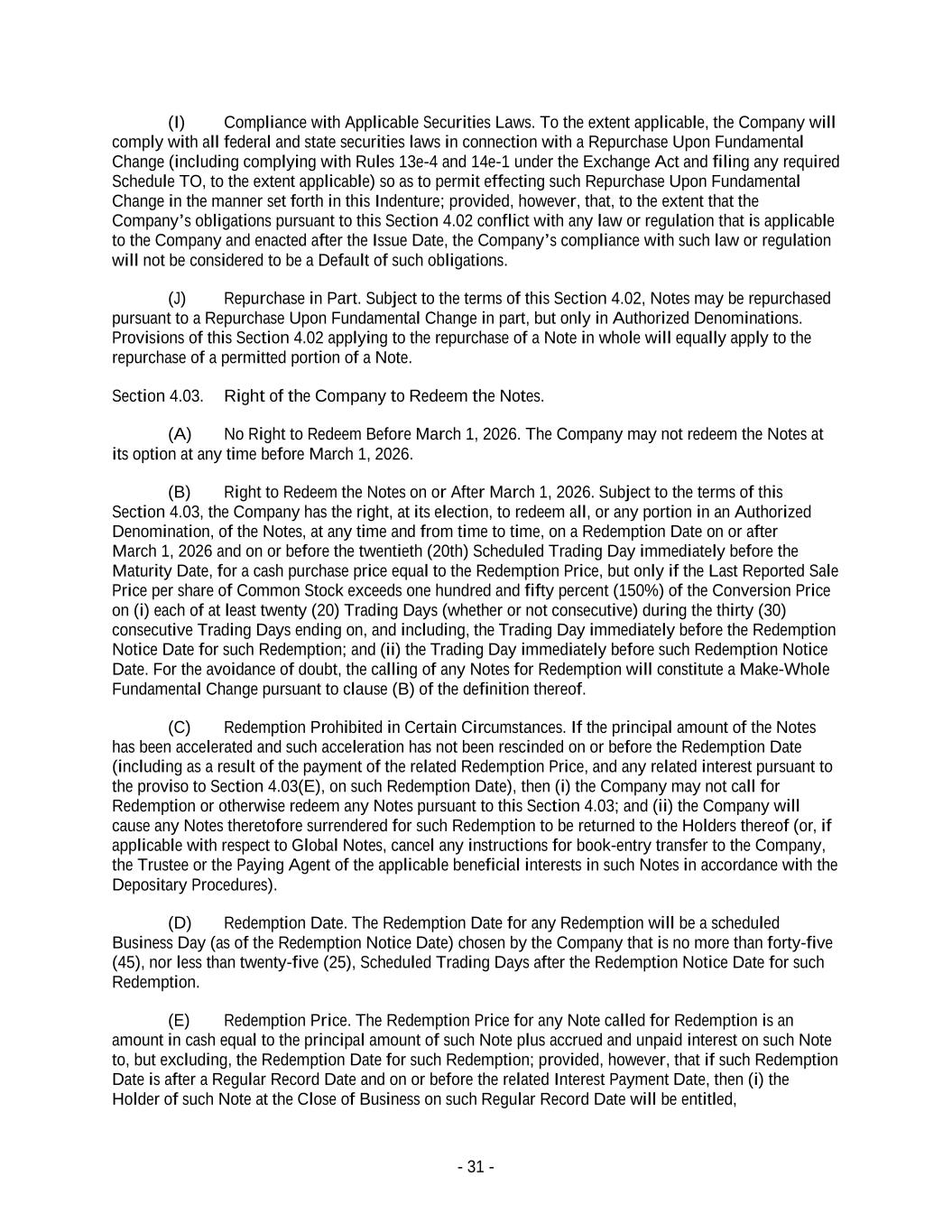 - 31 - (I) Compliance with Applicable Securities Laws. To the extent applicable, the Company will comply with all federal and state securities laws in connection with a Repurchase Upon Fundamental Change (including complying with Rules 13e-4 and 14e-1 under the Exchange Act and filing any required Schedule TO, to the extent applicable) so as to permit effecting such Repurchase Upon Fundamental Change in the manner set forth in this Indenture; provided, however, that, to the extent that the Company’s obligations pursuant to this Section 4.02 conflict with any law or regulation that is applicable to the Company and enacted after the Issue Date, the Company’s compliance with such law or regulation will not be considered to be a Default of such obligations. (J) Repurchase in Part. Subject to the terms of this Section 4.02, Notes may be repurchased pursuant to a Repurchase Upon Fundamental Change in part, but only in Authorized Denominations. Provisions of this Section 4.02 applying to the repurchase of a Note in whole will equally apply to the repurchase of a permitted portion of a Note. Section 4.03. Right of the Company to Redeem the Notes. (A) No Right to Redeem Before March 1, 2026. The Company may not redeem the Notes at its option at any time before March 1, 2026. (B) Right to Redeem the Notes on or After March 1, 2026. Subject to the terms of this Section 4.03, the Company has the right, at its election, to redeem all, or any portion in an Authorized Denomination, of the Notes, at any time and from time to time, on a Redemption Date on or after March 1, 2026 and on or before the twentieth (20th) Scheduled Trading Day immediately before the Maturity Date, for a cash purchase price equal to the Redemption Price, but only if the Last Reported Sale Price per share of Common Stock exceeds one hundred and fifty percent (150%) of the Conversion Price on (i) each of at least twenty (20) Trading Days (whether or not consecutive) during the thirty (30) consecutive Trading Days ending on, and including, the Trading Day immediately before the Redemption Notice Date for such Redemption; and (ii) the Trading Day immediately before such Redemption Notice Date. For the avoidance of doubt, the calling of any Notes for Redemption will constitute a Make-Whole Fundamental Change pursuant to clause (B) of the definition thereof. (C) Redemption Prohibited in Certain Circumstances. If the principal amount of the Notes has been accelerated and such acceleration has not been rescinded on or before the Redemption Date (including as a result of the payment of the related Redemption Price, and any related interest pursuant to the proviso to Section 4.03(E), on such Redemption Date), then (i) the Company may not call for Redemption or otherwise redeem any Notes pursuant to this Section 4.03; and (ii) the Company will cause any Notes theretofore surrendered for such Redemption to be returned to the Holders thereof (or, if applicable with respect to Global Notes, cancel any instructions for book-entry transfer to the Company, the Trustee or the Paying Agent of the applicable beneficial interests in such Notes in accordance with the Depositary Procedures). (D) Redemption Date. The Redemption Date for any Redemption will be a scheduled Business Day (as of the Redemption Notice Date) chosen by the Company that is no more than forty-five (45), nor less than twenty-five (25), Scheduled Trading Days after the Redemption Notice Date for such Redemption. (E) Redemption Price. The Redemption Price for any Note called for Redemption is an amount in cash equal to the principal amount of such Note plus accrued and unpaid interest on such Note to, but excluding, the Redemption Date for such Redemption; provided, however, that if such Redemption Date is after a Regular Record Date and on or before the related Interest Payment Date, then (i) the Holder of such Note at the Close of Business on such Regular Record Date will be entitled,