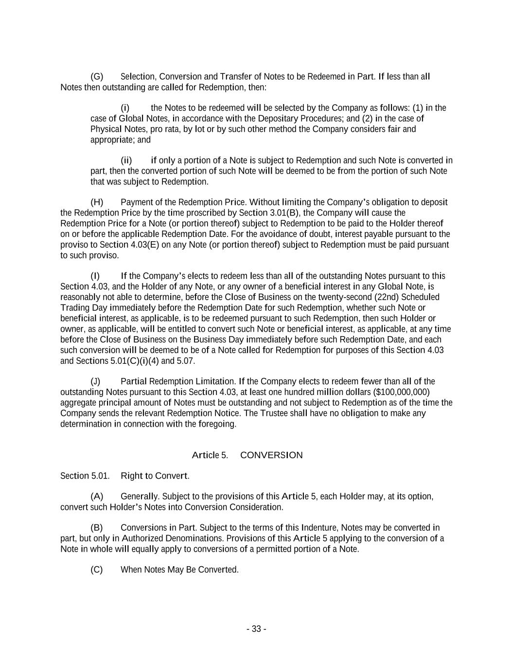 - 33 - (G) Selection, Conversion and Transfer of Notes to be Redeemed in Part. If less than all Notes then outstanding are called for Redemption, then: (i) the Notes to be redeemed will be selected by the Company as follows: (1) in the case of Global Notes, in accordance with the Depositary Procedures; and (2) in the case of Physical Notes, pro rata, by lot or by such other method the Company considers fair and appropriate; and (ii) if only a portion of a Note is subject to Redemption and such Note is converted in part, then the converted portion of such Note will be deemed to be from the portion of such Note that was subject to Redemption. (H) Payment of the Redemption Price. Without limiting the Company’s obligation to deposit the Redemption Price by the time proscribed by Section 3.01(B), the Company will cause the Redemption Price for a Note (or portion thereof) subject to Redemption to be paid to the Holder thereof on or before the applicable Redemption Date. For the avoidance of doubt, interest payable pursuant to the proviso to Section 4.03(E) on any Note (or portion thereof) subject to Redemption must be paid pursuant to such proviso. (I) If the Company’s elects to redeem less than all of the outstanding Notes pursuant to this Section 4.03, and the Holder of any Note, or any owner of a beneficial interest in any Global Note, is reasonably not able to determine, before the Close of Business on the twenty-second (22nd) Scheduled Trading Day immediately before the Redemption Date for such Redemption, whether such Note or beneficial interest, as applicable, is to be redeemed pursuant to such Redemption, then such Holder or owner, as applicable, will be entitled to convert such Note or beneficial interest, as applicable, at any time before the Close of Business on the Business Day immediately before such Redemption Date, and each such conversion will be deemed to be of a Note called for Redemption for purposes of this Section 4.03 and Sections 5.01(C)(i)(4) and 5.07. (J) Partial Redemption Limitation. If the Company elects to redeem fewer than all of the outstanding Notes pursuant to this Section 4.03, at least one hundred million dollars ($100,000,000) aggregate principal amount of Notes must be outstanding and not subject to Redemption as of the time the Company sends the relevant Redemption Notice. The Trustee shall have no obligation to make any determination in connection with the foregoing. Article 5. CONVERSION Section 5.01. Right to Convert. (A) Generally. Subject to the provisions of this Article 5, each Holder may, at its option, convert such Holder’s Notes into Conversion Consideration. (B) Conversions in Part. Subject to the terms of this Indenture, Notes may be converted in part, but only in Authorized Denominations. Provisions of this Article 5 applying to the conversion of a Note in whole will equally apply to conversions of a permitted portion of a Note. (C) When Notes May Be Converted.
