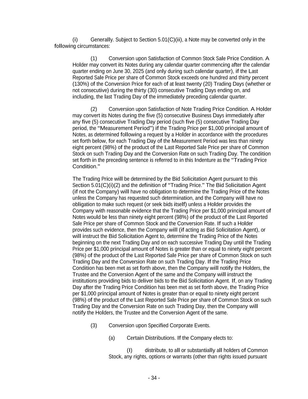 - 34 - (i) Generally. Subject to Section 5.01(C)(ii), a Note may be converted only in the following circumstances: (1) Conversion upon Satisfaction of Common Stock Sale Price Condition. A Holder may convert its Notes during any calendar quarter commencing after the calendar quarter ending on June 30, 2025 (and only during such calendar quarter), if the Last Reported Sale Price per share of Common Stock exceeds one hundred and thirty percent (130%) of the Conversion Price for each of at least twenty (20) Trading Days (whether or not consecutive) during the thirty (30) consecutive Trading Days ending on, and including, the last Trading Day of the immediately preceding calendar quarter. (2) Conversion upon Satisfaction of Note Trading Price Condition. A Holder may convert its Notes during the five (5) consecutive Business Days immediately after any five (5) consecutive Trading Day period (such five (5) consecutive Trading Day period, the “Measurement Period”) if the Trading Price per $1,000 principal amount of Notes, as determined following a request by a Holder in accordance with the procedures set forth below, for each Trading Day of the Measurement Period was less than ninety eight percent (98%) of the product of the Last Reported Sale Price per share of Common Stock on such Trading Day and the Conversion Rate on such Trading Day. The condition set forth in the preceding sentence is referred to in this Indenture as the “Trading Price Condition.” The Trading Price will be determined by the Bid Solicitation Agent pursuant to this Section 5.01(C)(i)(2) and the definition of “Trading Price.” The Bid Solicitation Agent (if not the Company) will have no obligation to determine the Trading Price of the Notes unless the Company has requested such determination, and the Company will have no obligation to make such request (or seek bids itself) unless a Holder provides the Company with reasonable evidence that the Trading Price per $1,000 principal amount of Notes would be less than ninety eight percent (98%) of the product of the Last Reported Sale Price per share of Common Stock and the Conversion Rate. If such a Holder provides such evidence, then the Company will (if acting as Bid Solicitation Agent), or will instruct the Bid Solicitation Agent to, determine the Trading Price of the Notes beginning on the next Trading Day and on each successive Trading Day until the Trading Price per $1,000 principal amount of Notes is greater than or equal to ninety eight percent (98%) of the product of the Last Reported Sale Price per share of Common Stock on such Trading Day and the Conversion Rate on such Trading Day. If the Trading Price Condition has been met as set forth above, then the Company will notify the Holders, the Trustee and the Conversion Agent of the same and the Company will instruct the institutions providing bids to deliver bids to the Bid Solicitation Agent. If, on any Trading Day after the Trading Price Condition has been met as set forth above, the Trading Price per $1,000 principal amount of Notes is greater than or equal to ninety eight percent (98%) of the product of the Last Reported Sale Price per share of Common Stock on such Trading Day and the Conversion Rate on such Trading Day, then the Company will notify the Holders, the Trustee and the Conversion Agent of the same. (3) Conversion upon Specified Corporate Events. (a) Certain Distributions. If the Company elects to: (I) distribute, to all or substantially all holders of Common Stock, any rights, options or warrants (other than rights issued pursuant