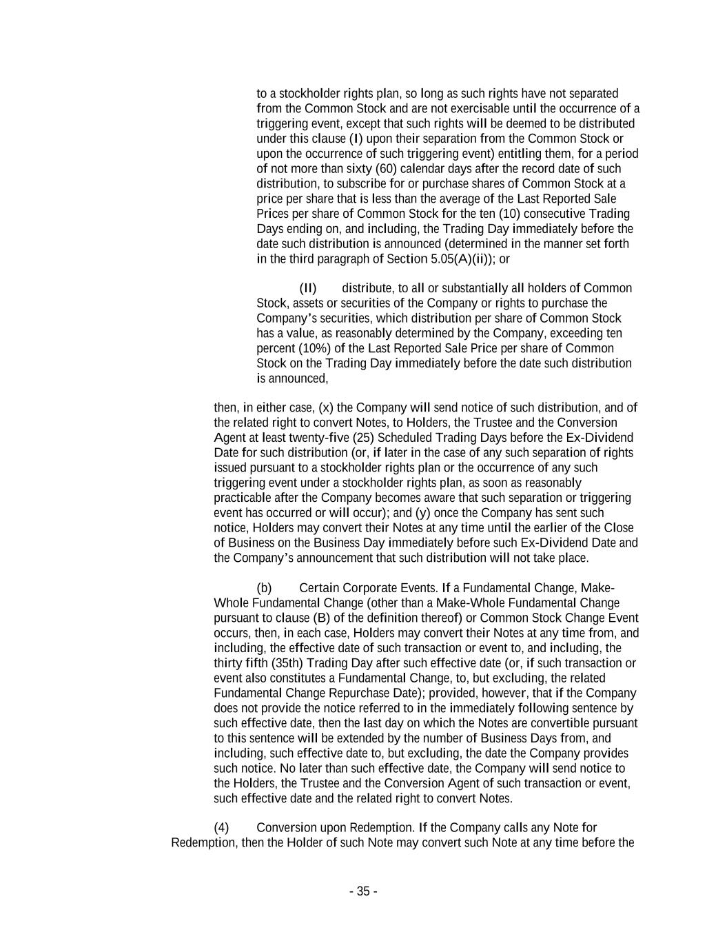 - 35 - to a stockholder rights plan, so long as such rights have not separated from the Common Stock and are not exercisable until the occurrence of a triggering event, except that such rights will be deemed to be distributed under this clause (I) upon their separation from the Common Stock or upon the occurrence of such triggering event) entitling them, for a period of not more than sixty (60) calendar days after the record date of such distribution, to subscribe for or purchase shares of Common Stock at a price per share that is less than the average of the Last Reported Sale Prices per share of Common Stock for the ten (10) consecutive Trading Days ending on, and including, the Trading Day immediately before the date such distribution is announced (determined in the manner set forth in the third paragraph of Section 5.05(A)(ii)); or (II) distribute, to all or substantially all holders of Common Stock, assets or securities of the Company or rights to purchase the Company’s securities, which distribution per share of Common Stock has a value, as reasonably determined by the Company, exceeding ten percent (10%) of the Last Reported Sale Price per share of Common Stock on the Trading Day immediately before the date such distribution is announced, then, in either case, (x) the Company will send notice of such distribution, and of the related right to convert Notes, to Holders, the Trustee and the Conversion Agent at least twenty-five (25) Scheduled Trading Days before the Ex-Dividend Date for such distribution (or, if later in the case of any such separation of rights issued pursuant to a stockholder rights plan or the occurrence of any such triggering event under a stockholder rights plan, as soon as reasonably practicable after the Company becomes aware that such separation or triggering event has occurred or will occur); and (y) once the Company has sent such notice, Holders may convert their Notes at any time until the earlier of the Close of Business on the Business Day immediately before such Ex-Dividend Date and the Company’s announcement that such distribution will not take place. (b) Certain Corporate Events. If a Fundamental Change, Make- Whole Fundamental Change (other than a Make-Whole Fundamental Change pursuant to clause (B) of the definition thereof) or Common Stock Change Event occurs, then, in each case, Holders may convert their Notes at any time from, and including, the effective date of such transaction or event to, and including, the thirty fifth (35th) Trading Day after such effective date (or, if such transaction or event also constitutes a Fundamental Change, to, but excluding, the related Fundamental Change Repurchase Date); provided, however, that if the Company does not provide the notice referred to in the immediately following sentence by such effective date, then the last day on which the Notes are convertible pursuant to this sentence will be extended by the number of Business Days from, and including, such effective date to, but excluding, the date the Company provides such notice. No later than such effective date, the Company will send notice to the Holders, the Trustee and the Conversion Agent of such transaction or event, such effective date and the related right to convert Notes. (4) Conversion upon Redemption. If the Company calls any Note for Redemption, then the Holder of such Note may convert such Note at any time before the