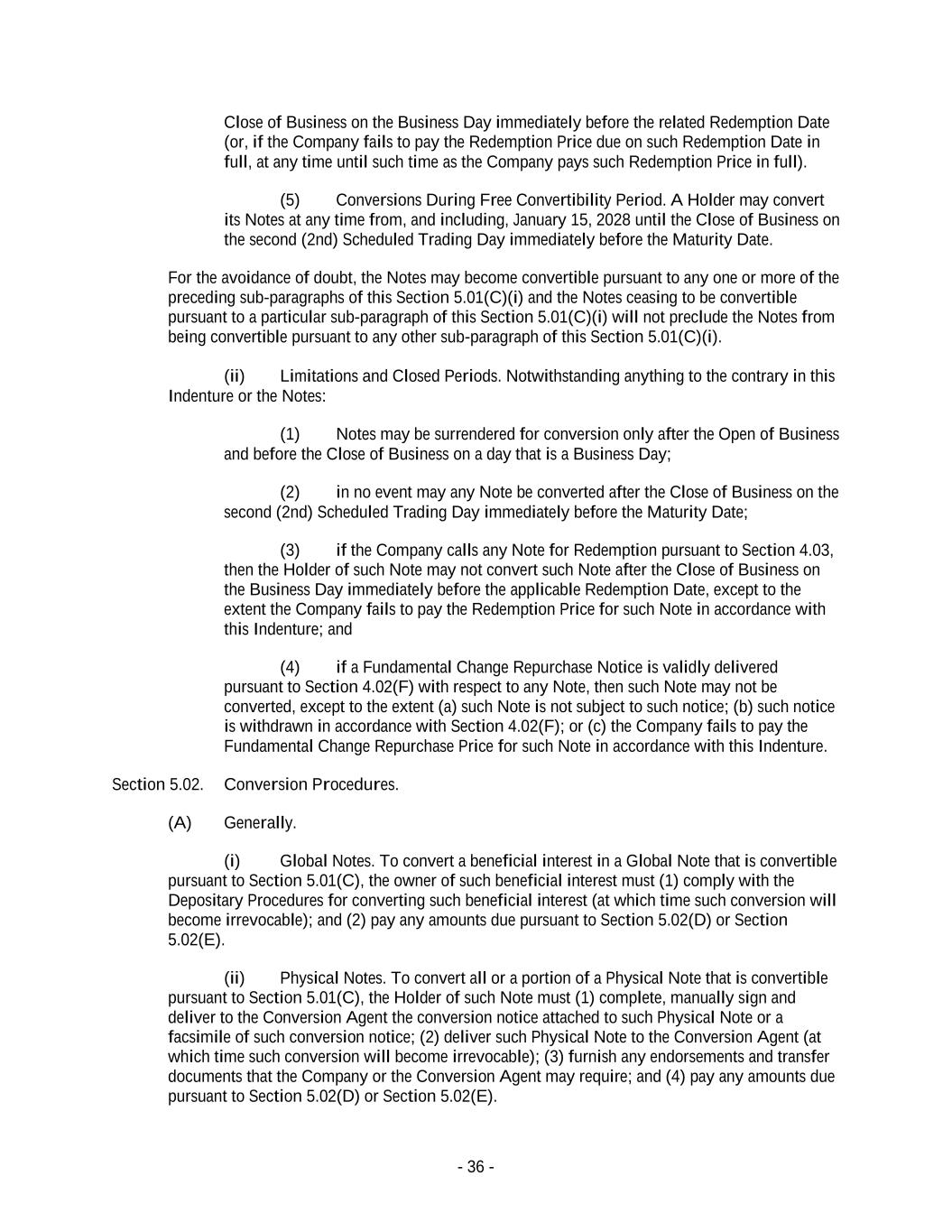 - 36 - Close of Business on the Business Day immediately before the related Redemption Date (or, if the Company fails to pay the Redemption Price due on such Redemption Date in full, at any time until such time as the Company pays such Redemption Price in full). (5) Conversions During Free Convertibility Period. A Holder may convert its Notes at any time from, and including, January 15, 2028 until the Close of Business on the second (2nd) Scheduled Trading Day immediately before the Maturity Date. For the avoidance of doubt, the Notes may become convertible pursuant to any one or more of the preceding sub-paragraphs of this Section 5.01(C)(i) and the Notes ceasing to be convertible pursuant to a particular sub-paragraph of this Section 5.01(C)(i) will not preclude the Notes from being convertible pursuant to any other sub-paragraph of this Section 5.01(C)(i). (ii) Limitations and Closed Periods. Notwithstanding anything to the contrary in this Indenture or the Notes: (1) Notes may be surrendered for conversion only after the Open of Business and before the Close of Business on a day that is a Business Day; (2) in no event may any Note be converted after the Close of Business on the second (2nd) Scheduled Trading Day immediately before the Maturity Date; (3) if the Company calls any Note for Redemption pursuant to Section 4.03, then the Holder of such Note may not convert such Note after the Close of Business on the Business Day immediately before the applicable Redemption Date, except to the extent the Company fails to pay the Redemption Price for such Note in accordance with this Indenture; and (4) if a Fundamental Change Repurchase Notice is validly delivered pursuant to Section 4.02(F) with respect to any Note, then such Note may not be converted, except to the extent (a) such Note is not subject to such notice; (b) such notice is withdrawn in accordance with Section 4.02(F); or (c) the Company fails to pay the Fundamental Change Repurchase Price for such Note in accordance with this Indenture. Section 5.02. Conversion Procedures. (A) Generally. (i) Global Notes. To convert a beneficial interest in a Global Note that is convertible pursuant to Section 5.01(C), the owner of such beneficial interest must (1) comply with the Depositary Procedures for converting such beneficial interest (at which time such conversion will become irrevocable); and (2) pay any amounts due pursuant to Section 5.02(D) or Section 5.02(E). (ii) Physical Notes. To convert all or a portion of a Physical Note that is convertible pursuant to Section 5.01(C), the Holder of such Note must (1) complete, manually sign and deliver to the Conversion Agent the conversion notice attached to such Physical Note or a facsimile of such conversion notice; (2) deliver such Physical Note to the Conversion Agent (at which time such conversion will become irrevocable); (3) furnish any endorsements and transfer documents that the Company or the Conversion Agent may require; and (4) pay any amounts due pursuant to Section 5.02(D) or Section 5.02(E).