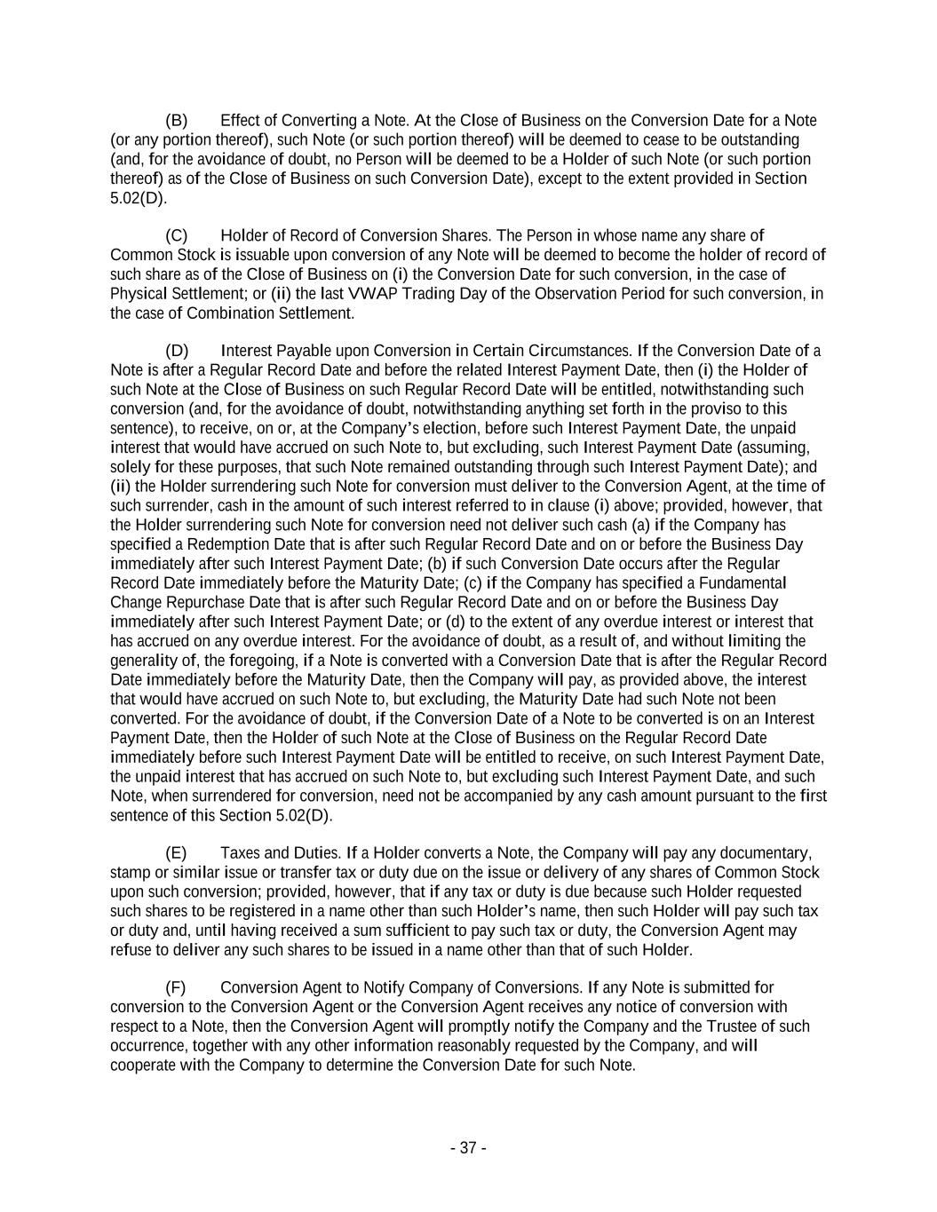 - 37 - (B) Effect of Converting a Note. At the Close of Business on the Conversion Date for a Note (or any portion thereof), such Note (or such portion thereof) will be deemed to cease to be outstanding (and, for the avoidance of doubt, no Person will be deemed to be a Holder of such Note (or such portion thereof) as of the Close of Business on such Conversion Date), except to the extent provided in Section 5.02(D). (C) Holder of Record of Conversion Shares. The Person in whose name any share of Common Stock is issuable upon conversion of any Note will be deemed to become the holder of record of such share as of the Close of Business on (i) the Conversion Date for such conversion, in the case of Physical Settlement; or (ii) the last VWAP Trading Day of the Observation Period for such conversion, in the case of Combination Settlement. (D) Interest Payable upon Conversion in Certain Circumstances. If the Conversion Date of a Note is after a Regular Record Date and before the related Interest Payment Date, then (i) the Holder of such Note at the Close of Business on such Regular Record Date will be entitled, notwithstanding such conversion (and, for the avoidance of doubt, notwithstanding anything set forth in the proviso to this sentence), to receive, on or, at the Company’s election, before such Interest Payment Date, the unpaid interest that would have accrued on such Note to, but excluding, such Interest Payment Date (assuming, solely for these purposes, that such Note remained outstanding through such Interest Payment Date); and (ii) the Holder surrendering such Note for conversion must deliver to the Conversion Agent, at the time of such surrender, cash in the amount of such interest referred to in clause (i) above; provided, however, that the Holder surrendering such Note for conversion need not deliver such cash (a) if the Company has specified a Redemption Date that is after such Regular Record Date and on or before the Business Day immediately after such Interest Payment Date; (b) if such Conversion Date occurs after the Regular Record Date immediately before the Maturity Date; (c) if the Company has specified a Fundamental Change Repurchase Date that is after such Regular Record Date and on or before the Business Day immediately after such Interest Payment Date; or (d) to the extent of any overdue interest or interest that has accrued on any overdue interest. For the avoidance of doubt, as a result of, and without limiting the generality of, the foregoing, if a Note is converted with a Conversion Date that is after the Regular Record Date immediately before the Maturity Date, then the Company will pay, as provided above, the interest that would have accrued on such Note to, but excluding, the Maturity Date had such Note not been converted. For the avoidance of doubt, if the Conversion Date of a Note to be converted is on an Interest Payment Date, then the Holder of such Note at the Close of Business on the Regular Record Date immediately before such Interest Payment Date will be entitled to receive, on such Interest Payment Date, the unpaid interest that has accrued on such Note to, but excluding such Interest Payment Date, and such Note, when surrendered for conversion, need not be accompanied by any cash amount pursuant to the first sentence of this Section 5.02(D). (E) Taxes and Duties. If a Holder converts a Note, the Company will pay any documentary, stamp or similar issue or transfer tax or duty due on the issue or delivery of any shares of Common Stock upon such conversion; provided, however, that if any tax or duty is due because such Holder requested such shares to be registered in a name other than such Holder’s name, then such Holder will pay such tax or duty and, until having received a sum sufficient to pay such tax or duty, the Conversion Agent may refuse to deliver any such shares to be issued in a name other than that of such Holder. (F) Conversion Agent to Notify Company of Conversions. If any Note is submitted for conversion to the Conversion Agent or the Conversion Agent receives any notice of conversion with respect to a Note, then the Conversion Agent will promptly notify the Company and the Trustee of such occurrence, together with any other information reasonably requested by the Company, and will cooperate with the Company to determine the Conversion Date for such Note.