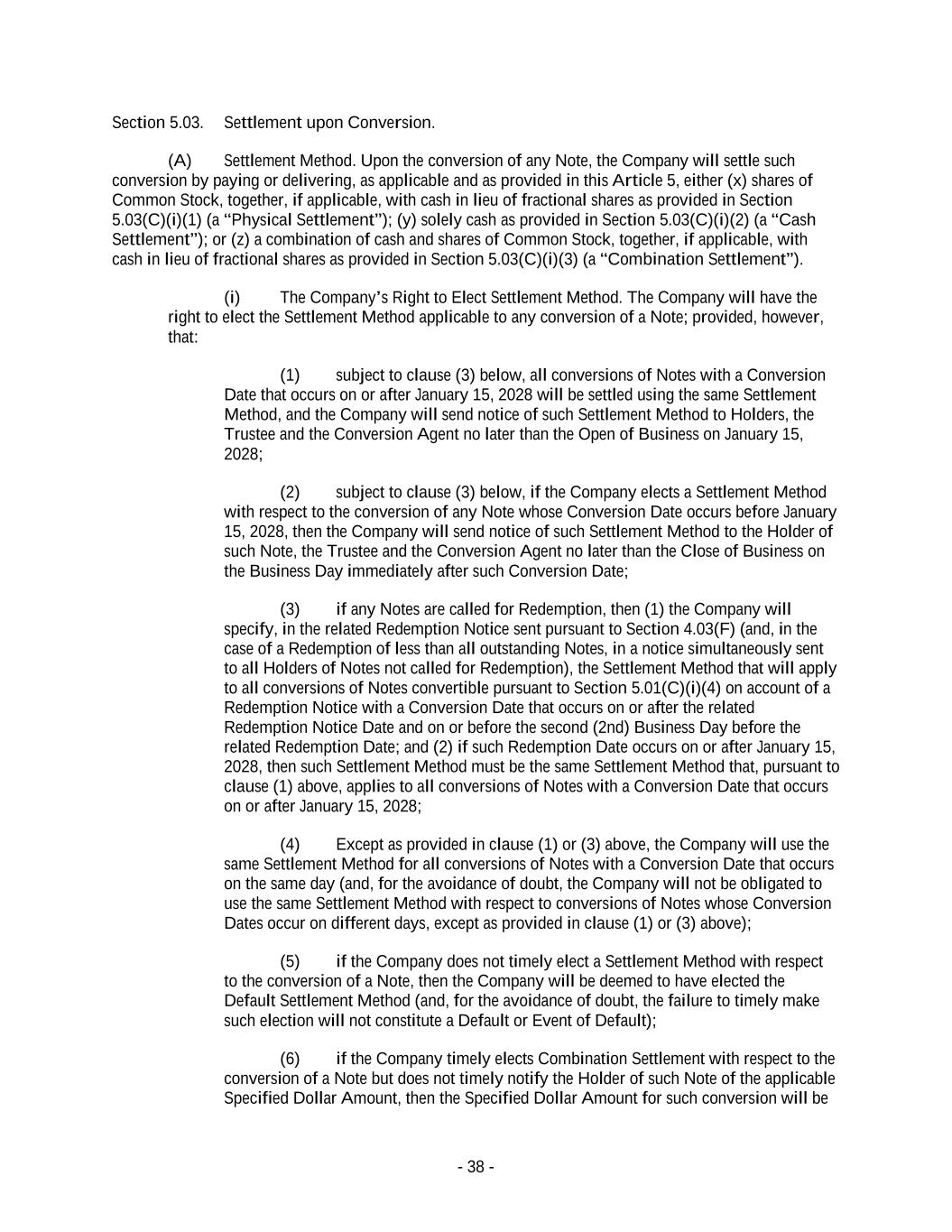 - 38 - Section 5.03. Settlement upon Conversion. (A) Settlement Method. Upon the conversion of any Note, the Company will settle such conversion by paying or delivering, as applicable and as provided in this Article 5, either (x) shares of Common Stock, together, if applicable, with cash in lieu of fractional shares as provided in Section 5.03(C)(i)(1) (a “Physical Settlement”); (y) solely cash as provided in Section 5.03(C)(i)(2) (a “Cash Settlement”); or (z) a combination of cash and shares of Common Stock, together, if applicable, with cash in lieu of fractional shares as provided in Section 5.03(C)(i)(3) (a “Combination Settlement”). (i) The Company’s Right to Elect Settlement Method. The Company will have the right to elect the Settlement Method applicable to any conversion of a Note; provided, however, that: (1) subject to clause (3) below, all conversions of Notes with a Conversion Date that occurs on or after January 15, 2028 will be settled using the same Settlement Method, and the Company will send notice of such Settlement Method to Holders, the Trustee and the Conversion Agent no later than the Open of Business on January 15, 2028; (2) subject to clause (3) below, if the Company elects a Settlement Method with respect to the conversion of any Note whose Conversion Date occurs before January 15, 2028, then the Company will send notice of such Settlement Method to the Holder of such Note, the Trustee and the Conversion Agent no later than the Close of Business on the Business Day immediately after such Conversion Date; (3) if any Notes are called for Redemption, then (1) the Company will specify, in the related Redemption Notice sent pursuant to Section 4.03(F) (and, in the case of a Redemption of less than all outstanding Notes, in a notice simultaneously sent to all Holders of Notes not called for Redemption), the Settlement Method that will apply to all conversions of Notes convertible pursuant to Section 5.01(C)(i)(4) on account of a Redemption Notice with a Conversion Date that occurs on or after the related Redemption Notice Date and on or before the second (2nd) Business Day before the related Redemption Date; and (2) if such Redemption Date occurs on or after January 15, 2028, then such Settlement Method must be the same Settlement Method that, pursuant to clause (1) above, applies to all conversions of Notes with a Conversion Date that occurs on or after January 15, 2028; (4) Except as provided in clause (1) or (3) above, the Company will use the same Settlement Method for all conversions of Notes with a Conversion Date that occurs on the same day (and, for the avoidance of doubt, the Company will not be obligated to use the same Settlement Method with respect to conversions of Notes whose Conversion Dates occur on different days, except as provided in clause (1) or (3) above); (5) if the Company does not timely elect a Settlement Method with respect to the conversion of a Note, then the Company will be deemed to have elected the Default Settlement Method (and, for the avoidance of doubt, the failure to timely make such election will not constitute a Default or Event of Default); (6) if the Company timely elects Combination Settlement with respect to the conversion of a Note but does not timely notify the Holder of such Note of the applicable Specified Dollar Amount, then the Specified Dollar Amount for such conversion will be