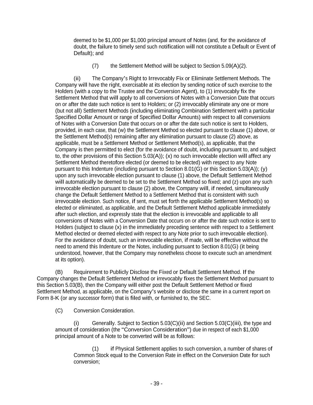 - 39 - deemed to be $1,000 per $1,000 principal amount of Notes (and, for the avoidance of doubt, the failure to timely send such notification will not constitute a Default or Event of Default); and (7) the Settlement Method will be subject to Section 5.09(A)(2). (ii) The Company’s Right to Irrevocably Fix or Eliminate Settlement Methods. The Company will have the right, exercisable at its election by sending notice of such exercise to the Holders (with a copy to the Trustee and the Conversion Agent), to (1) irrevocably fix the Settlement Method that will apply to all conversions of Notes with a Conversion Date that occurs on or after the date such notice is sent to Holders; or (2) irrevocably eliminate any one or more (but not all) Settlement Methods (including eliminating Combination Settlement with a particular Specified Dollar Amount or range of Specified Dollar Amounts) with respect to all conversions of Notes with a Conversion Date that occurs on or after the date such notice is sent to Holders, provided, in each case, that (w) the Settlement Method so elected pursuant to clause (1) above, or the Settlement Method(s) remaining after any elimination pursuant to clause (2) above, as applicable, must be a Settlement Method or Settlement Method(s), as applicable, that the Company is then permitted to elect (for the avoidance of doubt, including pursuant to, and subject to, the other provisions of this Section 5.03(A)); (x) no such irrevocable election will affect any Settlement Method theretofore elected (or deemed to be elected) with respect to any Note pursuant to this Indenture (including pursuant to Section 8.01(G) or this Section 5.03(A)); (y) upon any such irrevocable election pursuant to clause (1) above, the Default Settlement Method will automatically be deemed to be set to the Settlement Method so fixed; and (z) upon any such irrevocable election pursuant to clause (2) above, the Company will, if needed, simultaneously change the Default Settlement Method to a Settlement Method that is consistent with such irrevocable election. Such notice, if sent, must set forth the applicable Settlement Method(s) so elected or eliminated, as applicable, and the Default Settlement Method applicable immediately after such election, and expressly state that the election is irrevocable and applicable to all conversions of Notes with a Conversion Date that occurs on or after the date such notice is sent to Holders (subject to clause (x) in the immediately preceding sentence with respect to a Settlement Method elected or deemed elected with respect to any Note prior to such irrevocable election). For the avoidance of doubt, such an irrevocable election, if made, will be effective without the need to amend this Indenture or the Notes, including pursuant to Section 8.01(G) (it being understood, however, that the Company may nonetheless choose to execute such an amendment at its option). (B) Requirement to Publicly Disclose the Fixed or Default Settlement Method. If the Company changes the Default Settlement Method or irrevocably fixes the Settlement Method pursuant to this Section 5.03(B), then the Company will either post the Default Settlement Method or fixed Settlement Method, as applicable, on the Company’s website or disclose the same in a current report on Form 8-K (or any successor form) that is filed with, or furnished to, the SEC. (C) Conversion Consideration. (i) Generally. Subject to Section 5.03(C)(ii) and Section 5.03(C)(iii), the type and amount of consideration (the “Conversion Consideration”) due in respect of each $1,000 principal amount of a Note to be converted will be as follows: (1) if Physical Settlement applies to such conversion, a number of shares of Common Stock equal to the Conversion Rate in effect on the Conversion Date for such conversion;