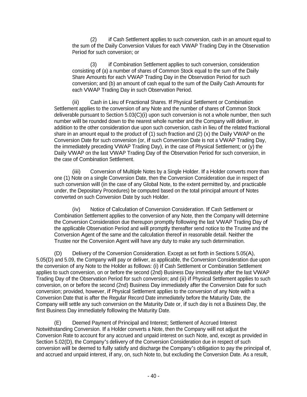 - 40 - (2) if Cash Settlement applies to such conversion, cash in an amount equal to the sum of the Daily Conversion Values for each VWAP Trading Day in the Observation Period for such conversion; or (3) if Combination Settlement applies to such conversion, consideration consisting of (a) a number of shares of Common Stock equal to the sum of the Daily Share Amounts for each VWAP Trading Day in the Observation Period for such conversion; and (b) an amount of cash equal to the sum of the Daily Cash Amounts for each VWAP Trading Day in such Observation Period. (ii) Cash in Lieu of Fractional Shares. If Physical Settlement or Combination Settlement applies to the conversion of any Note and the number of shares of Common Stock deliverable pursuant to Section 5.03(C)(i) upon such conversion is not a whole number, then such number will be rounded down to the nearest whole number and the Company will deliver, in addition to the other consideration due upon such conversion, cash in lieu of the related fractional share in an amount equal to the product of (1) such fraction and (2) (x) the Daily VWAP on the Conversion Date for such conversion (or, if such Conversion Date is not a VWAP Trading Day, the immediately preceding VWAP Trading Day), in the case of Physical Settlement; or (y) the Daily VWAP on the last VWAP Trading Day of the Observation Period for such conversion, in the case of Combination Settlement. (iii) Conversion of Multiple Notes by a Single Holder. If a Holder converts more than one (1) Note on a single Conversion Date, then the Conversion Consideration due in respect of such conversion will (in the case of any Global Note, to the extent permitted by, and practicable under, the Depositary Procedures) be computed based on the total principal amount of Notes converted on such Conversion Date by such Holder. (iv) Notice of Calculation of Conversion Consideration. If Cash Settlement or Combination Settlement applies to the conversion of any Note, then the Company will determine the Conversion Consideration due thereupon promptly following the last VWAP Trading Day of the applicable Observation Period and will promptly thereafter send notice to the Trustee and the Conversion Agent of the same and the calculation thereof in reasonable detail. Neither the Trustee nor the Conversion Agent will have any duty to make any such determination. (D) Delivery of the Conversion Consideration. Except as set forth in Sections 5.05(A), 5.05(D) and 5.09, the Company will pay or deliver, as applicable, the Conversion Consideration due upon the conversion of any Note to the Holder as follows: (i) if Cash Settlement or Combination Settlement applies to such conversion, on or before the second (2nd) Business Day immediately after the last VWAP Trading Day of the Observation Period for such conversion; and (ii) if Physical Settlement applies to such conversion, on or before the second (2nd) Business Day immediately after the Conversion Date for such conversion; provided, however, if Physical Settlement applies to the conversion of any Note with a Conversion Date that is after the Regular Record Date immediately before the Maturity Date, the Company will settle any such conversion on the Maturity Date or, if such day is not a Business Day, the first Business Day immediately following the Maturity Date. (E) Deemed Payment of Principal and Interest; Settlement of Accrued Interest Notwithstanding Conversion. If a Holder converts a Note, then the Company will not adjust the Conversion Rate to account for any accrued and unpaid interest on such Note, and, except as provided in Section 5.02(D), the Company’s delivery of the Conversion Consideration due in respect of such conversion will be deemed to fully satisfy and discharge the Company’s obligation to pay the principal of, and accrued and unpaid interest, if any, on, such Note to, but excluding the Conversion Date. As a result,