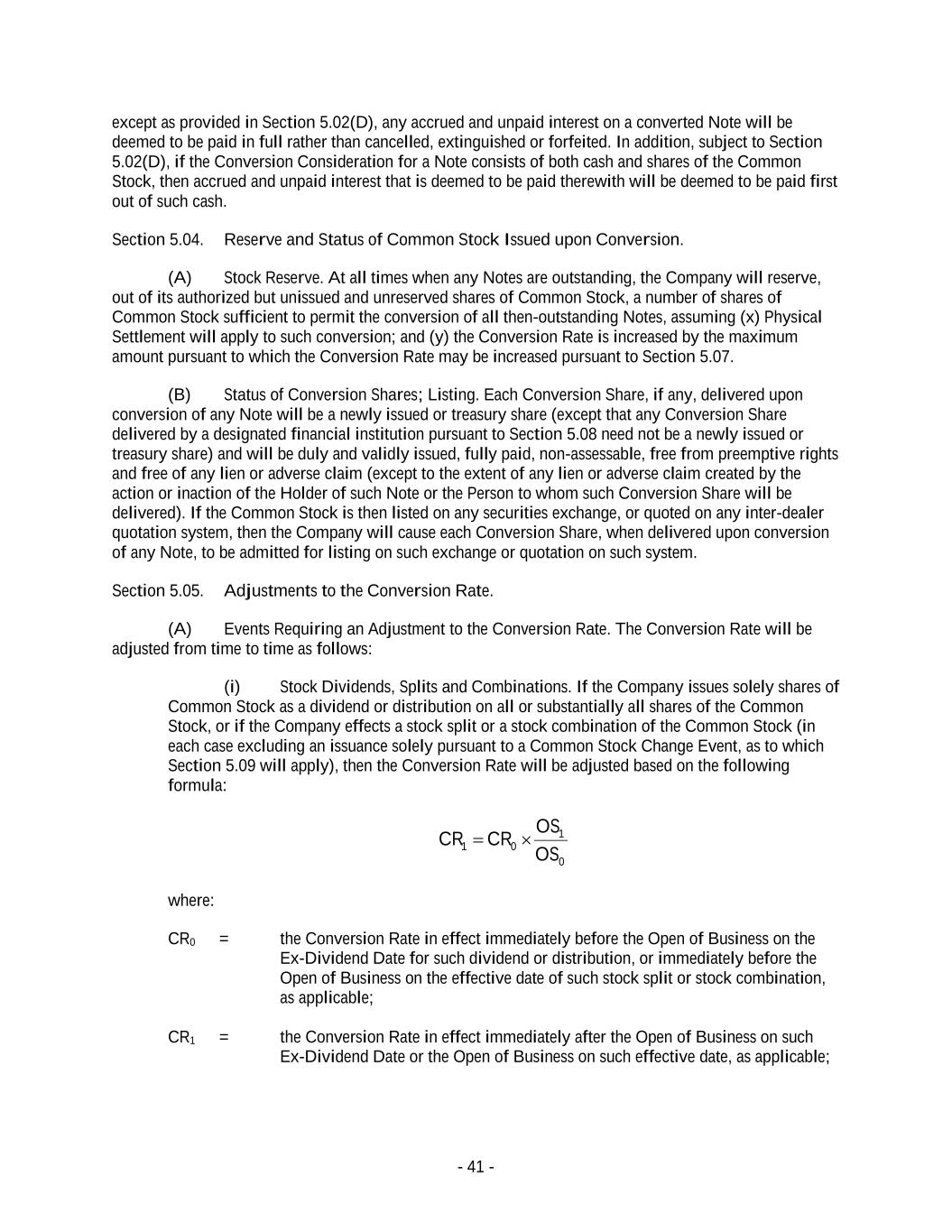 - 41 - except as provided in Section 5.02(D), any accrued and unpaid interest on a converted Note will be deemed to be paid in full rather than cancelled, extinguished or forfeited. In addition, subject to Section 5.02(D), if the Conversion Consideration for a Note consists of both cash and shares of the Common Stock, then accrued and unpaid interest that is deemed to be paid therewith will be deemed to be paid first out of such cash. Section 5.04. Reserve and Status of Common Stock Issued upon Conversion. (A) Stock Reserve. At all times when any Notes are outstanding, the Company will reserve, out of its authorized but unissued and unreserved shares of Common Stock, a number of shares of Common Stock sufficient to permit the conversion of all then-outstanding Notes, assuming (x) Physical Settlement will apply to such conversion; and (y) the Conversion Rate is increased by the maximum amount pursuant to which the Conversion Rate may be increased pursuant to Section 5.07. (B) Status of Conversion Shares; Listing. Each Conversion Share, if any, delivered upon conversion of any Note will be a newly issued or treasury share (except that any Conversion Share delivered by a designated financial institution pursuant to Section 5.08 need not be a newly issued or treasury share) and will be duly and validly issued, fully paid, non-assessable, free from preemptive rights and free of any lien or adverse claim (except to the extent of any lien or adverse claim created by the action or inaction of the Holder of such Note or the Person to whom such Conversion Share will be delivered). If the Common Stock is then listed on any securities exchange, or quoted on any inter-dealer quotation system, then the Company will cause each Conversion Share, when delivered upon conversion of any Note, to be admitted for listing on such exchange or quotation on such system. Section 5.05. Adjustments to the Conversion Rate. (A) Events Requiring an Adjustment to the Conversion Rate. The Conversion Rate will be adjusted from time to time as follows: (i) Stock Dividends, Splits and Combinations. If the Company issues solely shares of Common Stock as a dividend or distribution on all or substantially all shares of the Common Stock, or if the Company effects a stock split or a stock combination of the Common Stock (in each case excluding an issuance solely pursuant to a Common Stock Change Event, as to which Section 5.09 will apply), then the Conversion Rate will be adjusted based on the following formula: 0 1 01 OS OS CRCR  where: CR0 = the Conversion Rate in effect immediately before the Open of Business on the Ex-Dividend Date for such dividend or distribution, or immediately before the Open of Business on the effective date of such stock split or stock combination, as applicable; CR1 = the Conversion Rate in effect immediately after the Open of Business on such Ex-Dividend Date or the Open of Business on such effective date, as applicable;