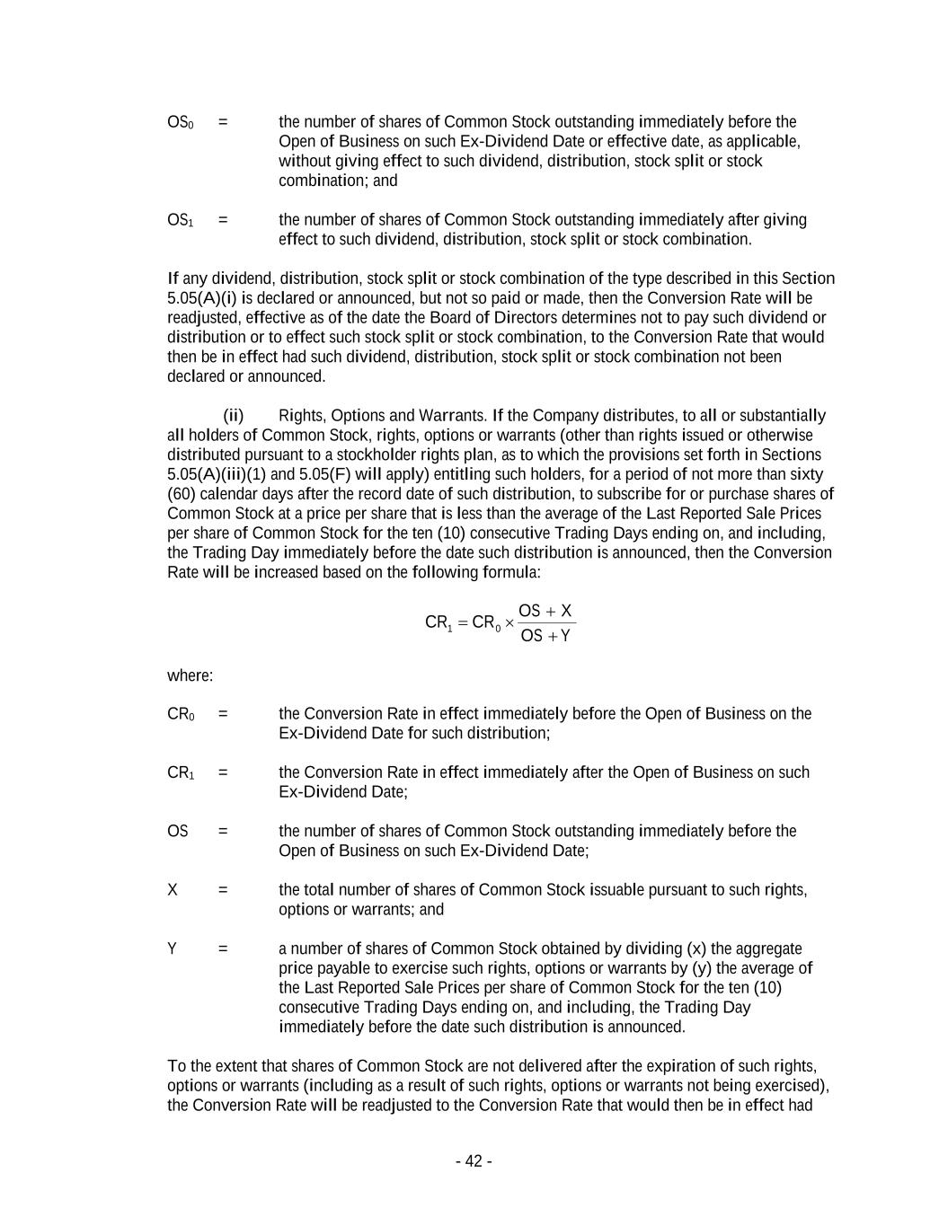 - 42 - OS0 = the number of shares of Common Stock outstanding immediately before the Open of Business on such Ex-Dividend Date or effective date, as applicable, without giving effect to such dividend, distribution, stock split or stock combination; and OS1 = the number of shares of Common Stock outstanding immediately after giving effect to such dividend, distribution, stock split or stock combination. If any dividend, distribution, stock split or stock combination of the type described in this Section 5.05(A)(i) is declared or announced, but not so paid or made, then the Conversion Rate will be readjusted, effective as of the date the Board of Directors determines not to pay such dividend or distribution or to effect such stock split or stock combination, to the Conversion Rate that would then be in effect had such dividend, distribution, stock split or stock combination not been declared or announced. (ii) Rights, Options and Warrants. If the Company distributes, to all or substantially all holders of Common Stock, rights, options or warrants (other than rights issued or otherwise distributed pursuant to a stockholder rights plan, as to which the provisions set forth in Sections 5.05(A)(iii)(1) and 5.05(F) will apply) entitling such holders, for a period of not more than sixty (60) calendar days after the record date of such distribution, to subscribe for or purchase shares of Common Stock at a price per share that is less than the average of the Last Reported Sale Prices per share of Common Stock for the ten (10) consecutive Trading Days ending on, and including, the Trading Day immediately before the date such distribution is announced, then the Conversion Rate will be increased based on the following formula: YOS XOS CRCR    01 where: CR0 = the Conversion Rate in effect immediately before the Open of Business on the Ex-Dividend Date for such distribution; CR1 = the Conversion Rate in effect immediately after the Open of Business on such Ex-Dividend Date; OS = the number of shares of Common Stock outstanding immediately before the Open of Business on such Ex-Dividend Date; X = the total number of shares of Common Stock issuable pursuant to such rights, options or warrants; and Y = a number of shares of Common Stock obtained by dividing (x) the aggregate price payable to exercise such rights, options or warrants by (y) the average of the Last Reported Sale Prices per share of Common Stock for the ten (10) consecutive Trading Days ending on, and including, the Trading Day immediately before the date such distribution is announced. To the extent that shares of Common Stock are not delivered after the expiration of such rights, options or warrants (including as a result of such rights, options or warrants not being exercised), the Conversion Rate will be readjusted to the Conversion Rate that would then be in effect had