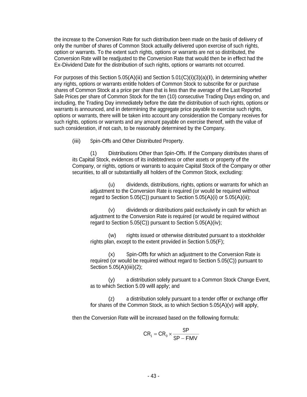 - 43 - the increase to the Conversion Rate for such distribution been made on the basis of delivery of only the number of shares of Common Stock actually delivered upon exercise of such rights, option or warrants. To the extent such rights, options or warrants are not so distributed, the Conversion Rate will be readjusted to the Conversion Rate that would then be in effect had the Ex-Dividend Date for the distribution of such rights, options or warrants not occurred. For purposes of this Section 5.05(A)(ii) and Section 5.01(C)(i)(3)(a)(I), in determining whether any rights, options or warrants entitle holders of Common Stock to subscribe for or purchase shares of Common Stock at a price per share that is less than the average of the Last Reported Sale Prices per share of Common Stock for the ten (10) consecutive Trading Days ending on, and including, the Trading Day immediately before the date the distribution of such rights, options or warrants is announced, and in determining the aggregate price payable to exercise such rights, options or warrants, there will be taken into account any consideration the Company receives for such rights, options or warrants and any amount payable on exercise thereof, with the value of such consideration, if not cash, to be reasonably determined by the Company. (iii) Spin-Offs and Other Distributed Property. (1) Distributions Other than Spin-Offs. If the Company distributes shares of its Capital Stock, evidences of its indebtedness or other assets or property of the Company, or rights, options or warrants to acquire Capital Stock of the Company or other securities, to all or substantially all holders of the Common Stock, excluding: (u) dividends, distributions, rights, options or warrants for which an adjustment to the Conversion Rate is required (or would be required without regard to Section 5.05(C)) pursuant to Section 5.05(A)(i) or 5.05(A)(ii); (v) dividends or distributions paid exclusively in cash for which an adjustment to the Conversion Rate is required (or would be required without regard to Section 5.05(C)) pursuant to Section 5.05(A)(iv); (w) rights issued or otherwise distributed pursuant to a stockholder rights plan, except to the extent provided in Section 5.05(F); (x) Spin-Offs for which an adjustment to the Conversion Rate is required (or would be required without regard to Section 5.05(C)) pursuant to Section 5.05(A)(iii)(2); (y) a distribution solely pursuant to a Common Stock Change Event, as to which Section 5.09 will apply; and (z) a distribution solely pursuant to a tender offer or exchange offer for shares of the Common Stock, as to which Section 5.05(A)(v) will apply, then the Conversion Rate will be increased based on the following formula: FMVSP SP CRCR   01