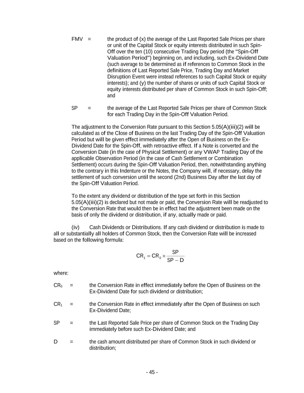 - 45 - FMV = the product of (x) the average of the Last Reported Sale Prices per share or unit of the Capital Stock or equity interests distributed in such Spin- Off over the ten (10) consecutive Trading Day period (the “Spin-Off Valuation Period”) beginning on, and including, such Ex-Dividend Date (such average to be determined as if references to Common Stock in the definitions of Last Reported Sale Price, Trading Day and Market Disruption Event were instead references to such Capital Stock or equity interests); and (y) the number of shares or units of such Capital Stock or equity interests distributed per share of Common Stock in such Spin-Off; and SP = the average of the Last Reported Sale Prices per share of Common Stock for each Trading Day in the Spin-Off Valuation Period. The adjustment to the Conversion Rate pursuant to this Section 5.05(A)(iii)(2) will be calculated as of the Close of Business on the last Trading Day of the Spin-Off Valuation Period but will be given effect immediately after the Open of Business on the Ex- Dividend Date for the Spin-Off, with retroactive effect. If a Note is converted and the Conversion Date (in the case of Physical Settlement) or any VWAP Trading Day of the applicable Observation Period (in the case of Cash Settlement or Combination Settlement) occurs during the Spin-Off Valuation Period, then, notwithstanding anything to the contrary in this Indenture or the Notes, the Company will, if necessary, delay the settlement of such conversion until the second (2nd) Business Day after the last day of the Spin-Off Valuation Period. To the extent any dividend or distribution of the type set forth in this Section 5.05(A)(iii)(2) is declared but not made or paid, the Conversion Rate will be readjusted to the Conversion Rate that would then be in effect had the adjustment been made on the basis of only the dividend or distribution, if any, actually made or paid. (iv) Cash Dividends or Distributions. If any cash dividend or distribution is made to all or substantially all holders of Common Stock, then the Conversion Rate will be increased based on the following formula: DSP SP CRCR   01 where: CR0 = the Conversion Rate in effect immediately before the Open of Business on the Ex-Dividend Date for such dividend or distribution; CR1 = the Conversion Rate in effect immediately after the Open of Business on such Ex-Dividend Date; SP = the Last Reported Sale Price per share of Common Stock on the Trading Day immediately before such Ex-Dividend Date; and D = the cash amount distributed per share of Common Stock in such dividend or distribution;
