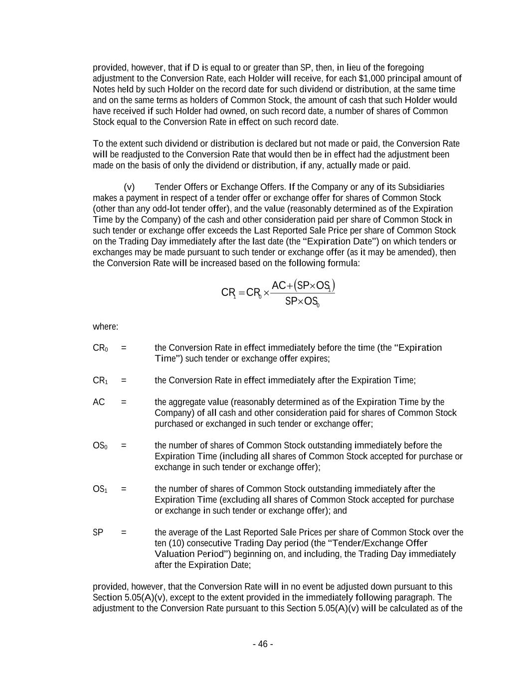 - 46 - provided, however, that if D is equal to or greater than SP, then, in lieu of the foregoing adjustment to the Conversion Rate, each Holder will receive, for each $1,000 principal amount of Notes held by such Holder on the record date for such dividend or distribution, at the same time and on the same terms as holders of Common Stock, the amount of cash that such Holder would have received if such Holder had owned, on such record date, a number of shares of Common Stock equal to the Conversion Rate in effect on such record date. To the extent such dividend or distribution is declared but not made or paid, the Conversion Rate will be readjusted to the Conversion Rate that would then be in effect had the adjustment been made on the basis of only the dividend or distribution, if any, actually made or paid. (v) Tender Offers or Exchange Offers. If the Company or any of its Subsidiaries makes a payment in respect of a tender offer or exchange offer for shares of Common Stock (other than any odd-lot tender offer), and the value (reasonably determined as of the Expiration Time by the Company) of the cash and other consideration paid per share of Common Stock in such tender or exchange offer exceeds the Last Reported Sale Price per share of Common Stock on the Trading Day immediately after the last date (the “Expiration Date”) on which tenders or exchanges may be made pursuant to such tender or exchange offer (as it may be amended), then the Conversion Rate will be increased based on the following formula:   0 1 01 OSSP OSSPAC CRCR    where: CR0 = the Conversion Rate in effect immediately before the time (the “Expiration Time”) such tender or exchange offer expires; CR1 = the Conversion Rate in effect immediately after the Expiration Time; AC = the aggregate value (reasonably determined as of the Expiration Time by the Company) of all cash and other consideration paid for shares of Common Stock purchased or exchanged in such tender or exchange offer; OS0 = the number of shares of Common Stock outstanding immediately before the Expiration Time (including all shares of Common Stock accepted for purchase or exchange in such tender or exchange offer); OS1 = the number of shares of Common Stock outstanding immediately after the Expiration Time (excluding all shares of Common Stock accepted for purchase or exchange in such tender or exchange offer); and SP = the average of the Last Reported Sale Prices per share of Common Stock over the ten (10) consecutive Trading Day period (the “Tender/Exchange Offer Valuation Period”) beginning on, and including, the Trading Day immediately after the Expiration Date; provided, however, that the Conversion Rate will in no event be adjusted down pursuant to this Section 5.05(A)(v), except to the extent provided in the immediately following paragraph. The adjustment to the Conversion Rate pursuant to this Section 5.05(A)(v) will be calculated as of the