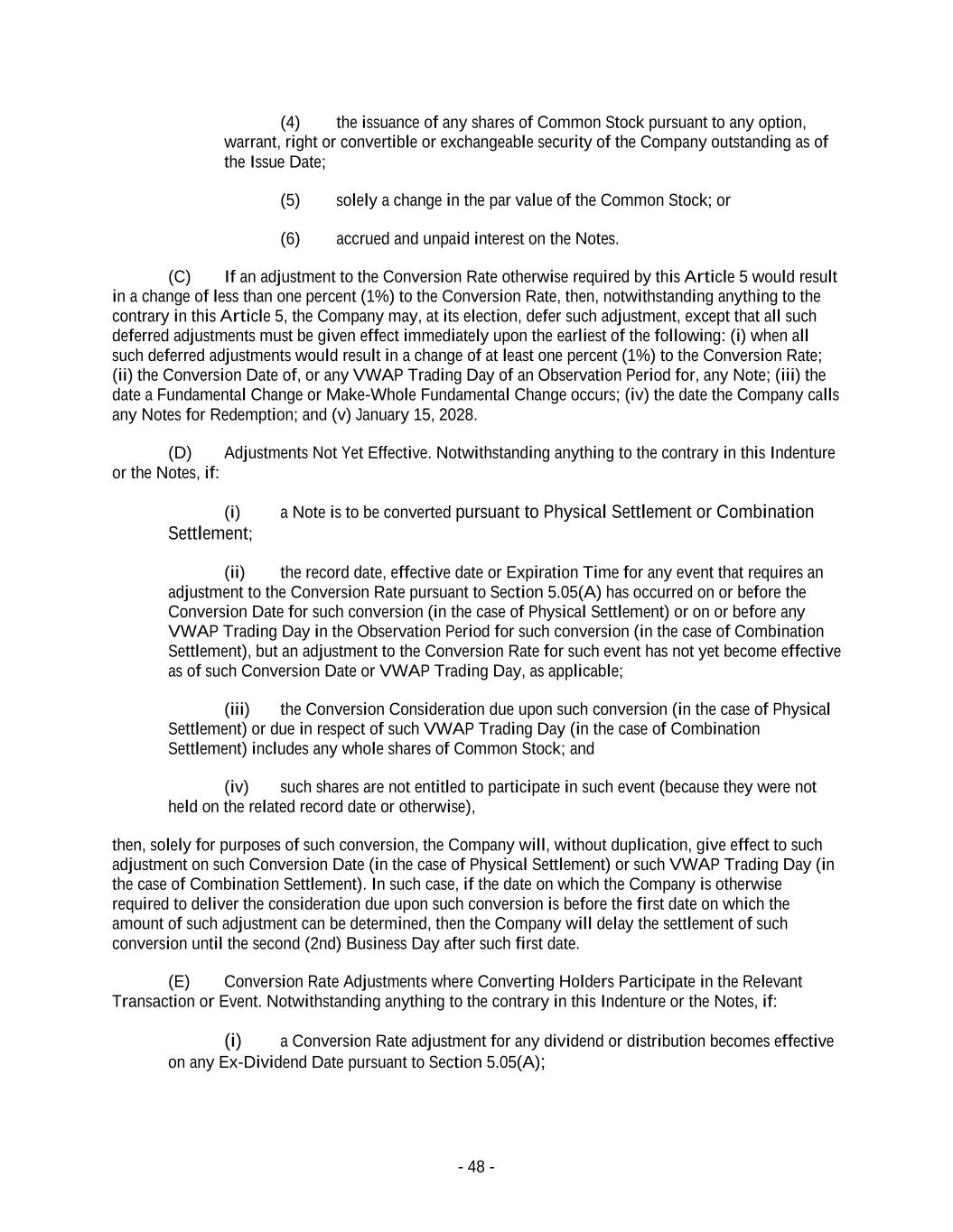 - 48 - (4) the issuance of any shares of Common Stock pursuant to any option, warrant, right or convertible or exchangeable security of the Company outstanding as of the Issue Date; (5) solely a change in the par value of the Common Stock; or (6) accrued and unpaid interest on the Notes. (C) If an adjustment to the Conversion Rate otherwise required by this Article 5 would result in a change of less than one percent (1%) to the Conversion Rate, then, notwithstanding anything to the contrary in this Article 5, the Company may, at its election, defer such adjustment, except that all such deferred adjustments must be given effect immediately upon the earliest of the following: (i) when all such deferred adjustments would result in a change of at least one percent (1%) to the Conversion Rate; (ii) the Conversion Date of, or any VWAP Trading Day of an Observation Period for, any Note; (iii) the date a Fundamental Change or Make-Whole Fundamental Change occurs; (iv) the date the Company calls any Notes for Redemption; and (v) January 15, 2028. (D) Adjustments Not Yet Effective. Notwithstanding anything to the contrary in this Indenture or the Notes, if: (i) a Note is to be converted pursuant to Physical Settlement or Combination Settlement; (ii) the record date, effective date or Expiration Time for any event that requires an adjustment to the Conversion Rate pursuant to Section 5.05(A) has occurred on or before the Conversion Date for such conversion (in the case of Physical Settlement) or on or before any VWAP Trading Day in the Observation Period for such conversion (in the case of Combination Settlement), but an adjustment to the Conversion Rate for such event has not yet become effective as of such Conversion Date or VWAP Trading Day, as applicable; (iii) the Conversion Consideration due upon such conversion (in the case of Physical Settlement) or due in respect of such VWAP Trading Day (in the case of Combination Settlement) includes any whole shares of Common Stock; and (iv) such shares are not entitled to participate in such event (because they were not held on the related record date or otherwise), then, solely for purposes of such conversion, the Company will, without duplication, give effect to such adjustment on such Conversion Date (in the case of Physical Settlement) or such VWAP Trading Day (in the case of Combination Settlement). In such case, if the date on which the Company is otherwise required to deliver the consideration due upon such conversion is before the first date on which the amount of such adjustment can be determined, then the Company will delay the settlement of such conversion until the second (2nd) Business Day after such first date. (E) Conversion Rate Adjustments where Converting Holders Participate in the Relevant Transaction or Event. Notwithstanding anything to the contrary in this Indenture or the Notes, if: (i) a Conversion Rate adjustment for any dividend or distribution becomes effective on any Ex-Dividend Date pursuant to Section 5.05(A);