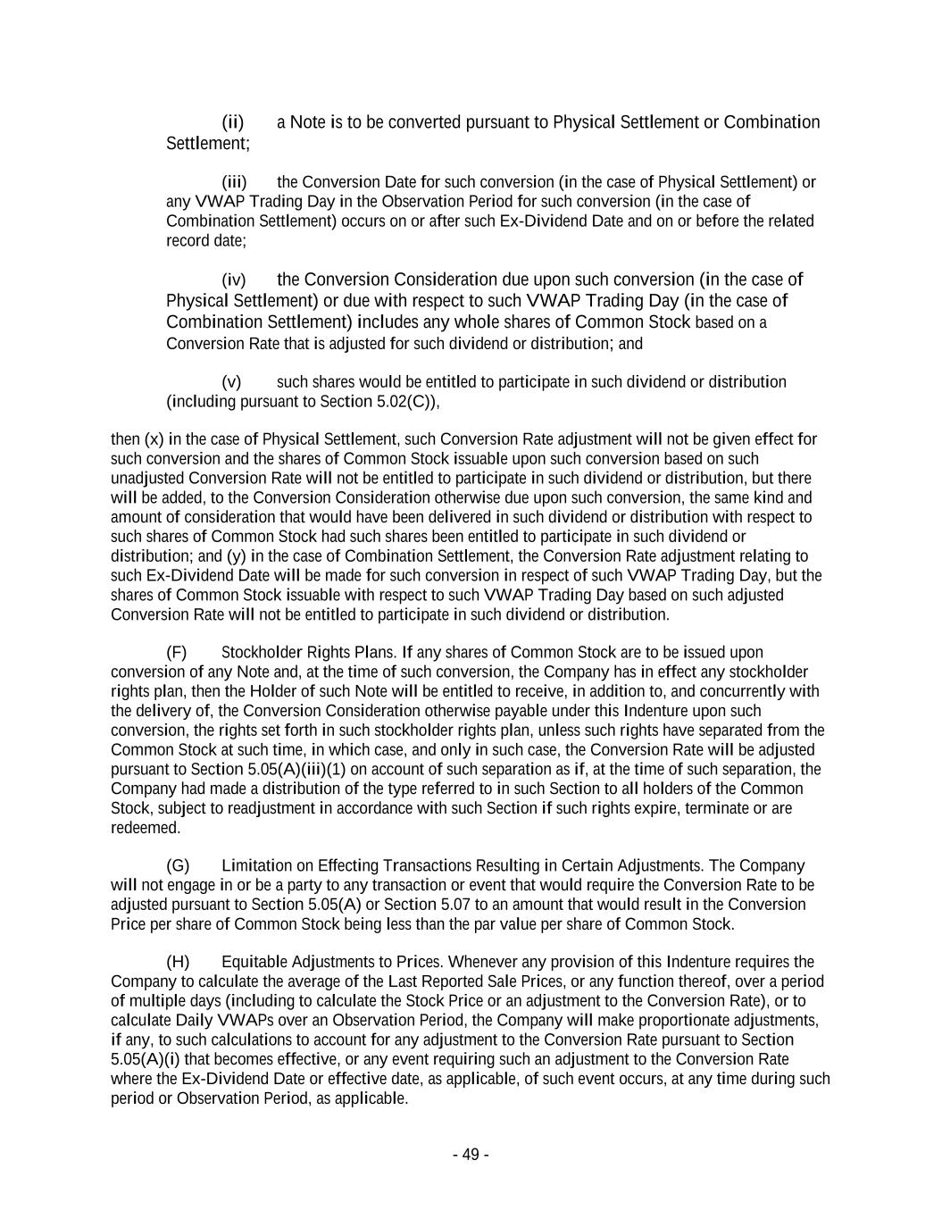 - 49 - (ii) a Note is to be converted pursuant to Physical Settlement or Combination Settlement; (iii) the Conversion Date for such conversion (in the case of Physical Settlement) or any VWAP Trading Day in the Observation Period for such conversion (in the case of Combination Settlement) occurs on or after such Ex-Dividend Date and on or before the related record date; (iv) the Conversion Consideration due upon such conversion (in the case of Physical Settlement) or due with respect to such VWAP Trading Day (in the case of Combination Settlement) includes any whole shares of Common Stock based on a Conversion Rate that is adjusted for such dividend or distribution; and (v) such shares would be entitled to participate in such dividend or distribution (including pursuant to Section 5.02(C)), then (x) in the case of Physical Settlement, such Conversion Rate adjustment will not be given effect for such conversion and the shares of Common Stock issuable upon such conversion based on such unadjusted Conversion Rate will not be entitled to participate in such dividend or distribution, but there will be added, to the Conversion Consideration otherwise due upon such conversion, the same kind and amount of consideration that would have been delivered in such dividend or distribution with respect to such shares of Common Stock had such shares been entitled to participate in such dividend or distribution; and (y) in the case of Combination Settlement, the Conversion Rate adjustment relating to such Ex-Dividend Date will be made for such conversion in respect of such VWAP Trading Day, but the shares of Common Stock issuable with respect to such VWAP Trading Day based on such adjusted Conversion Rate will not be entitled to participate in such dividend or distribution. (F) Stockholder Rights Plans. If any shares of Common Stock are to be issued upon conversion of any Note and, at the time of such conversion, the Company has in effect any stockholder rights plan, then the Holder of such Note will be entitled to receive, in addition to, and concurrently with the delivery of, the Conversion Consideration otherwise payable under this Indenture upon such conversion, the rights set forth in such stockholder rights plan, unless such rights have separated from the Common Stock at such time, in which case, and only in such case, the Conversion Rate will be adjusted pursuant to Section 5.05(A)(iii)(1) on account of such separation as if, at the time of such separation, the Company had made a distribution of the type referred to in such Section to all holders of the Common Stock, subject to readjustment in accordance with such Section if such rights expire, terminate or are redeemed. (G) Limitation on Effecting Transactions Resulting in Certain Adjustments. The Company will not engage in or be a party to any transaction or event that would require the Conversion Rate to be adjusted pursuant to Section 5.05(A) or Section 5.07 to an amount that would result in the Conversion Price per share of Common Stock being less than the par value per share of Common Stock. (H) Equitable Adjustments to Prices. Whenever any provision of this Indenture requires the Company to calculate the average of the Last Reported Sale Prices, or any function thereof, over a period of multiple days (including to calculate the Stock Price or an adjustment to the Conversion Rate), or to calculate Daily VWAPs over an Observation Period, the Company will make proportionate adjustments, if any, to such calculations to account for any adjustment to the Conversion Rate pursuant to Section 5.05(A)(i) that becomes effective, or any event requiring such an adjustment to the Conversion Rate where the Ex-Dividend Date or effective date, as applicable, of such event occurs, at any time during such period or Observation Period, as applicable.
