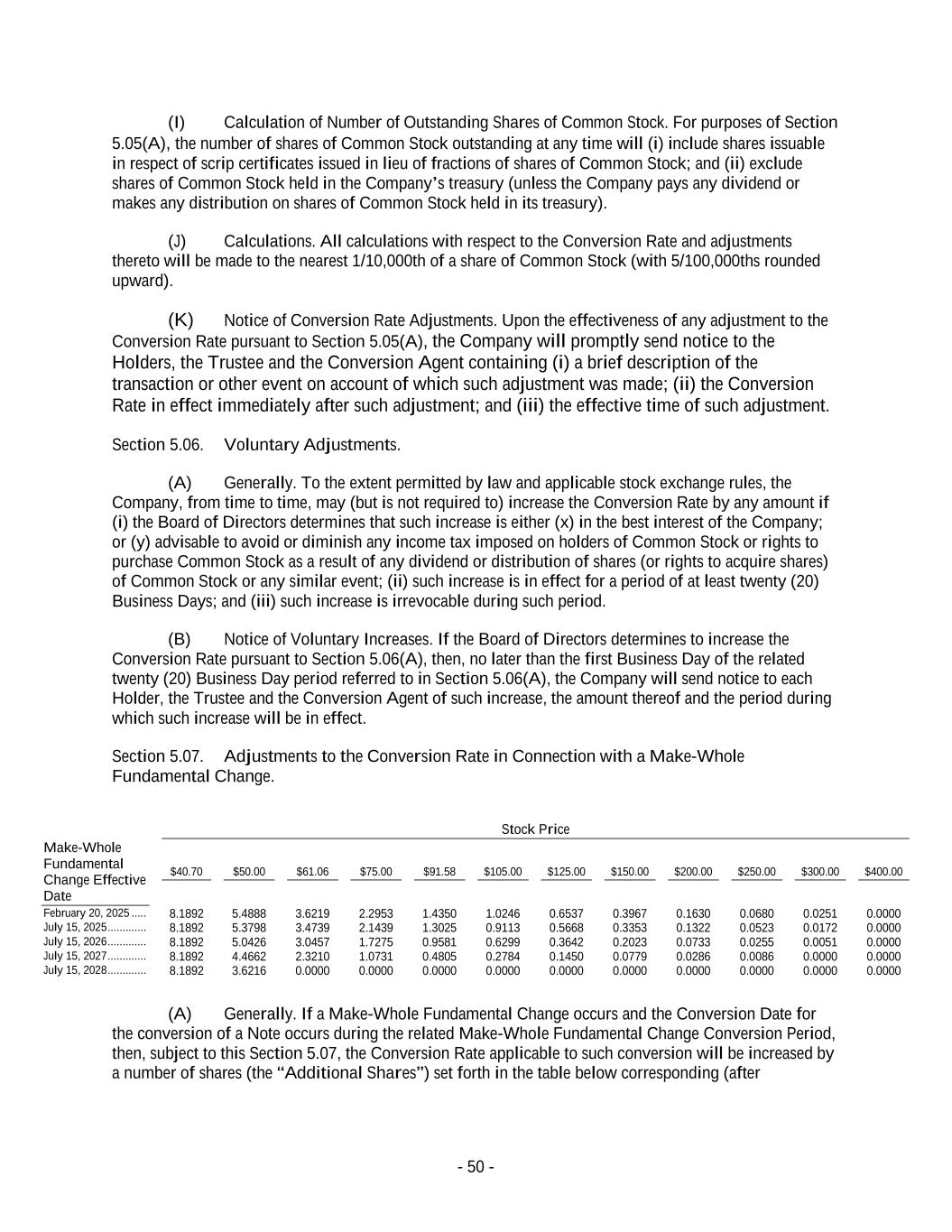 - 50 - (I) Calculation of Number of Outstanding Shares of Common Stock. For purposes of Section 5.05(A), the number of shares of Common Stock outstanding at any time will (i) include shares issuable in respect of scrip certificates issued in lieu of fractions of shares of Common Stock; and (ii) exclude shares of Common Stock held in the Company’s treasury (unless the Company pays any dividend or makes any distribution on shares of Common Stock held in its treasury). (J) Calculations. All calculations with respect to the Conversion Rate and adjustments thereto will be made to the nearest 1/10,000th of a share of Common Stock (with 5/100,000ths rounded upward). (K) Notice of Conversion Rate Adjustments. Upon the effectiveness of any adjustment to the Conversion Rate pursuant to Section 5.05(A), the Company will promptly send notice to the Holders, the Trustee and the Conversion Agent containing (i) a brief description of the transaction or other event on account of which such adjustment was made; (ii) the Conversion Rate in effect immediately after such adjustment; and (iii) the effective time of such adjustment. Section 5.06. Voluntary Adjustments. (A) Generally. To the extent permitted by law and applicable stock exchange rules, the Company, from time to time, may (but is not required to) increase the Conversion Rate by any amount if (i) the Board of Directors determines that such increase is either (x) in the best interest of the Company; or (y) advisable to avoid or diminish any income tax imposed on holders of Common Stock or rights to purchase Common Stock as a result of any dividend or distribution of shares (or rights to acquire shares) of Common Stock or any similar event; (ii) such increase is in effect for a period of at least twenty (20) Business Days; and (iii) such increase is irrevocable during such period. (B) Notice of Voluntary Increases. If the Board of Directors determines to increase the Conversion Rate pursuant to Section 5.06(A), then, no later than the first Business Day of the related twenty (20) Business Day period referred to in Section 5.06(A), the Company will send notice to each Holder, the Trustee and the Conversion Agent of such increase, the amount thereof and the period during which such increase will be in effect. Section 5.07. Adjustments to the Conversion Rate in Connection with a Make-Whole Fundamental Change. (A) Generally. If a Make-Whole Fundamental Change occurs and the Conversion Date for the conversion of a Note occurs during the related Make-Whole Fundamental Change Conversion Period, then, subject to this Section 5.07, the Conversion Rate applicable to such conversion will be increased by a number of shares (the “Additional Shares”) set forth in the table below corresponding (after Stock Price Make-Whole Fundamental Change Effective Date $40.70 $50.00 $61.06 $75.00 $91.58 $105.00 $125.00 $150.00 $200.00 $250.00 $300.00 $400.00 February 20, 2025 ..... 8.1892 5.4888 3.6219 2.2953 1.4350 1.0246 0.6537 0.3967 0.1630 0.0680 0.0251 0.0000 July 15, 2025 ............. 8.1892 5.3798 3.4739 2.1439 1.3025 0.9113 0.5668 0.3353 0.1322 0.0523 0.0172 0.0000 July 15, 2026 ............. 8.1892 5.0426 3.0457 1.7275 0.9581 0.6299 0.3642 0.2023 0.0733 0.0255 0.0051 0.0000 July 15, 2027 ............. 8.1892 4.4662 2.3210 1.0731 0.4805 0.2784 0.1450 0.0779 0.0286 0.0086 0.0000 0.0000 July 15, 2028 ............. 8.1892 3.6216 0.0000 0.0000 0.0000 0.0000 0.0000 0.0000 0.0000 0.0000 0.0000 0.0000