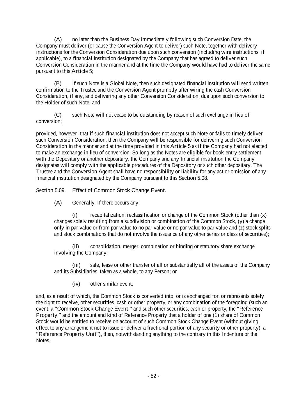 - 52 - (A) no later than the Business Day immediately following such Conversion Date, the Company must deliver (or cause the Conversion Agent to deliver) such Note, together with delivery instructions for the Conversion Consideration due upon such conversion (including wire instructions, if applicable), to a financial institution designated by the Company that has agreed to deliver such Conversion Consideration in the manner and at the time the Company would have had to deliver the same pursuant to this Article 5; (B) if such Note is a Global Note, then such designated financial institution will send written confirmation to the Trustee and the Conversion Agent promptly after wiring the cash Conversion Consideration, if any, and delivering any other Conversion Consideration, due upon such conversion to the Holder of such Note; and (C) such Note will not cease to be outstanding by reason of such exchange in lieu of conversion; provided, however, that if such financial institution does not accept such Note or fails to timely deliver such Conversion Consideration, then the Company will be responsible for delivering such Conversion Consideration in the manner and at the time provided in this Article 5 as if the Company had not elected to make an exchange in lieu of conversion. So long as the Notes are eligible for book-entry settlement with the Depositary or another depositary, the Company and any financial institution the Company designates will comply with the applicable procedures of the Depository or such other depositary. The Trustee and the Conversion Agent shall have no responsibility or liability for any act or omission of any financial institution designated by the Company pursuant to this Section 5.08. Section 5.09. Effect of Common Stock Change Event. (A) Generally. If there occurs any: (i) recapitalization, reclassification or change of the Common Stock (other than (x) changes solely resulting from a subdivision or combination of the Common Stock, (y) a change only in par value or from par value to no par value or no par value to par value and (z) stock splits and stock combinations that do not involve the issuance of any other series or class of securities); (ii) consolidation, merger, combination or binding or statutory share exchange involving the Company; (iii) sale, lease or other transfer of all or substantially all of the assets of the Company and its Subsidiaries, taken as a whole, to any Person; or (iv) other similar event, and, as a result of which, the Common Stock is converted into, or is exchanged for, or represents solely the right to receive, other securities, cash or other property, or any combination of the foregoing (such an event, a “Common Stock Change Event,” and such other securities, cash or property, the “Reference Property,” and the amount and kind of Reference Property that a holder of one (1) share of Common Stock would be entitled to receive on account of such Common Stock Change Event (without giving effect to any arrangement not to issue or deliver a fractional portion of any security or other property), a “Reference Property Unit”), then, notwithstanding anything to the contrary in this Indenture or the Notes,
