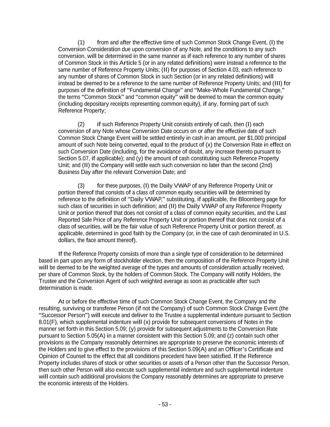 - 53 - (1) from and after the effective time of such Common Stock Change Event, (I) the Conversion Consideration due upon conversion of any Note, and the conditions to any such conversion, will be determined in the same manner as if each reference to any number of shares of Common Stock in this Article 5 (or in any related definitions) were instead a reference to the same number of Reference Property Units; (II) for purposes of Section 4.03, each reference to any number of shares of Common Stock in such Section (or in any related definitions) will instead be deemed to be a reference to the same number of Reference Property Units; and (III) for purposes of the definition of “Fundamental Change” and “Make-Whole Fundamental Change,” the terms “Common Stock” and “common equity” will be deemed to mean the common equity (including depositary receipts representing common equity), if any, forming part of such Reference Property; (2) if such Reference Property Unit consists entirely of cash, then (I) each conversion of any Note whose Conversion Date occurs on or after the effective date of such Common Stock Change Event will be settled entirely in cash in an amount, per $1,000 principal amount of such Note being converted, equal to the product of (x) the Conversion Rate in effect on such Conversion Date (including, for the avoidance of doubt, any increase thereto pursuant to Section 5.07, if applicable); and (y) the amount of cash constituting such Reference Property Unit; and (II) the Company will settle each such conversion no later than the second (2nd) Business Day after the relevant Conversion Date; and (3) for these purposes, (I) the Daily VWAP of any Reference Property Unit or portion thereof that consists of a class of common equity securities will be determined by reference to the definition of “Daily VWAP,” substituting, if applicable, the Bloomberg page for such class of securities in such definition; and (II) the Daily VWAP of any Reference Property Unit or portion thereof that does not consist of a class of common equity securities, and the Last Reported Sale Price of any Reference Property Unit or portion thereof that does not consist of a class of securities, will be the fair value of such Reference Property Unit or portion thereof, as applicable, determined in good faith by the Company (or, in the case of cash denominated in U.S. dollars, the face amount thereof). If the Reference Property consists of more than a single type of consideration to be determined based in part upon any form of stockholder election, then the composition of the Reference Property Unit will be deemed to be the weighted average of the types and amounts of consideration actually received, per share of Common Stock, by the holders of Common Stock. The Company will notify Holders, the Trustee and the Conversion Agent of such weighted average as soon as practicable after such determination is made. At or before the effective time of such Common Stock Change Event, the Company and the resulting, surviving or transferee Person (if not the Company) of such Common Stock Change Event (the “Successor Person”) will execute and deliver to the Trustee a supplemental indenture pursuant to Section 8.01(F), which supplemental indenture will (x) provide for subsequent conversions of Notes in the manner set forth in this Section 5.09; (y) provide for subsequent adjustments to the Conversion Rate pursuant to Section 5.05(A) in a manner consistent with this Section 5.09; and (z) contain such other provisions as the Company reasonably determines are appropriate to preserve the economic interests of the Holders and to give effect to the provisions of this Section 5.09(A) and an Officer’s Certificate and Opinion of Counsel to the effect that all conditions precedent have been satisfied. If the Reference Property includes shares of stock or other securities or assets of a Person other than the Successor Person, then such other Person will also execute such supplemental indenture and such supplemental indenture will contain such additional provisions the Company reasonably determines are appropriate to preserve the economic interests of the Holders.