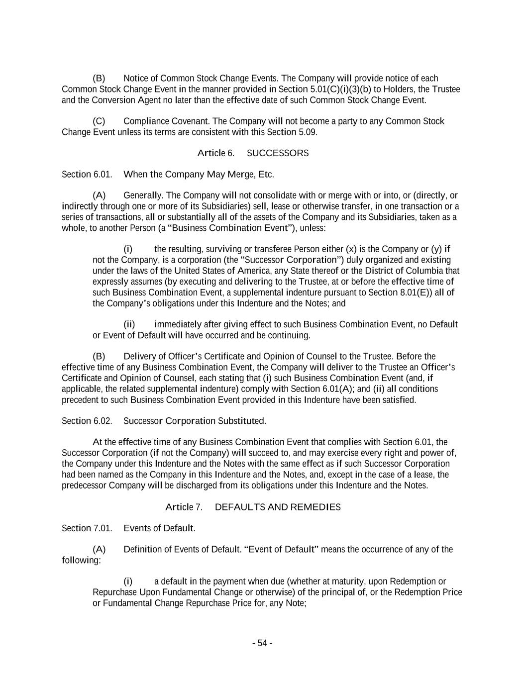 - 54 - (B) Notice of Common Stock Change Events. The Company will provide notice of each Common Stock Change Event in the manner provided in Section 5.01(C)(i)(3)(b) to Holders, the Trustee and the Conversion Agent no later than the effective date of such Common Stock Change Event. (C) Compliance Covenant. The Company will not become a party to any Common Stock Change Event unless its terms are consistent with this Section 5.09. Article 6. SUCCESSORS Section 6.01. When the Company May Merge, Etc. (A) Generally. The Company will not consolidate with or merge with or into, or (directly, or indirectly through one or more of its Subsidiaries) sell, lease or otherwise transfer, in one transaction or a series of transactions, all or substantially all of the assets of the Company and its Subsidiaries, taken as a whole, to another Person (a “Business Combination Event”), unless: (i) the resulting, surviving or transferee Person either (x) is the Company or (y) if not the Company, is a corporation (the “Successor Corporation”) duly organized and existing under the laws of the United States of America, any State thereof or the District of Columbia that expressly assumes (by executing and delivering to the Trustee, at or before the effective time of such Business Combination Event, a supplemental indenture pursuant to Section 8.01(E)) all of the Company’s obligations under this Indenture and the Notes; and (ii) immediately after giving effect to such Business Combination Event, no Default or Event of Default will have occurred and be continuing. (B) Delivery of Officer’s Certificate and Opinion of Counsel to the Trustee. Before the effective time of any Business Combination Event, the Company will deliver to the Trustee an Officer’s Certificate and Opinion of Counsel, each stating that (i) such Business Combination Event (and, if applicable, the related supplemental indenture) comply with Section 6.01(A); and (ii) all conditions precedent to such Business Combination Event provided in this Indenture have been satisfied. Section 6.02. Successor Corporation Substituted. At the effective time of any Business Combination Event that complies with Section 6.01, the Successor Corporation (if not the Company) will succeed to, and may exercise every right and power of, the Company under this Indenture and the Notes with the same effect as if such Successor Corporation had been named as the Company in this Indenture and the Notes, and, except in the case of a lease, the predecessor Company will be discharged from its obligations under this Indenture and the Notes. Article 7. DEFAULTS AND REMEDIES Section 7.01. Events of Default. (A) Definition of Events of Default. “Event of Default” means the occurrence of any of the following: (i) a default in the payment when due (whether at maturity, upon Redemption or Repurchase Upon Fundamental Change or otherwise) of the principal of, or the Redemption Price or Fundamental Change Repurchase Price for, any Note;