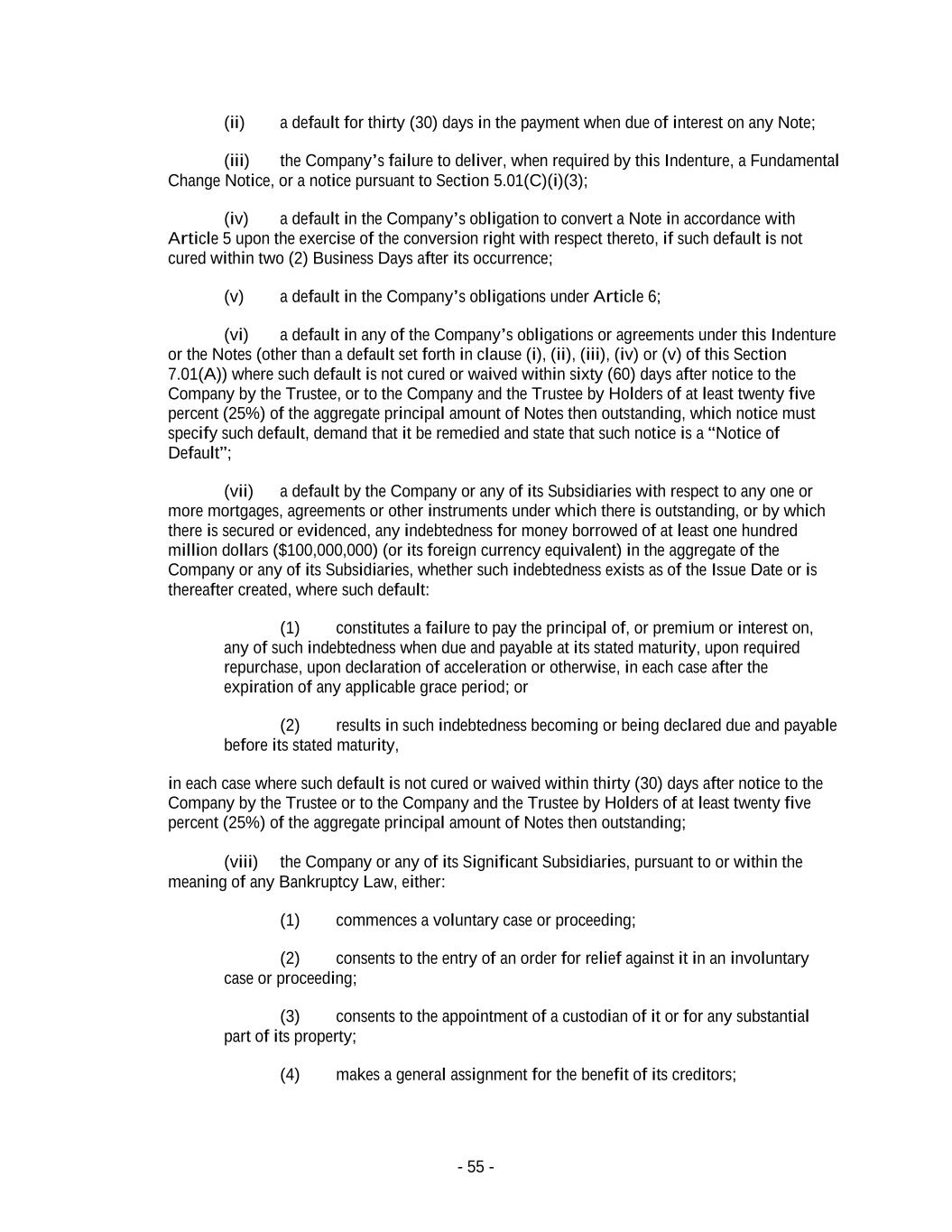 - 55 - (ii) a default for thirty (30) days in the payment when due of interest on any Note; (iii) the Company’s failure to deliver, when required by this Indenture, a Fundamental Change Notice, or a notice pursuant to Section 5.01(C)(i)(3); (iv) a default in the Company’s obligation to convert a Note in accordance with Article 5 upon the exercise of the conversion right with respect thereto, if such default is not cured within two (2) Business Days after its occurrence; (v) a default in the Company’s obligations under Article 6; (vi) a default in any of the Company’s obligations or agreements under this Indenture or the Notes (other than a default set forth in clause (i), (ii), (iii), (iv) or (v) of this Section 7.01(A)) where such default is not cured or waived within sixty (60) days after notice to the Company by the Trustee, or to the Company and the Trustee by Holders of at least twenty five percent (25%) of the aggregate principal amount of Notes then outstanding, which notice must specify such default, demand that it be remedied and state that such notice is a “Notice of Default”; (vii) a default by the Company or any of its Subsidiaries with respect to any one or more mortgages, agreements or other instruments under which there is outstanding, or by which there is secured or evidenced, any indebtedness for money borrowed of at least one hundred million dollars ($100,000,000) (or its foreign currency equivalent) in the aggregate of the Company or any of its Subsidiaries, whether such indebtedness exists as of the Issue Date or is thereafter created, where such default: (1) constitutes a failure to pay the principal of, or premium or interest on, any of such indebtedness when due and payable at its stated maturity, upon required repurchase, upon declaration of acceleration or otherwise, in each case after the expiration of any applicable grace period; or (2) results in such indebtedness becoming or being declared due and payable before its stated maturity, in each case where such default is not cured or waived within thirty (30) days after notice to the Company by the Trustee or to the Company and the Trustee by Holders of at least twenty five percent (25%) of the aggregate principal amount of Notes then outstanding; (viii) the Company or any of its Significant Subsidiaries, pursuant to or within the meaning of any Bankruptcy Law, either: (1) commences a voluntary case or proceeding; (2) consents to the entry of an order for relief against it in an involuntary case or proceeding; (3) consents to the appointment of a custodian of it or for any substantial part of its property; (4) makes a general assignment for the benefit of its creditors;