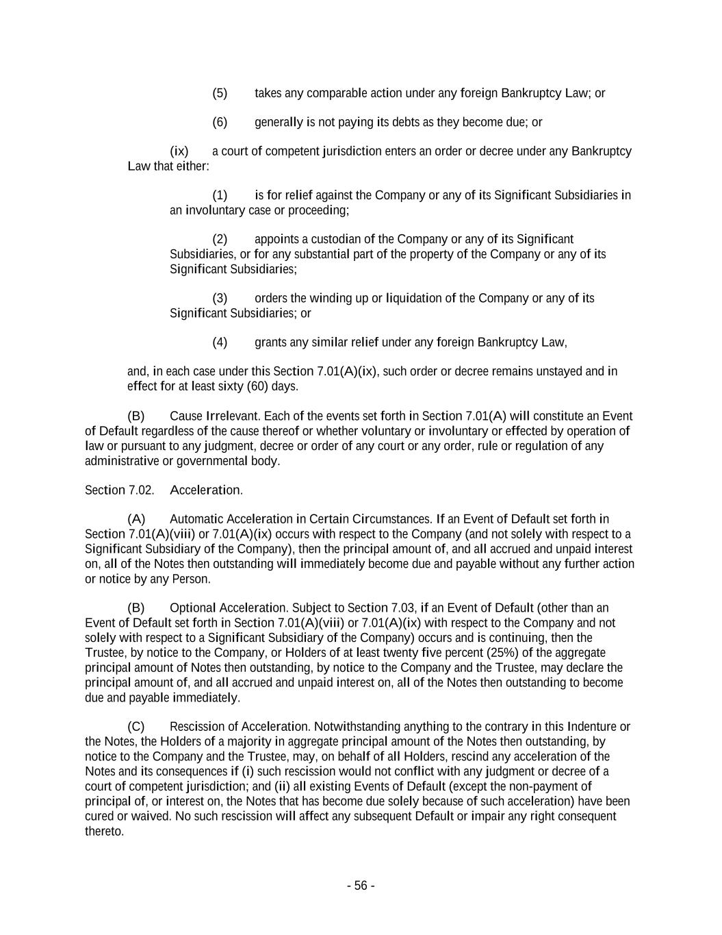 - 56 - (5) takes any comparable action under any foreign Bankruptcy Law; or (6) generally is not paying its debts as they become due; or (ix) a court of competent jurisdiction enters an order or decree under any Bankruptcy Law that either: (1) is for relief against the Company or any of its Significant Subsidiaries in an involuntary case or proceeding; (2) appoints a custodian of the Company or any of its Significant Subsidiaries, or for any substantial part of the property of the Company or any of its Significant Subsidiaries; (3) orders the winding up or liquidation of the Company or any of its Significant Subsidiaries; or (4) grants any similar relief under any foreign Bankruptcy Law, and, in each case under this Section 7.01(A)(ix), such order or decree remains unstayed and in effect for at least sixty (60) days. (B) Cause Irrelevant. Each of the events set forth in Section 7.01(A) will constitute an Event of Default regardless of the cause thereof or whether voluntary or involuntary or effected by operation of law or pursuant to any judgment, decree or order of any court or any order, rule or regulation of any administrative or governmental body. Section 7.02. Acceleration. (A) Automatic Acceleration in Certain Circumstances. If an Event of Default set forth in Section 7.01(A)(viii) or 7.01(A)(ix) occurs with respect to the Company (and not solely with respect to a Significant Subsidiary of the Company), then the principal amount of, and all accrued and unpaid interest on, all of the Notes then outstanding will immediately become due and payable without any further action or notice by any Person. (B) Optional Acceleration. Subject to Section 7.03, if an Event of Default (other than an Event of Default set forth in Section 7.01(A)(viii) or 7.01(A)(ix) with respect to the Company and not solely with respect to a Significant Subsidiary of the Company) occurs and is continuing, then the Trustee, by notice to the Company, or Holders of at least twenty five percent (25%) of the aggregate principal amount of Notes then outstanding, by notice to the Company and the Trustee, may declare the principal amount of, and all accrued and unpaid interest on, all of the Notes then outstanding to become due and payable immediately. (C) Rescission of Acceleration. Notwithstanding anything to the contrary in this Indenture or the Notes, the Holders of a majority in aggregate principal amount of the Notes then outstanding, by notice to the Company and the Trustee, may, on behalf of all Holders, rescind any acceleration of the Notes and its consequences if (i) such rescission would not conflict with any judgment or decree of a court of competent jurisdiction; and (ii) all existing Events of Default (except the non-payment of principal of, or interest on, the Notes that has become due solely because of such acceleration) have been cured or waived. No such rescission will affect any subsequent Default or impair any right consequent thereto.