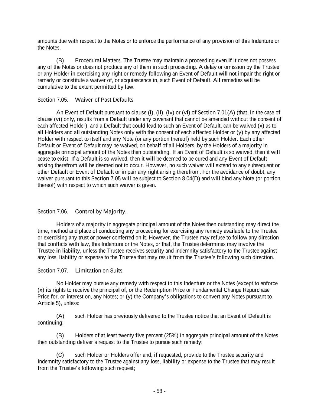 - 58 - amounts due with respect to the Notes or to enforce the performance of any provision of this Indenture or the Notes. (B) Procedural Matters. The Trustee may maintain a proceeding even if it does not possess any of the Notes or does not produce any of them in such proceeding. A delay or omission by the Trustee or any Holder in exercising any right or remedy following an Event of Default will not impair the right or remedy or constitute a waiver of, or acquiescence in, such Event of Default. All remedies will be cumulative to the extent permitted by law. Section 7.05. Waiver of Past Defaults. An Event of Default pursuant to clause (i), (ii), (iv) or (vi) of Section 7.01(A) (that, in the case of clause (vi) only, results from a Default under any covenant that cannot be amended without the consent of each affected Holder), and a Default that could lead to such an Event of Default, can be waived (x) as to all Holders and all outstanding Notes only with the consent of each affected Holder or (y) by any affected Holder with respect to itself and any Note (or any portion thereof) held by such Holder. Each other Default or Event of Default may be waived, on behalf of all Holders, by the Holders of a majority in aggregate principal amount of the Notes then outstanding. If an Event of Default is so waived, then it will cease to exist. If a Default is so waived, then it will be deemed to be cured and any Event of Default arising therefrom will be deemed not to occur. However, no such waiver will extend to any subsequent or other Default or Event of Default or impair any right arising therefrom. For the avoidance of doubt, any waiver pursuant to this Section 7.05 will be subject to Section 8.04(D) and will bind any Note (or portion thereof) with respect to which such waiver is given. Section 7.06. Control by Majority. Holders of a majority in aggregate principal amount of the Notes then outstanding may direct the time, method and place of conducting any proceeding for exercising any remedy available to the Trustee or exercising any trust or power conferred on it. However, the Trustee may refuse to follow any direction that conflicts with law, this Indenture or the Notes, or that, the Trustee determines may involve the Trustee in liability, unless the Trustee receives security and indemnity satisfactory to the Trustee against any loss, liability or expense to the Trustee that may result from the Trustee’s following such direction. Section 7.07. Limitation on Suits. No Holder may pursue any remedy with respect to this Indenture or the Notes (except to enforce (x) its rights to receive the principal of, or the Redemption Price or Fundamental Change Repurchase Price for, or interest on, any Notes; or (y) the Company’s obligations to convert any Notes pursuant to Article 5), unless: (A) such Holder has previously delivered to the Trustee notice that an Event of Default is continuing; (B) Holders of at least twenty five percent (25%) in aggregate principal amount of the Notes then outstanding deliver a request to the Trustee to pursue such remedy; (C) such Holder or Holders offer and, if requested, provide to the Trustee security and indemnity satisfactory to the Trustee against any loss, liability or expense to the Trustee that may result from the Trustee’s following such request;