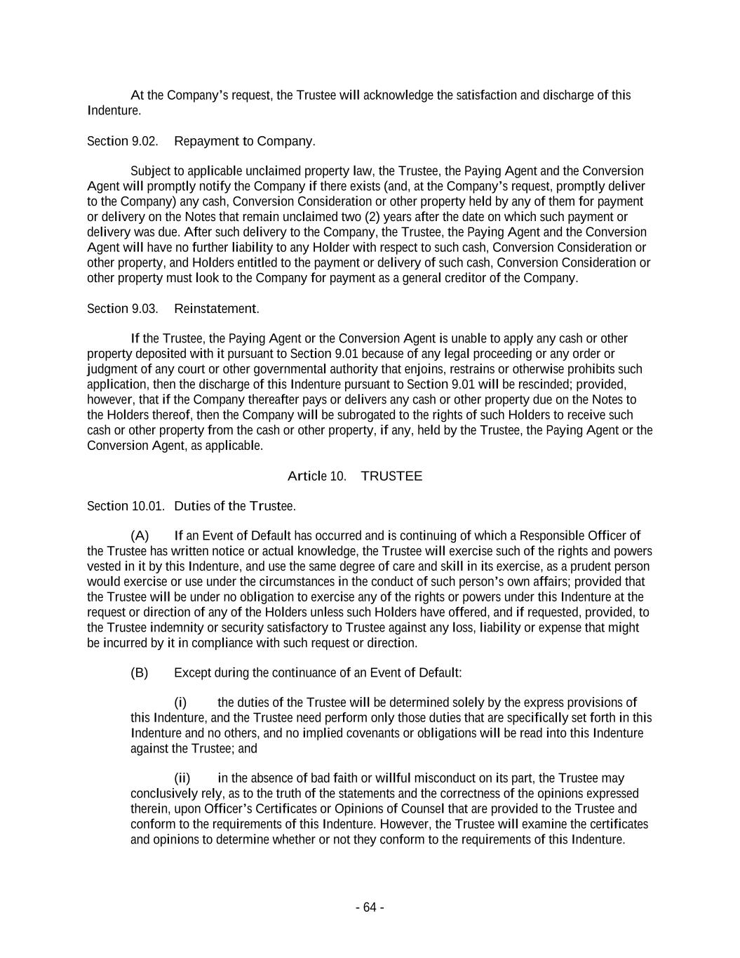 - 64 - At the Company’s request, the Trustee will acknowledge the satisfaction and discharge of this Indenture. Section 9.02. Repayment to Company. Subject to applicable unclaimed property law, the Trustee, the Paying Agent and the Conversion Agent will promptly notify the Company if there exists (and, at the Company’s request, promptly deliver to the Company) any cash, Conversion Consideration or other property held by any of them for payment or delivery on the Notes that remain unclaimed two (2) years after the date on which such payment or delivery was due. After such delivery to the Company, the Trustee, the Paying Agent and the Conversion Agent will have no further liability to any Holder with respect to such cash, Conversion Consideration or other property, and Holders entitled to the payment or delivery of such cash, Conversion Consideration or other property must look to the Company for payment as a general creditor of the Company. Section 9.03. Reinstatement. If the Trustee, the Paying Agent or the Conversion Agent is unable to apply any cash or other property deposited with it pursuant to Section 9.01 because of any legal proceeding or any order or judgment of any court or other governmental authority that enjoins, restrains or otherwise prohibits such application, then the discharge of this Indenture pursuant to Section 9.01 will be rescinded; provided, however, that if the Company thereafter pays or delivers any cash or other property due on the Notes to the Holders thereof, then the Company will be subrogated to the rights of such Holders to receive such cash or other property from the cash or other property, if any, held by the Trustee, the Paying Agent or the Conversion Agent, as applicable. Article 10. TRUSTEE Section 10.01. Duties of the Trustee. (A) If an Event of Default has occurred and is continuing of which a Responsible Officer of the Trustee has written notice or actual knowledge, the Trustee will exercise such of the rights and powers vested in it by this Indenture, and use the same degree of care and skill in its exercise, as a prudent person would exercise or use under the circumstances in the conduct of such person’s own affairs; provided that the Trustee will be under no obligation to exercise any of the rights or powers under this Indenture at the request or direction of any of the Holders unless such Holders have offered, and if requested, provided, to the Trustee indemnity or security satisfactory to Trustee against any loss, liability or expense that might be incurred by it in compliance with such request or direction. (B) Except during the continuance of an Event of Default: (i) the duties of the Trustee will be determined solely by the express provisions of this Indenture, and the Trustee need perform only those duties that are specifically set forth in this Indenture and no others, and no implied covenants or obligations will be read into this Indenture against the Trustee; and (ii) in the absence of bad faith or willful misconduct on its part, the Trustee may conclusively rely, as to the truth of the statements and the correctness of the opinions expressed therein, upon Officer’s Certificates or Opinions of Counsel that are provided to the Trustee and conform to the requirements of this Indenture. However, the Trustee will examine the certificates and opinions to determine whether or not they conform to the requirements of this Indenture.