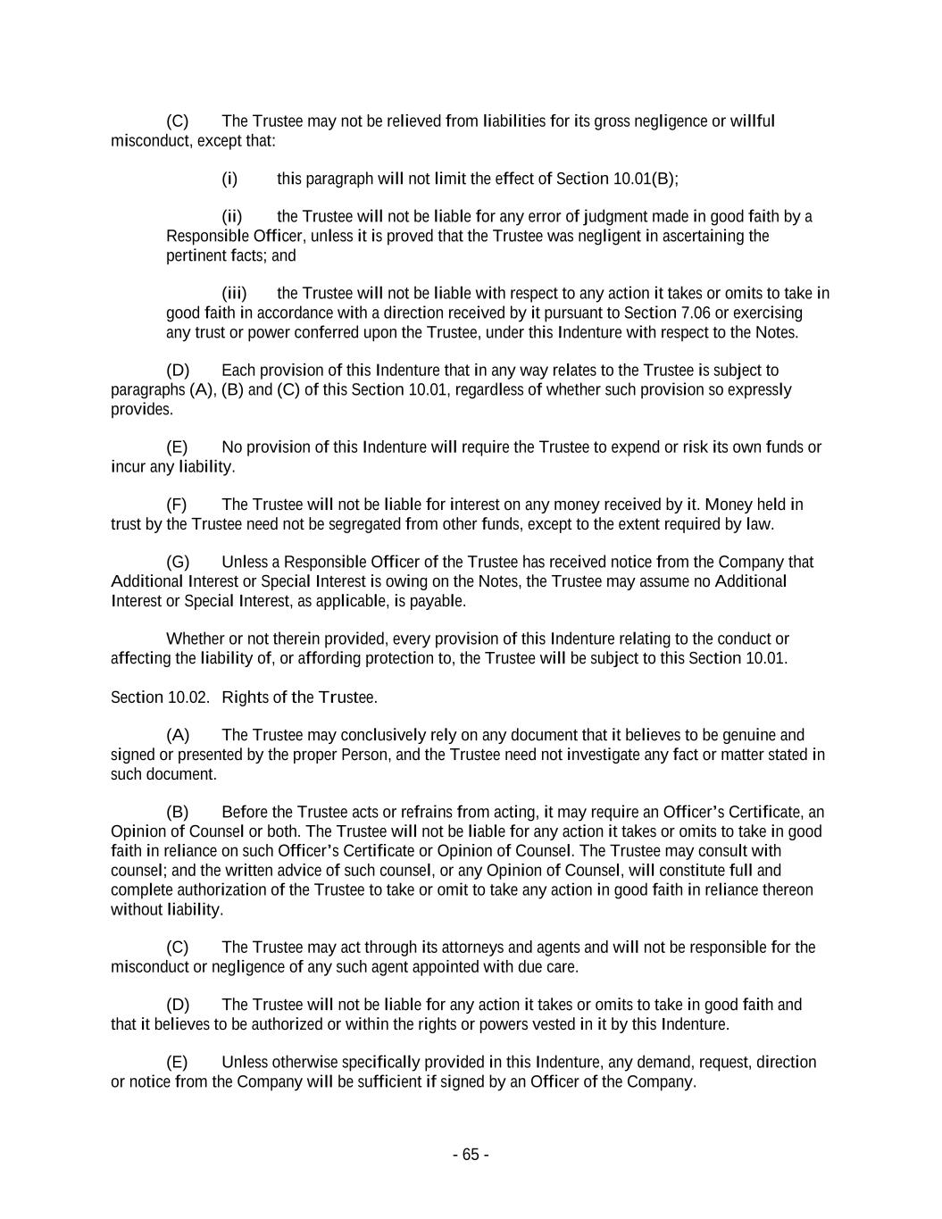 - 65 - (C) The Trustee may not be relieved from liabilities for its gross negligence or willful misconduct, except that: (i) this paragraph will not limit the effect of Section 10.01(B); (ii) the Trustee will not be liable for any error of judgment made in good faith by a Responsible Officer, unless it is proved that the Trustee was negligent in ascertaining the pertinent facts; and (iii) the Trustee will not be liable with respect to any action it takes or omits to take in good faith in accordance with a direction received by it pursuant to Section 7.06 or exercising any trust or power conferred upon the Trustee, under this Indenture with respect to the Notes. (D) Each provision of this Indenture that in any way relates to the Trustee is subject to paragraphs (A), (B) and (C) of this Section 10.01, regardless of whether such provision so expressly provides. (E) No provision of this Indenture will require the Trustee to expend or risk its own funds or incur any liability. (F) The Trustee will not be liable for interest on any money received by it. Money held in trust by the Trustee need not be segregated from other funds, except to the extent required by law. (G) Unless a Responsible Officer of the Trustee has received notice from the Company that Additional Interest or Special Interest is owing on the Notes, the Trustee may assume no Additional Interest or Special Interest, as applicable, is payable. Whether or not therein provided, every provision of this Indenture relating to the conduct or affecting the liability of, or affording protection to, the Trustee will be subject to this Section 10.01. Section 10.02. Rights of the Trustee. (A) The Trustee may conclusively rely on any document that it believes to be genuine and signed or presented by the proper Person, and the Trustee need not investigate any fact or matter stated in such document. (B) Before the Trustee acts or refrains from acting, it may require an Officer’s Certificate, an Opinion of Counsel or both. The Trustee will not be liable for any action it takes or omits to take in good faith in reliance on such Officer’s Certificate or Opinion of Counsel. The Trustee may consult with counsel; and the written advice of such counsel, or any Opinion of Counsel, will constitute full and complete authorization of the Trustee to take or omit to take any action in good faith in reliance thereon without liability. (C) The Trustee may act through its attorneys and agents and will not be responsible for the misconduct or negligence of any such agent appointed with due care. (D) The Trustee will not be liable for any action it takes or omits to take in good faith and that it believes to be authorized or within the rights or powers vested in it by this Indenture. (E) Unless otherwise specifically provided in this Indenture, any demand, request, direction or notice from the Company will be sufficient if signed by an Officer of the Company.