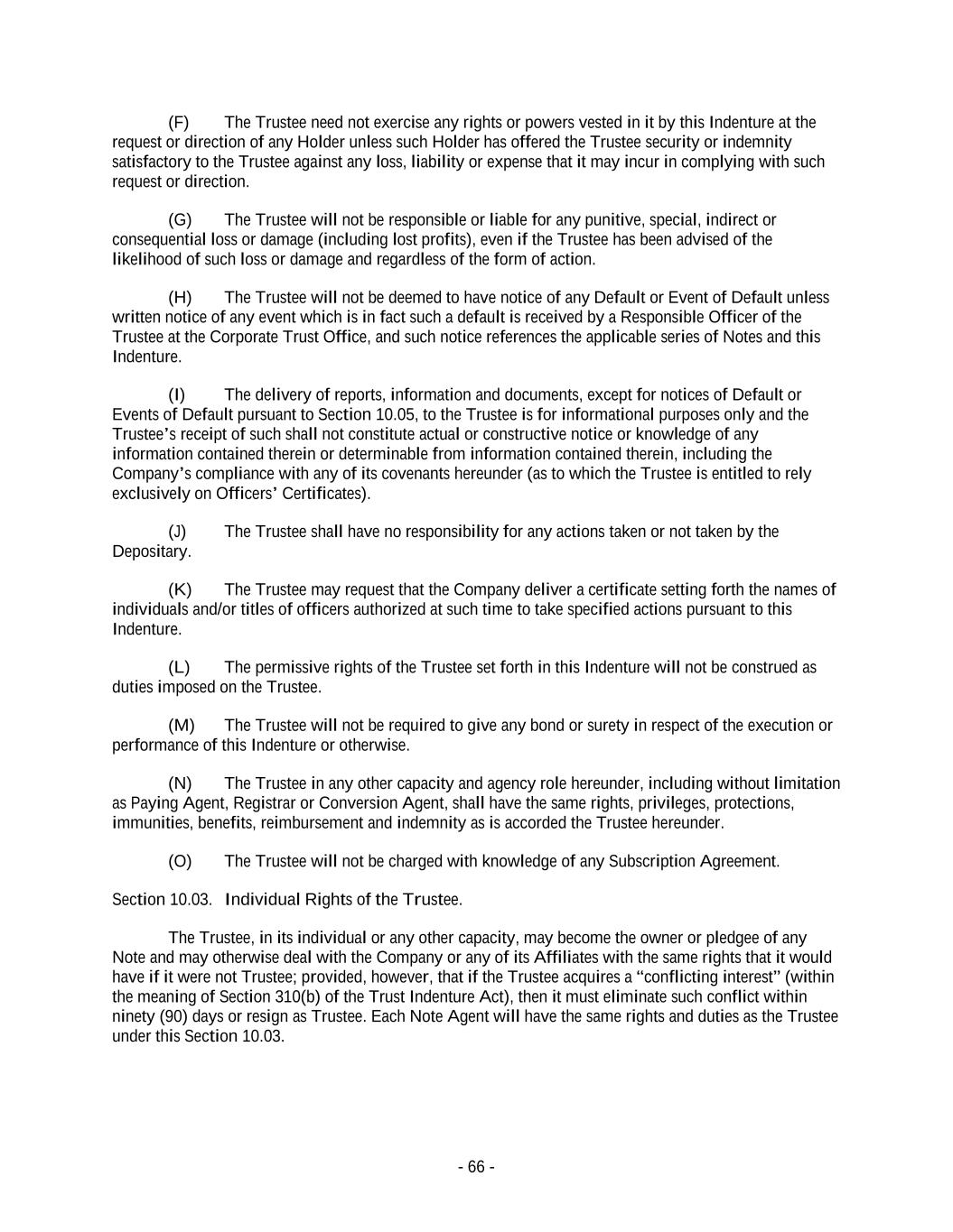 - 66 - (F) The Trustee need not exercise any rights or powers vested in it by this Indenture at the request or direction of any Holder unless such Holder has offered the Trustee security or indemnity satisfactory to the Trustee against any loss, liability or expense that it may incur in complying with such request or direction. (G) The Trustee will not be responsible or liable for any punitive, special, indirect or consequential loss or damage (including lost profits), even if the Trustee has been advised of the likelihood of such loss or damage and regardless of the form of action. (H) The Trustee will not be deemed to have notice of any Default or Event of Default unless written notice of any event which is in fact such a default is received by a Responsible Officer of the Trustee at the Corporate Trust Office, and such notice references the applicable series of Notes and this Indenture. (I) The delivery of reports, information and documents, except for notices of Default or Events of Default pursuant to Section 10.05, to the Trustee is for informational purposes only and the Trustee’s receipt of such shall not constitute actual or constructive notice or knowledge of any information contained therein or determinable from information contained therein, including the Company’s compliance with any of its covenants hereunder (as to which the Trustee is entitled to rely exclusively on Officers’ Certificates). (J) The Trustee shall have no responsibility for any actions taken or not taken by the Depositary. (K) The Trustee may request that the Company deliver a certificate setting forth the names of individuals and/or titles of officers authorized at such time to take specified actions pursuant to this Indenture. (L) The permissive rights of the Trustee set forth in this Indenture will not be construed as duties imposed on the Trustee. (M) The Trustee will not be required to give any bond or surety in respect of the execution or performance of this Indenture or otherwise. (N) The Trustee in any other capacity and agency role hereunder, including without limitation as Paying Agent, Registrar or Conversion Agent, shall have the same rights, privileges, protections, immunities, benefits, reimbursement and indemnity as is accorded the Trustee hereunder. (O) The Trustee will not be charged with knowledge of any Subscription Agreement. Section 10.03. Individual Rights of the Trustee. The Trustee, in its individual or any other capacity, may become the owner or pledgee of any Note and may otherwise deal with the Company or any of its Affiliates with the same rights that it would have if it were not Trustee; provided, however, that if the Trustee acquires a “conflicting interest” (within the meaning of Section 310(b) of the Trust Indenture Act), then it must eliminate such conflict within ninety (90) days or resign as Trustee. Each Note Agent will have the same rights and duties as the Trustee under this Section 10.03.