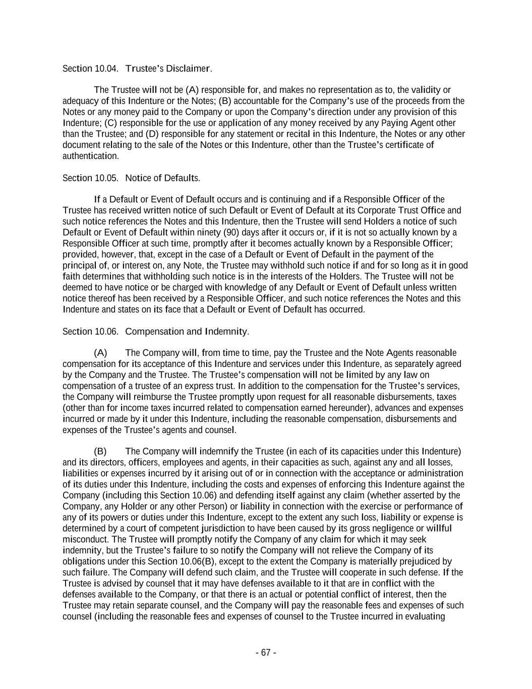 - 67 - Section 10.04. Trustee’s Disclaimer. The Trustee will not be (A) responsible for, and makes no representation as to, the validity or adequacy of this Indenture or the Notes; (B) accountable for the Company’s use of the proceeds from the Notes or any money paid to the Company or upon the Company’s direction under any provision of this Indenture; (C) responsible for the use or application of any money received by any Paying Agent other than the Trustee; and (D) responsible for any statement or recital in this Indenture, the Notes or any other document relating to the sale of the Notes or this Indenture, other than the Trustee’s certificate of authentication. Section 10.05. Notice of Defaults. If a Default or Event of Default occurs and is continuing and if a Responsible Officer of the Trustee has received written notice of such Default or Event of Default at its Corporate Trust Office and such notice references the Notes and this Indenture, then the Trustee will send Holders a notice of such Default or Event of Default within ninety (90) days after it occurs or, if it is not so actually known by a Responsible Officer at such time, promptly after it becomes actually known by a Responsible Officer; provided, however, that, except in the case of a Default or Event of Default in the payment of the principal of, or interest on, any Note, the Trustee may withhold such notice if and for so long as it in good faith determines that withholding such notice is in the interests of the Holders. The Trustee will not be deemed to have notice or be charged with knowledge of any Default or Event of Default unless written notice thereof has been received by a Responsible Officer, and such notice references the Notes and this Indenture and states on its face that a Default or Event of Default has occurred. Section 10.06. Compensation and Indemnity. (A) The Company will, from time to time, pay the Trustee and the Note Agents reasonable compensation for its acceptance of this Indenture and services under this Indenture, as separately agreed by the Company and the Trustee. The Trustee’s compensation will not be limited by any law on compensation of a trustee of an express trust. In addition to the compensation for the Trustee’s services, the Company will reimburse the Trustee promptly upon request for all reasonable disbursements, taxes (other than for income taxes incurred related to compensation earned hereunder), advances and expenses incurred or made by it under this Indenture, including the reasonable compensation, disbursements and expenses of the Trustee’s agents and counsel. (B) The Company will indemnify the Trustee (in each of its capacities under this Indenture) and its directors, officers, employees and agents, in their capacities as such, against any and all losses, liabilities or expenses incurred by it arising out of or in connection with the acceptance or administration of its duties under this Indenture, including the costs and expenses of enforcing this Indenture against the Company (including this Section 10.06) and defending itself against any claim (whether asserted by the Company, any Holder or any other Person) or liability in connection with the exercise or performance of any of its powers or duties under this Indenture, except to the extent any such loss, liability or expense is determined by a court of competent jurisdiction to have been caused by its gross negligence or willful misconduct. The Trustee will promptly notify the Company of any claim for which it may seek indemnity, but the Trustee’s failure to so notify the Company will not relieve the Company of its obligations under this Section 10.06(B), except to the extent the Company is materially prejudiced by such failure. The Company will defend such claim, and the Trustee will cooperate in such defense. If the Trustee is advised by counsel that it may have defenses available to it that are in conflict with the defenses available to the Company, or that there is an actual or potential conflict of interest, then the Trustee may retain separate counsel, and the Company will pay the reasonable fees and expenses of such counsel (including the reasonable fees and expenses of counsel to the Trustee incurred in evaluating