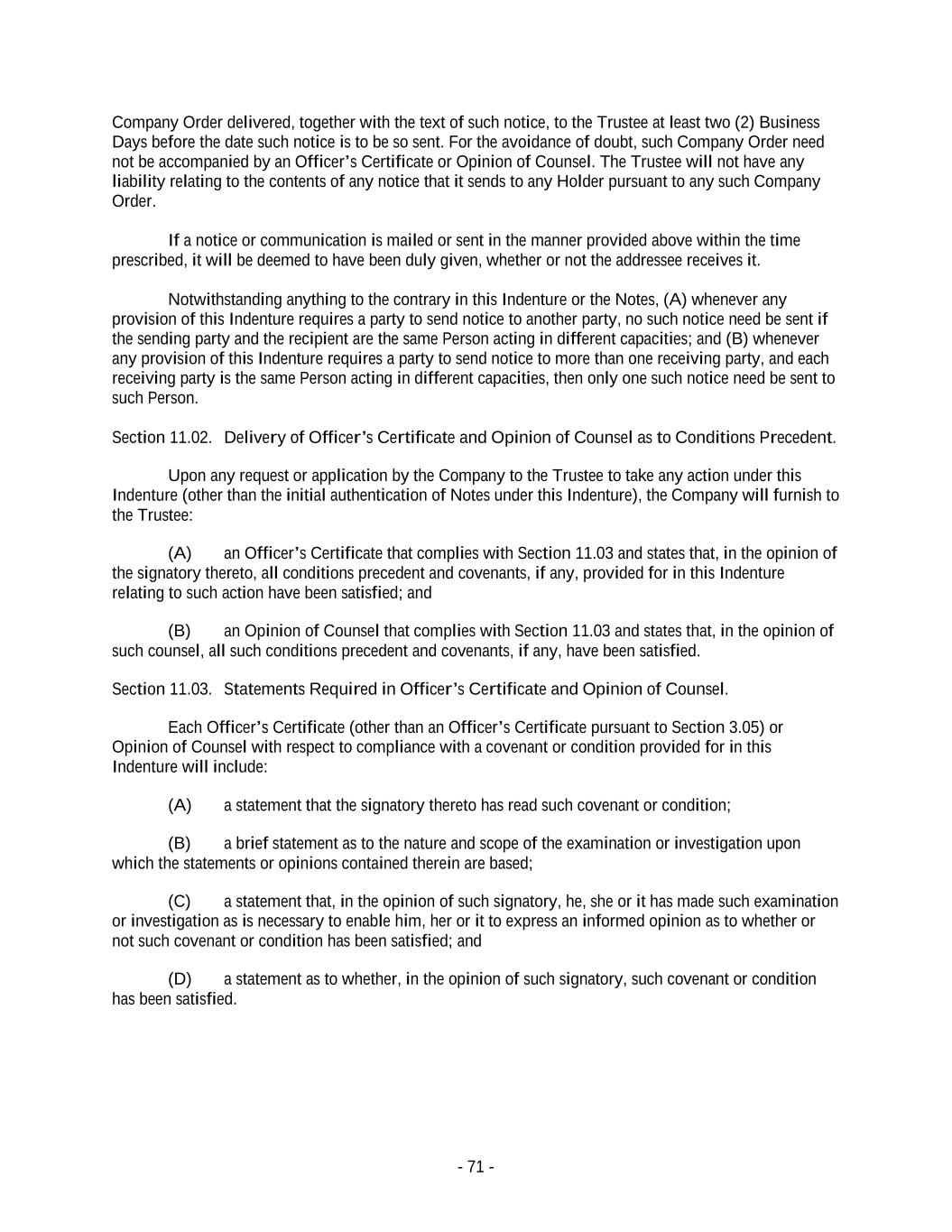 - 71 - Company Order delivered, together with the text of such notice, to the Trustee at least two (2) Business Days before the date such notice is to be so sent. For the avoidance of doubt, such Company Order need not be accompanied by an Officer’s Certificate or Opinion of Counsel. The Trustee will not have any liability relating to the contents of any notice that it sends to any Holder pursuant to any such Company Order. If a notice or communication is mailed or sent in the manner provided above within the time prescribed, it will be deemed to have been duly given, whether or not the addressee receives it. Notwithstanding anything to the contrary in this Indenture or the Notes, (A) whenever any provision of this Indenture requires a party to send notice to another party, no such notice need be sent if the sending party and the recipient are the same Person acting in different capacities; and (B) whenever any provision of this Indenture requires a party to send notice to more than one receiving party, and each receiving party is the same Person acting in different capacities, then only one such notice need be sent to such Person. Section 11.02. Delivery of Officer’s Certificate and Opinion of Counsel as to Conditions Precedent. Upon any request or application by the Company to the Trustee to take any action under this Indenture (other than the initial authentication of Notes under this Indenture), the Company will furnish to the Trustee: (A) an Officer’s Certificate that complies with Section 11.03 and states that, in the opinion of the signatory thereto, all conditions precedent and covenants, if any, provided for in this Indenture relating to such action have been satisfied; and (B) an Opinion of Counsel that complies with Section 11.03 and states that, in the opinion of such counsel, all such conditions precedent and covenants, if any, have been satisfied. Section 11.03. Statements Required in Officer’s Certificate and Opinion of Counsel. Each Officer’s Certificate (other than an Officer’s Certificate pursuant to Section 3.05) or Opinion of Counsel with respect to compliance with a covenant or condition provided for in this Indenture will include: (A) a statement that the signatory thereto has read such covenant or condition; (B) a brief statement as to the nature and scope of the examination or investigation upon which the statements or opinions contained therein are based; (C) a statement that, in the opinion of such signatory, he, she or it has made such examination or investigation as is necessary to enable him, her or it to express an informed opinion as to whether or not such covenant or condition has been satisfied; and (D) a statement as to whether, in the opinion of such signatory, such covenant or condition has been satisfied.