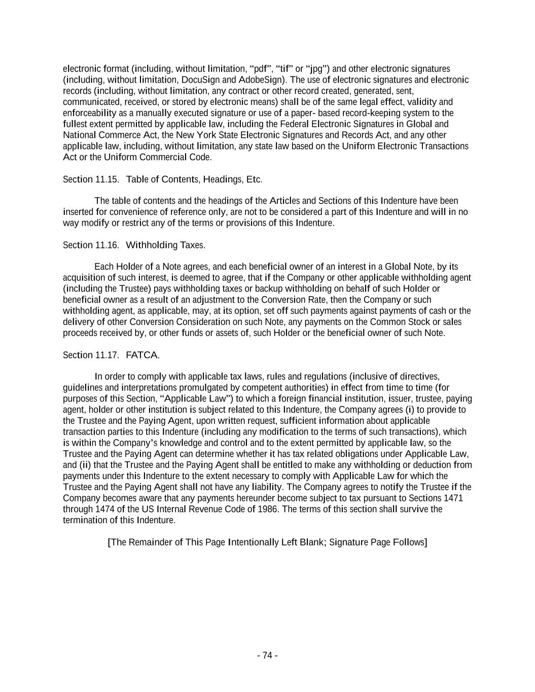 - 74 - electronic format (including, without limitation, “pdf”, “tif” or “jpg”) and other electronic signatures (including, without limitation, DocuSign and AdobeSign). The use of electronic signatures and electronic records (including, without limitation, any contract or other record created, generated, sent, communicated, received, or stored by electronic means) shall be of the same legal effect, validity and enforceability as a manually executed signature or use of a paper- based record-keeping system to the fullest extent permitted by applicable law, including the Federal Electronic Signatures in Global and National Commerce Act, the New York State Electronic Signatures and Records Act, and any other applicable law, including, without limitation, any state law based on the Uniform Electronic Transactions Act or the Uniform Commercial Code. Section 11.15. Table of Contents, Headings, Etc. The table of contents and the headings of the Articles and Sections of this Indenture have been inserted for convenience of reference only, are not to be considered a part of this Indenture and will in no way modify or restrict any of the terms or provisions of this Indenture. Section 11.16. Withholding Taxes. Each Holder of a Note agrees, and each beneficial owner of an interest in a Global Note, by its acquisition of such interest, is deemed to agree, that if the Company or other applicable withholding agent (including the Trustee) pays withholding taxes or backup withholding on behalf of such Holder or beneficial owner as a result of an adjustment to the Conversion Rate, then the Company or such withholding agent, as applicable, may, at its option, set off such payments against payments of cash or the delivery of other Conversion Consideration on such Note, any payments on the Common Stock or sales proceeds received by, or other funds or assets of, such Holder or the beneficial owner of such Note. Section 11.17. FATCA. In order to comply with applicable tax laws, rules and regulations (inclusive of directives, guidelines and interpretations promulgated by competent authorities) in effect from time to time (for purposes of this Section, “Applicable Law”) to which a foreign financial institution, issuer, trustee, paying agent, holder or other institution is subject related to this Indenture, the Company agrees (i) to provide to the Trustee and the Paying Agent, upon written request, sufficient information about applicable transaction parties to this Indenture (including any modification to the terms of such transactions), which is within the Company’s knowledge and control and to the extent permitted by applicable law, so the Trustee and the Paying Agent can determine whether it has tax related obligations under Applicable Law, and (ii) that the Trustee and the Paying Agent shall be entitled to make any withholding or deduction from payments under this Indenture to the extent necessary to comply with Applicable Law for which the Trustee and the Paying Agent shall not have any liability. The Company agrees to notify the Trustee if the Company becomes aware that any payments hereunder become subject to tax pursuant to Sections 1471 through 1474 of the US Internal Revenue Code of 1986. The terms of this section shall survive the termination of this Indenture. [The Remainder of This Page Intentionally Left Blank; Signature Page Follows]